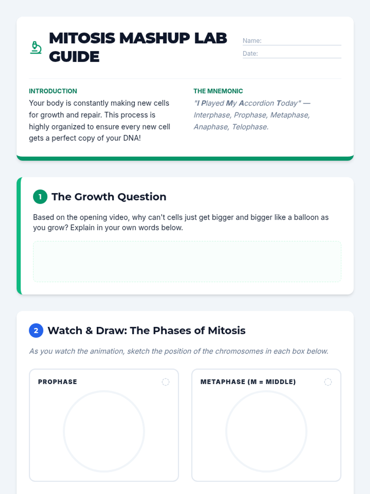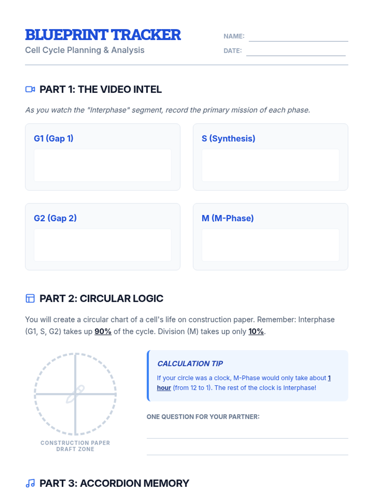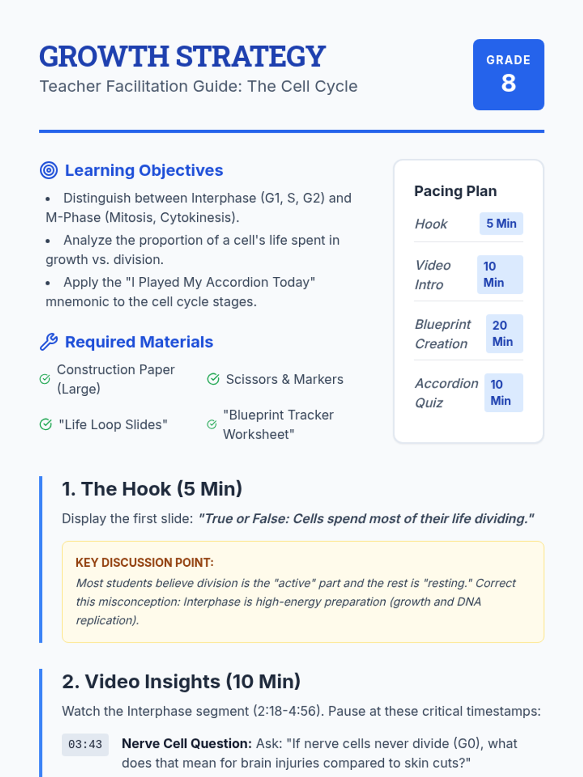 A comprehensive lesson exploring the stages of the cell cycle, focusing on the distinction between Interphase (G1, S, G2) and M-Phase. Students use a video guide and creative modeling to understand cellular growth and division.