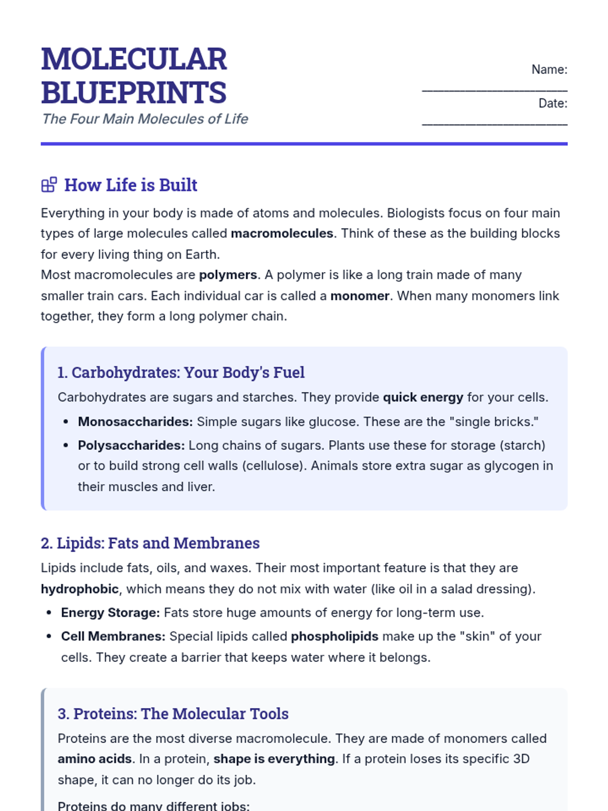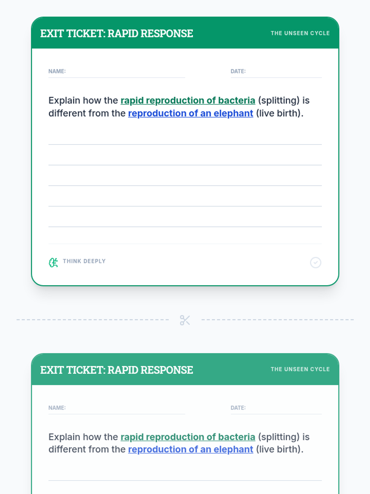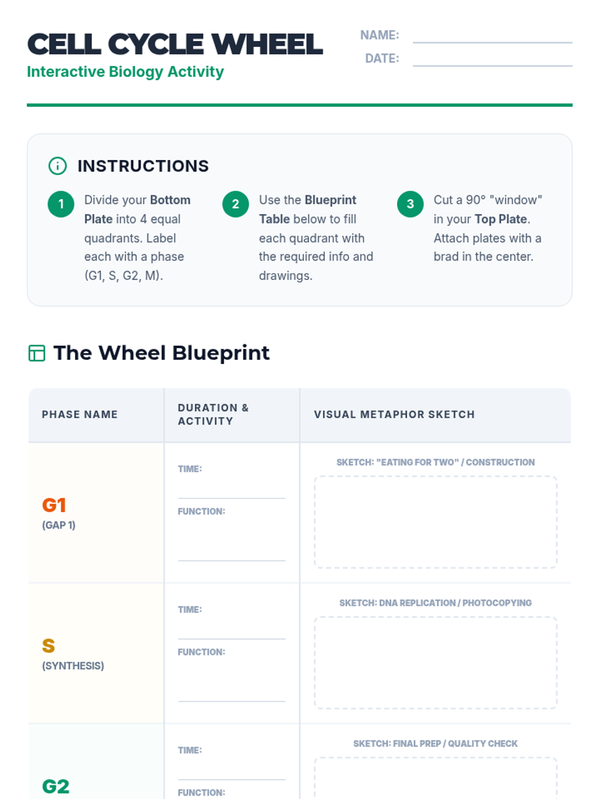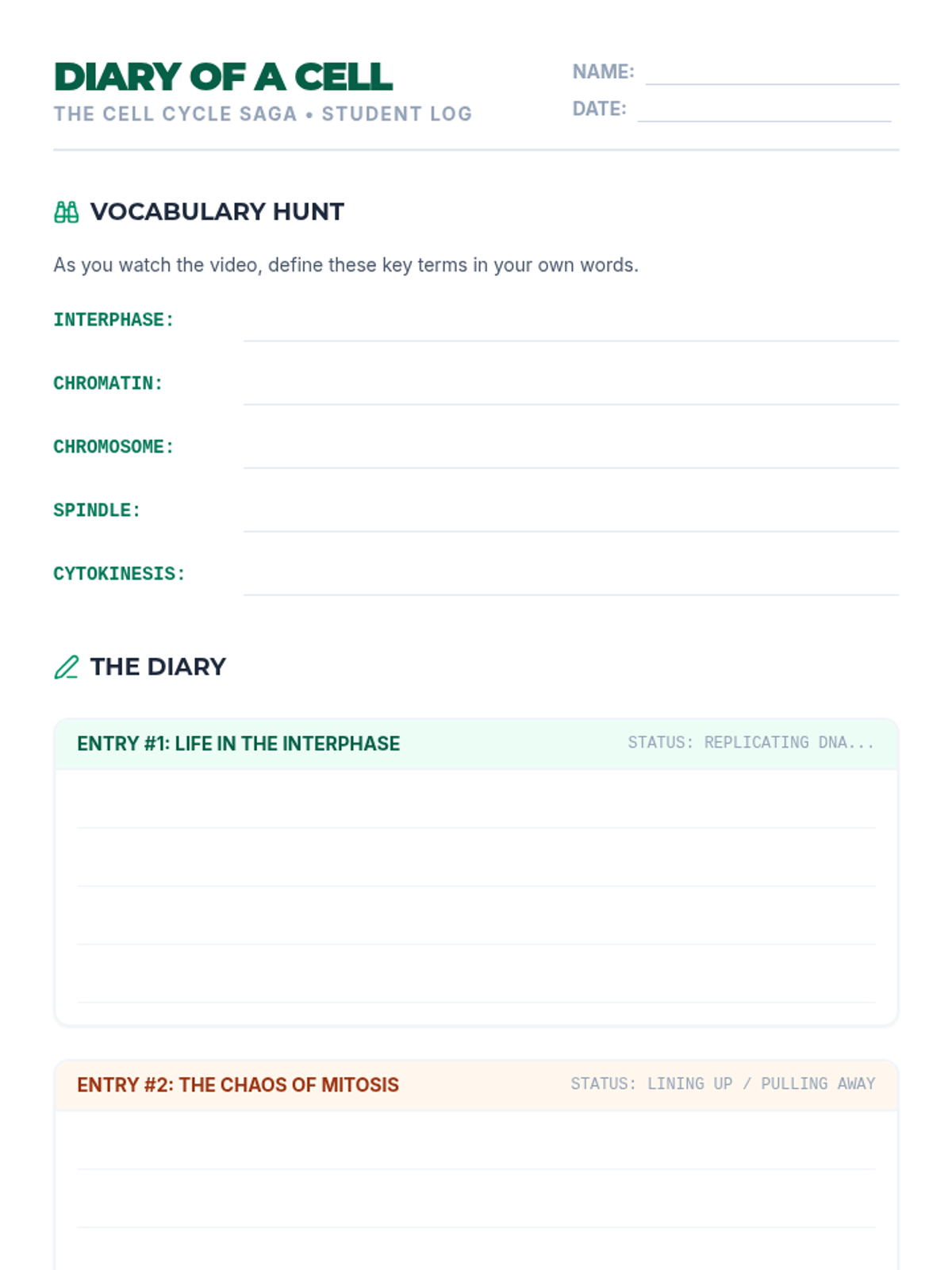 A comprehensive lesson exploring the stages of the cell cycle, focusing on the distinction between Interphase (G1, S, G2) and M-Phase. Students use a video guide and creative modeling to understand cellular growth and division.