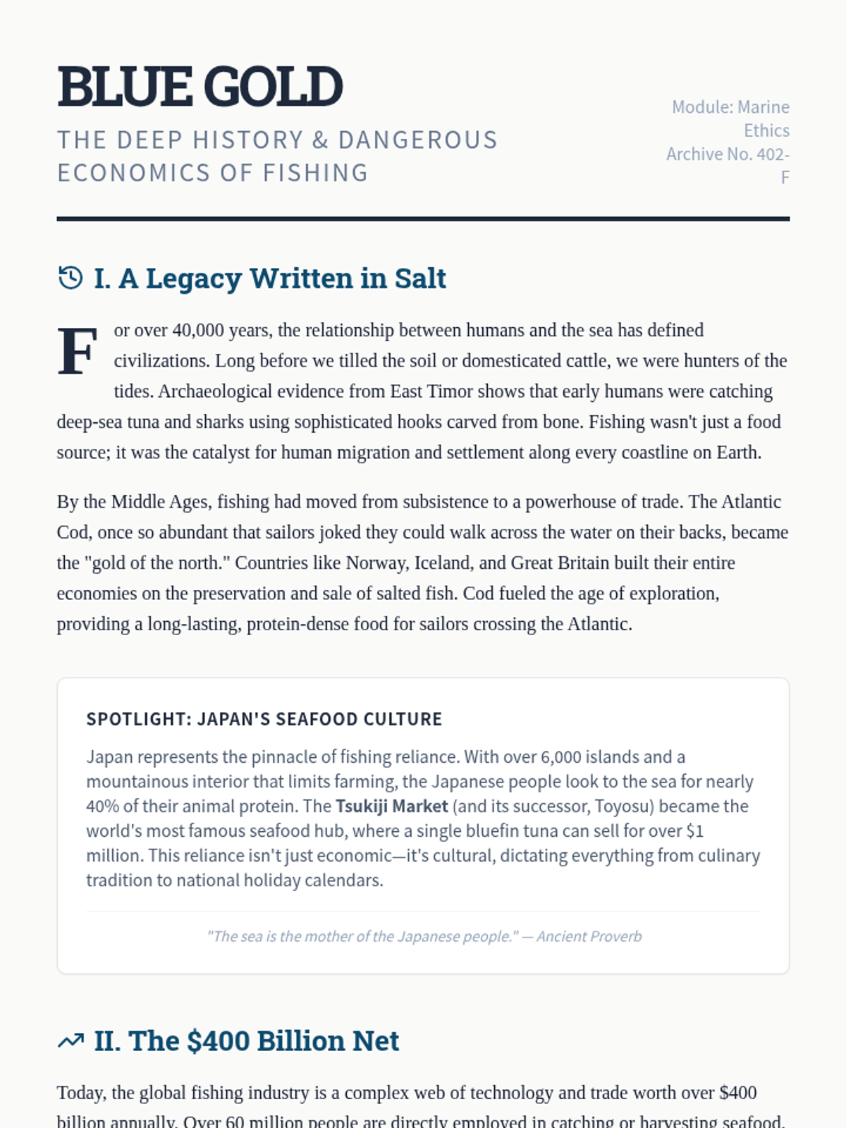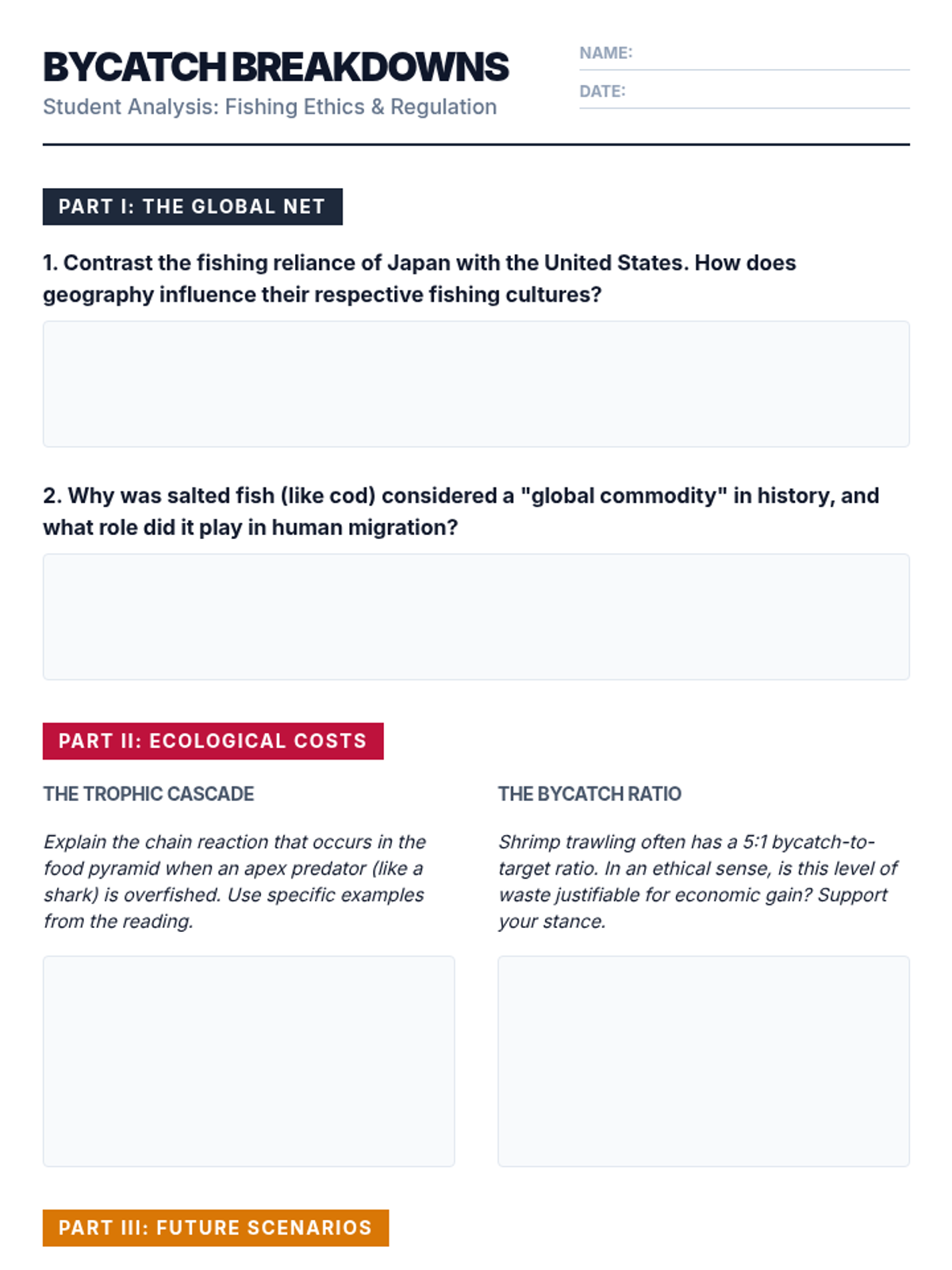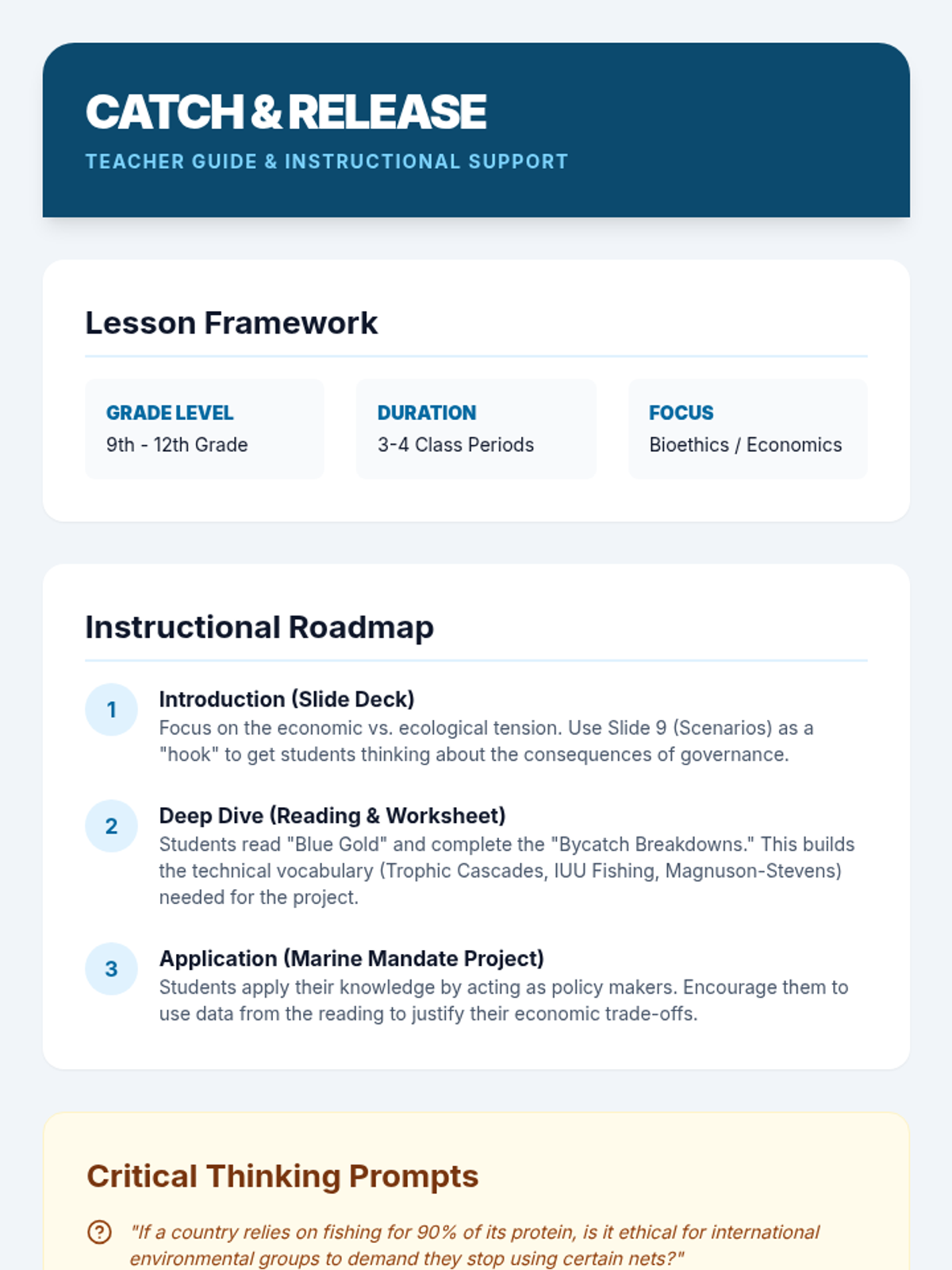 A comprehensive lesson exploring the history, economics, biodiversity impacts, and ethical dilemmas of global fishing. Students will analyze commercial and recreational practices, examine international regulations, and debate the socio-ecological consequences of various fishing management scenarios.