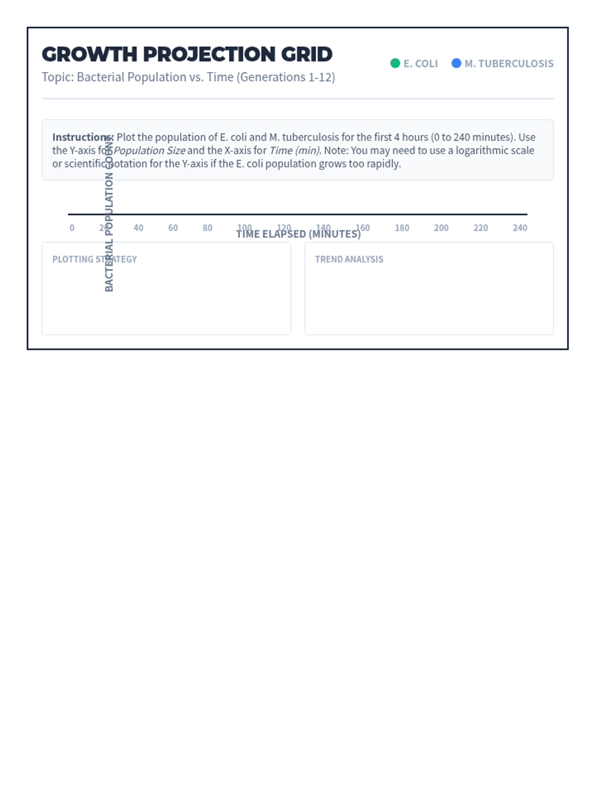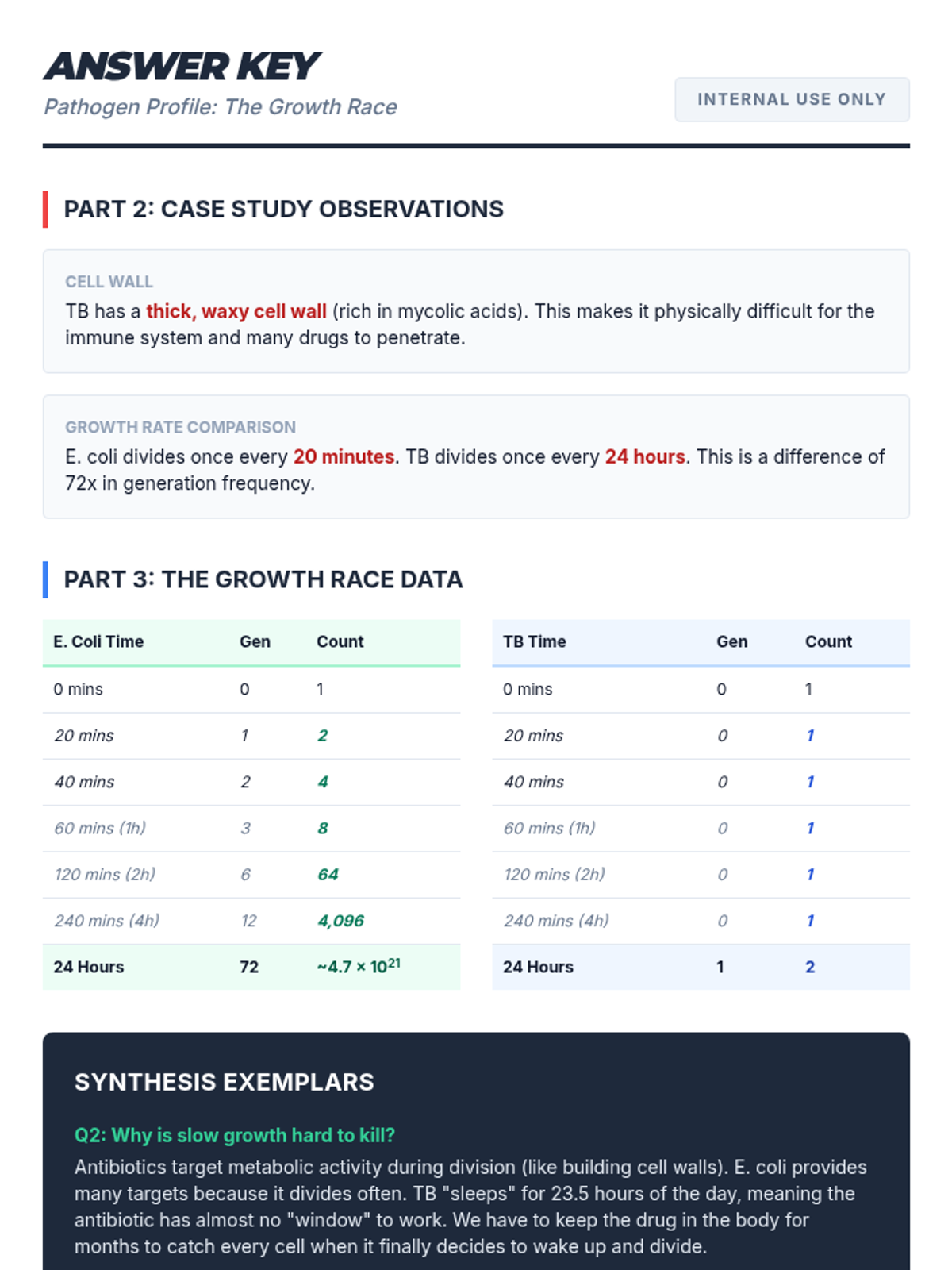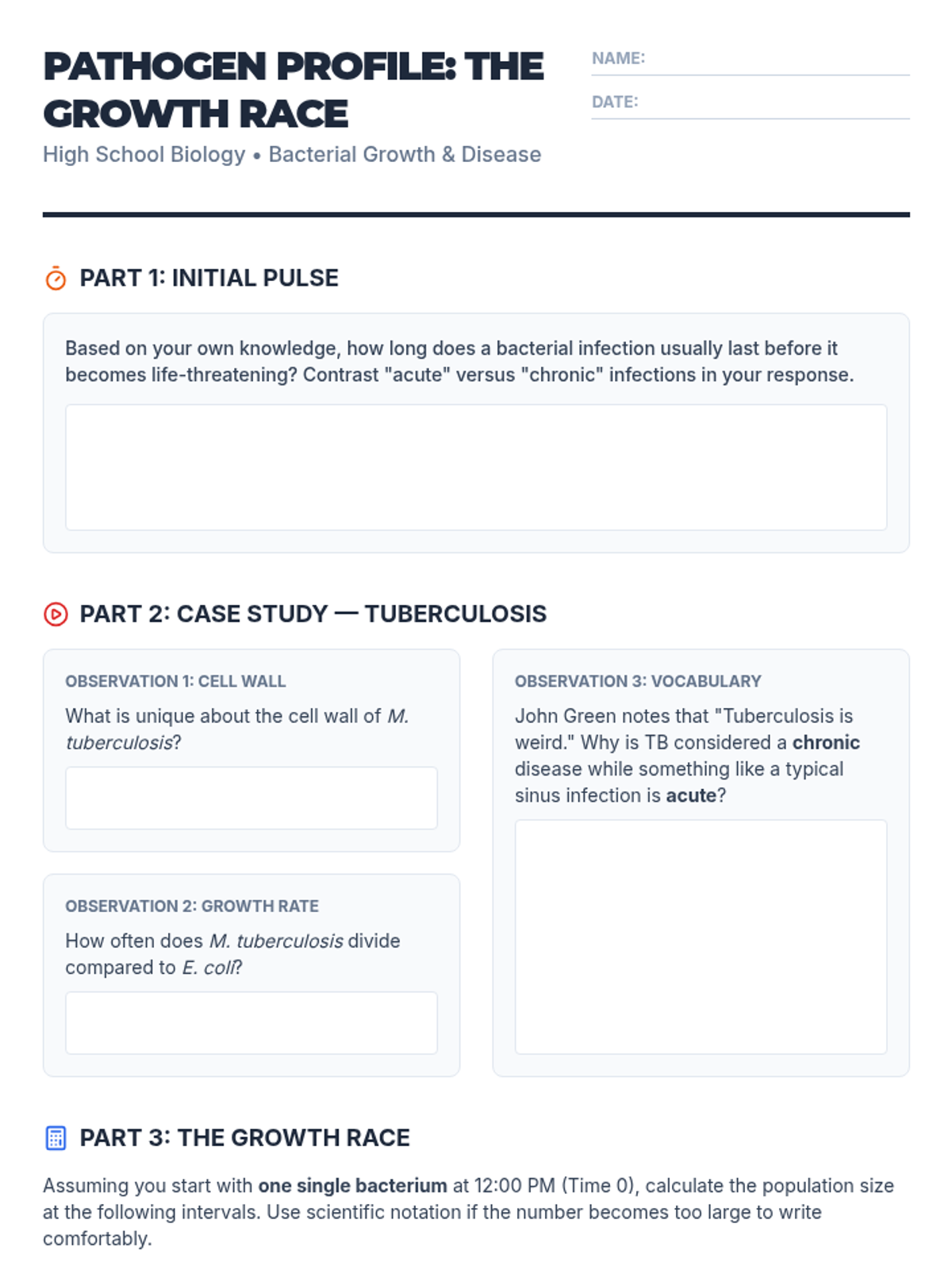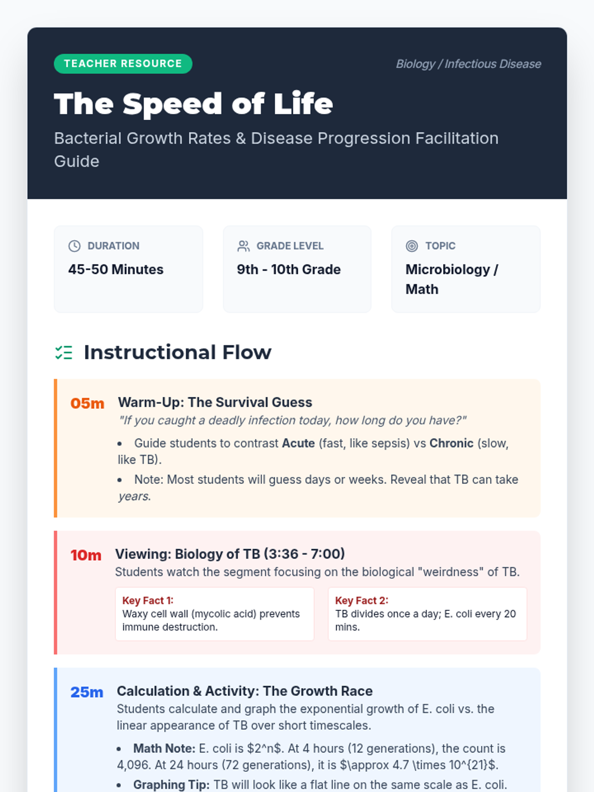 Students will investigate the drastic differences in bacterial reproduction rates by comparing E. coli and Mycobacterium tuberculosis, analyzing how growth speed dictates the nature of a disease and the complexity of its treatment.
