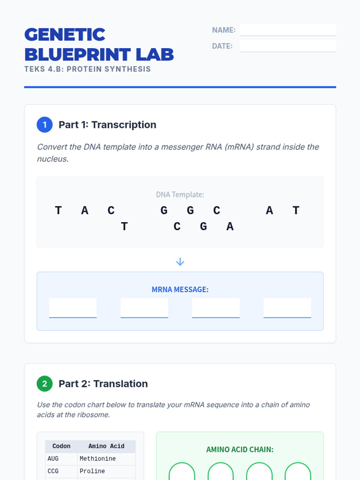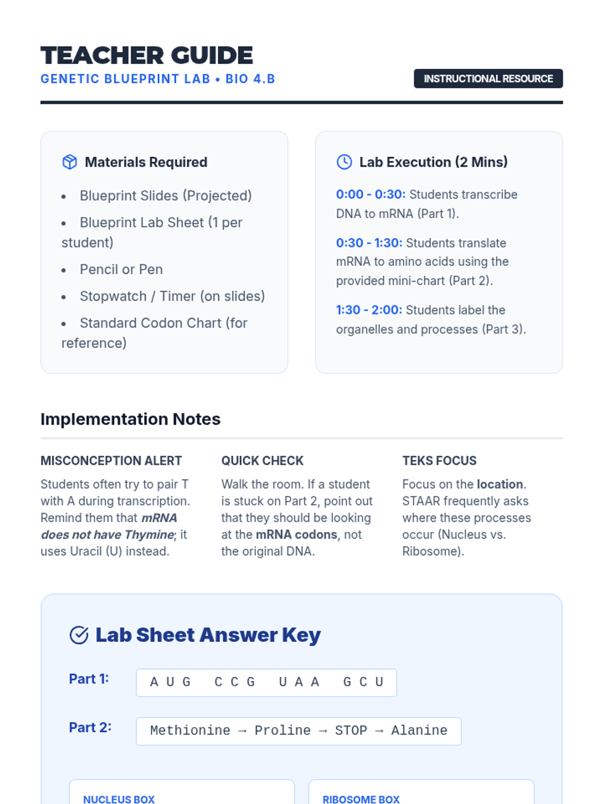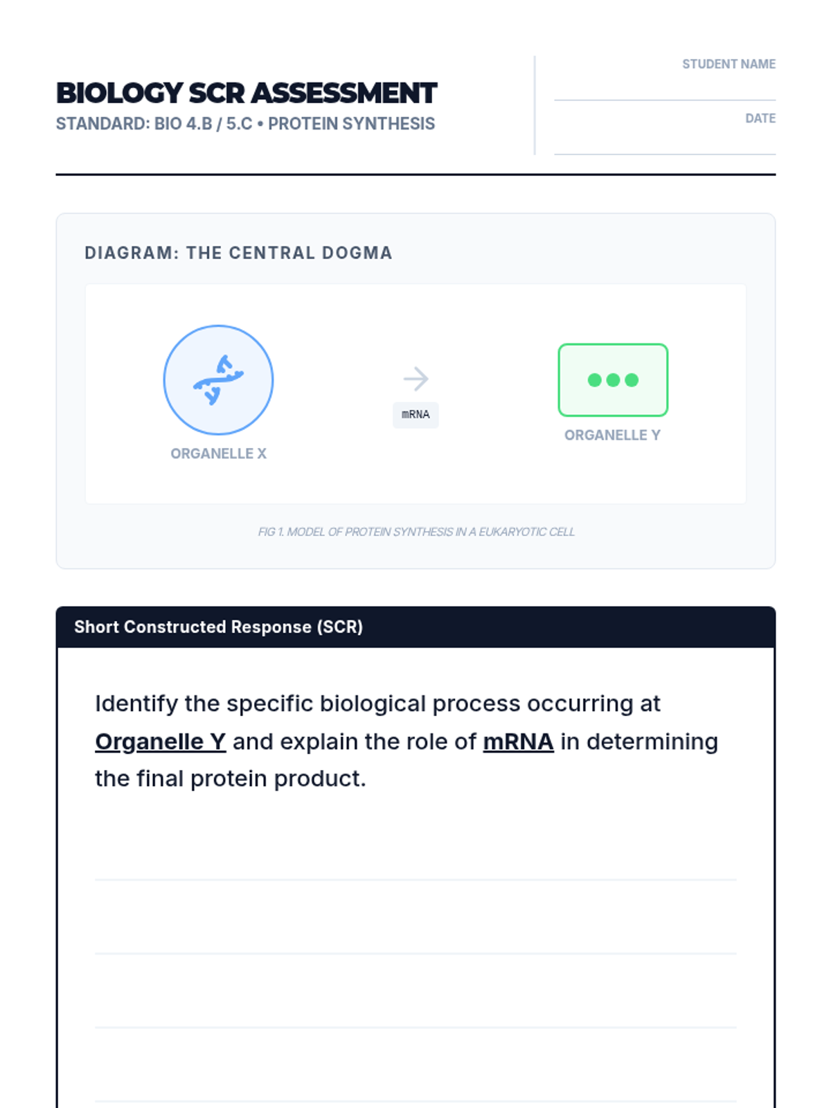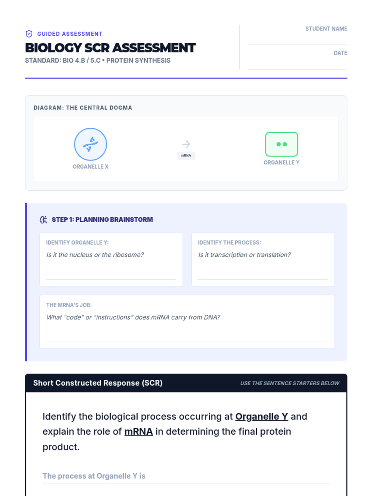 A lightning-fast mini-lab where students decode genetic information using diagrams of transcription and translation, followed by a STAAR-style SCR assessment.