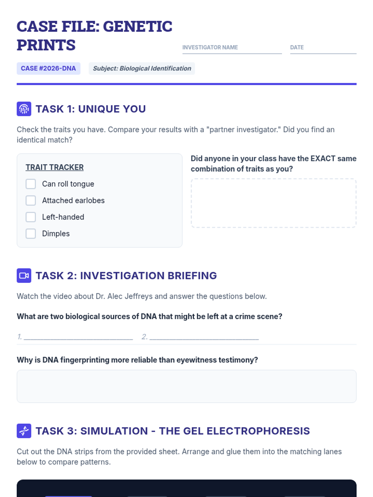 A middle school science lesson exploring the biological basis and forensic application of DNA fingerprinting. Students simulate gel electrophoresis to solve a robbery while discussing the ethics and accuracy of genetic evidence.