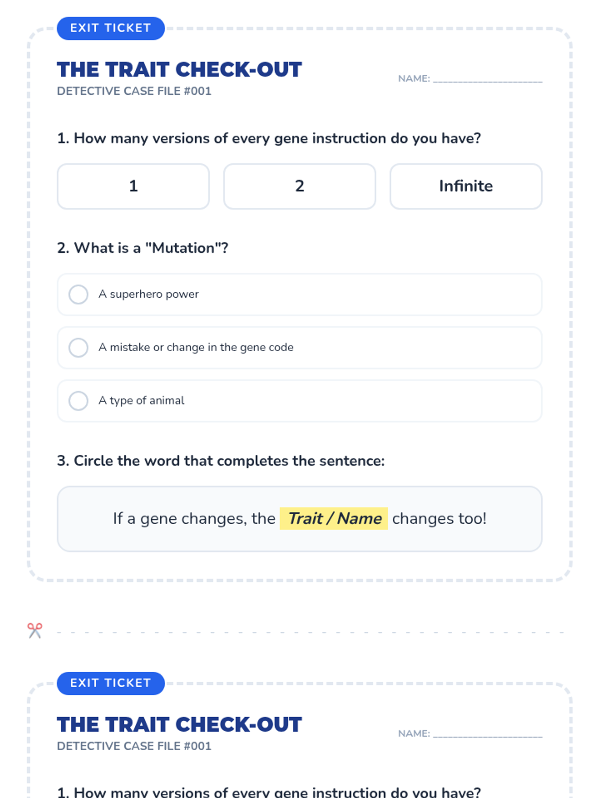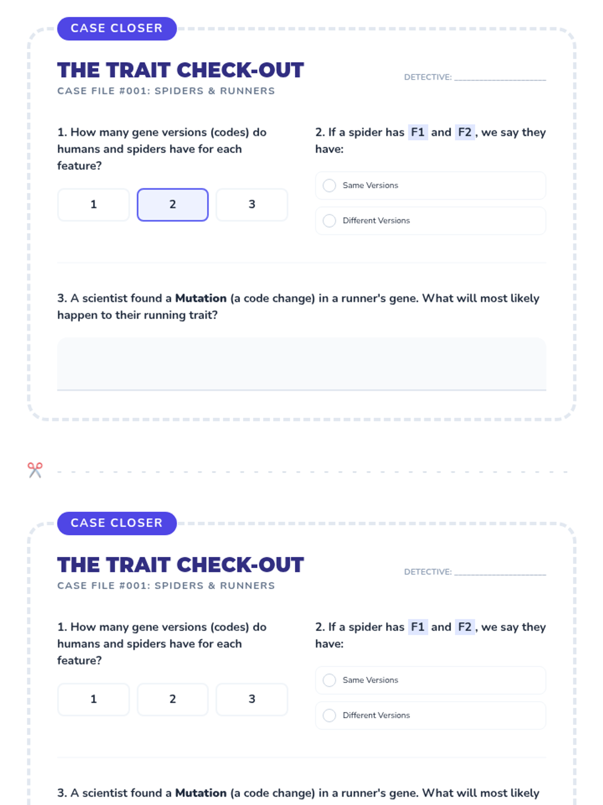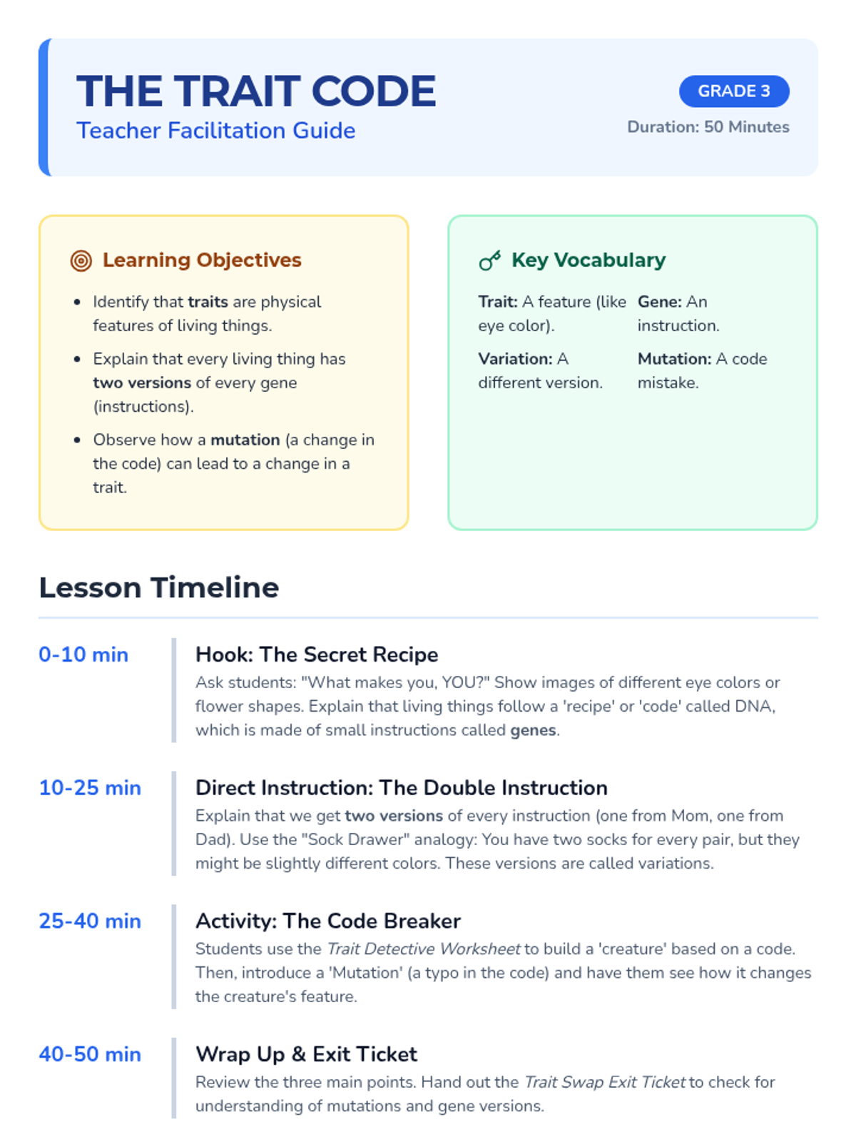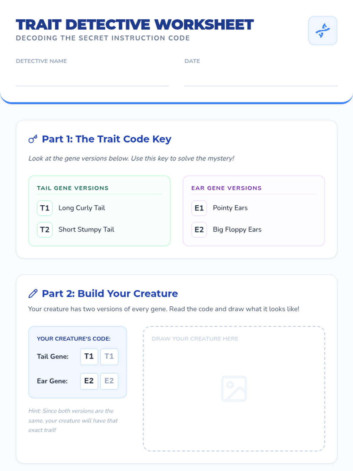 A 3rd-grade introduction to genetics focusing on how we have two versions of every gene and how small changes in those genes (mutations) can change our traits. Students act as code-breakers to discover how living things get their unique features.