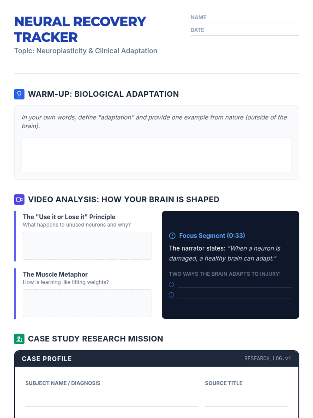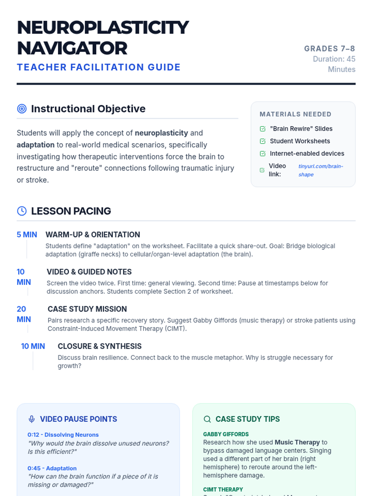 A middle school science lesson exploring neuroplasticity through medical recovery case studies. Students investigate how the brain 'reroutes' neural pathways after injury using adaptation and recovery strategies.