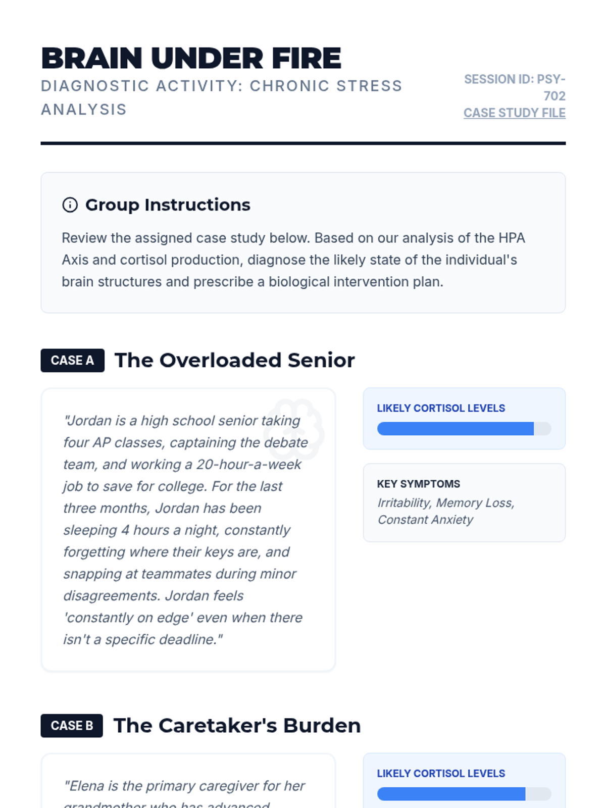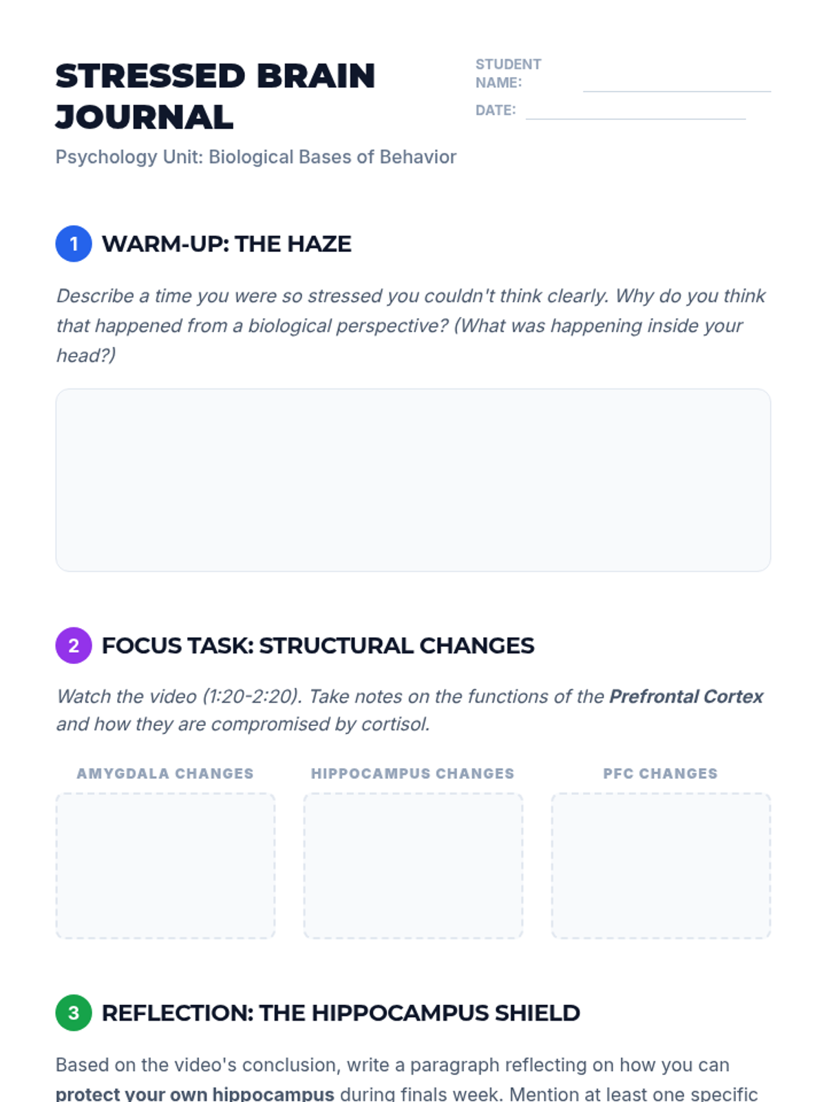 A high school psychology lesson exploring the physiological impact of chronic stress on brain structures like the amygdala, hippocampus, and prefrontal cortex, featuring a video analysis and case study application.
