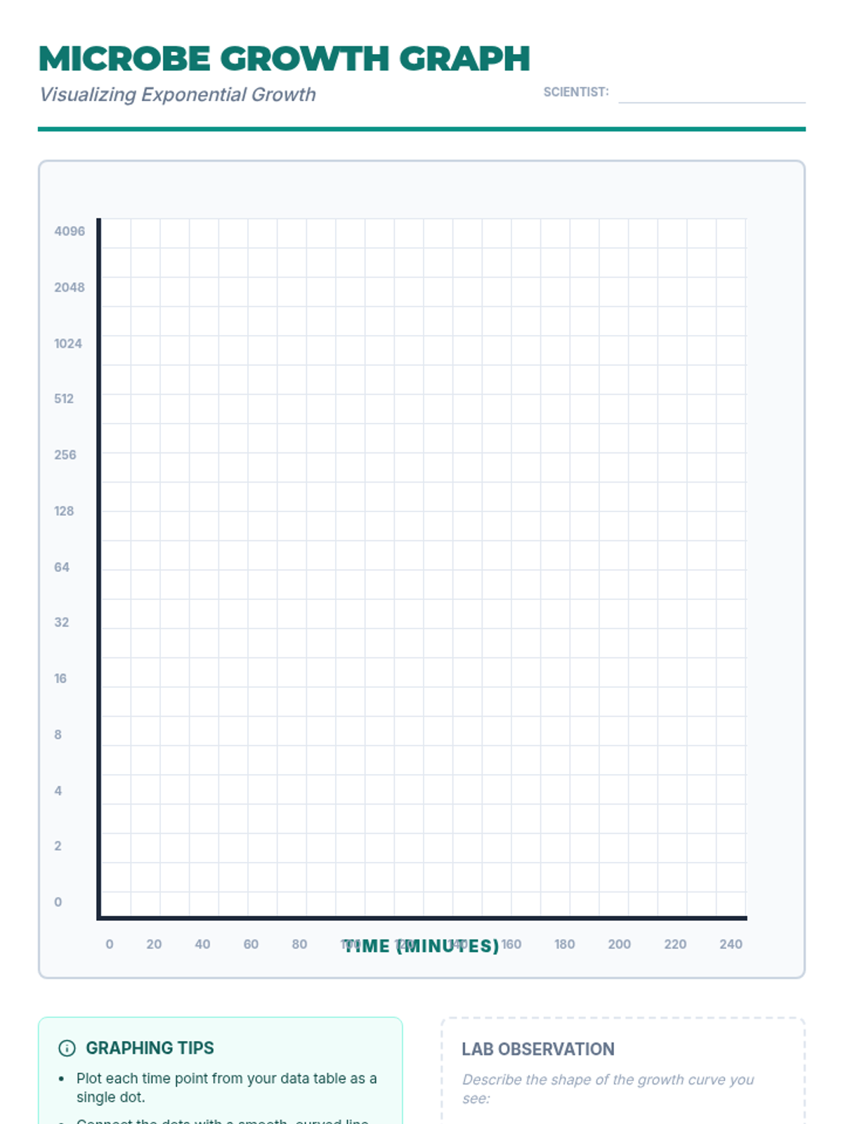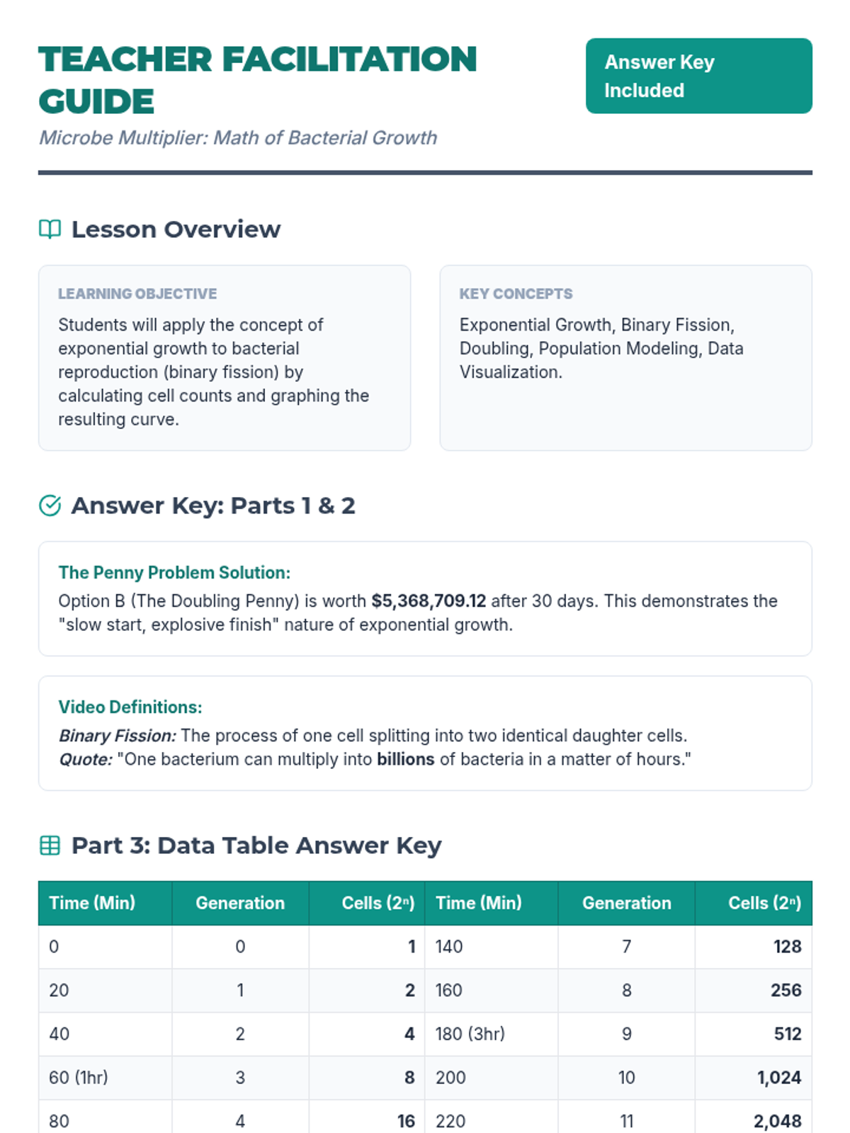 Students explore the explosive nature of exponential growth through the lens of bacterial reproduction (binary fission). They compare a financial growth riddle to biological doubling, calculate cell counts over time, and graph the resulting curve to understand how microscopic organisms become visible colonies.