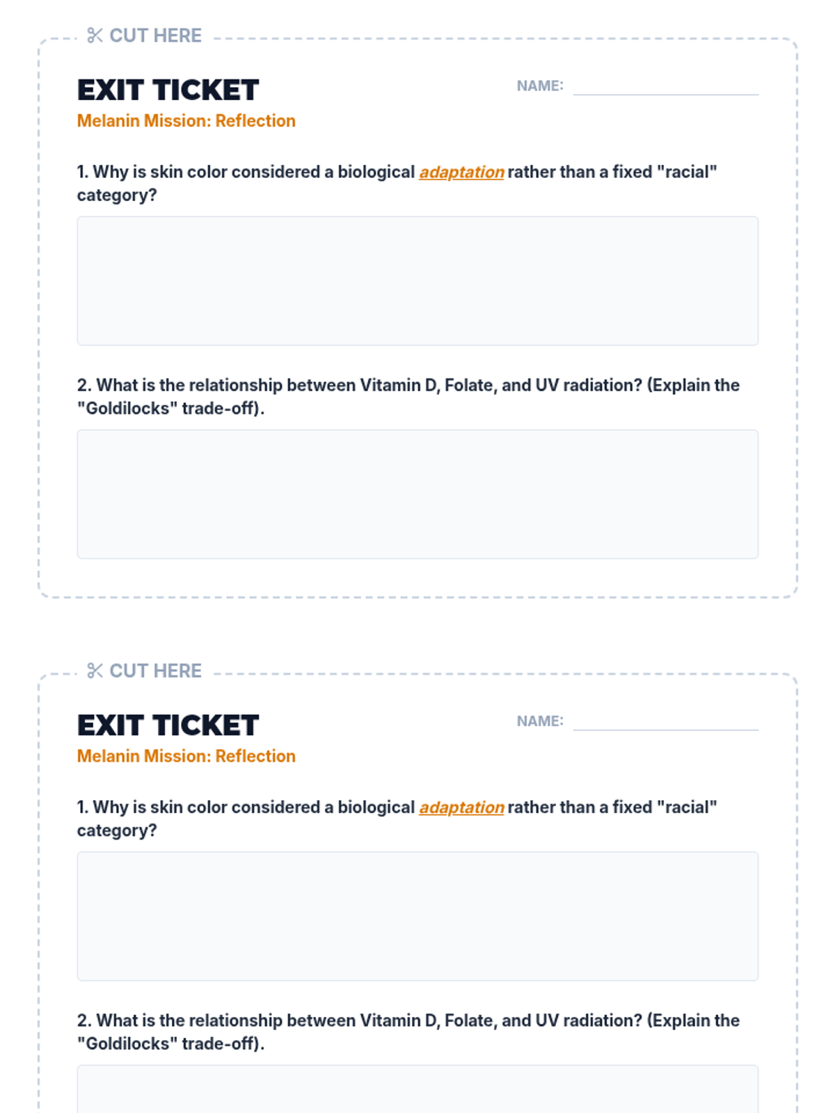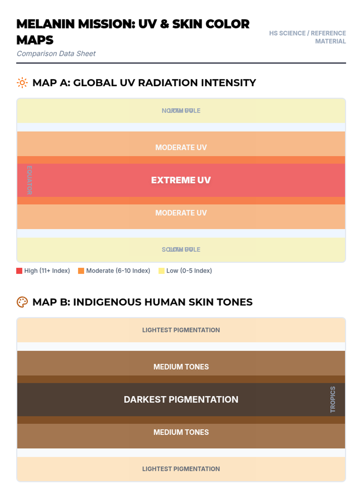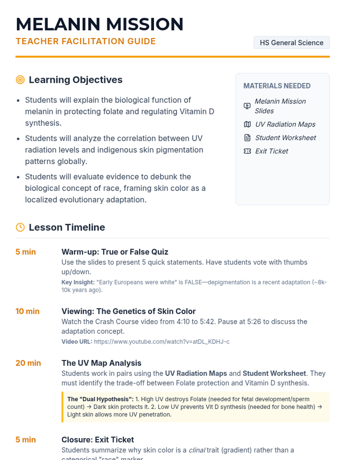 A High School General Science lesson exploring the evolutionary biology of skin color, the function of melanin, and the debunking of race as a biological category using UV radiation data and genetic evidence.