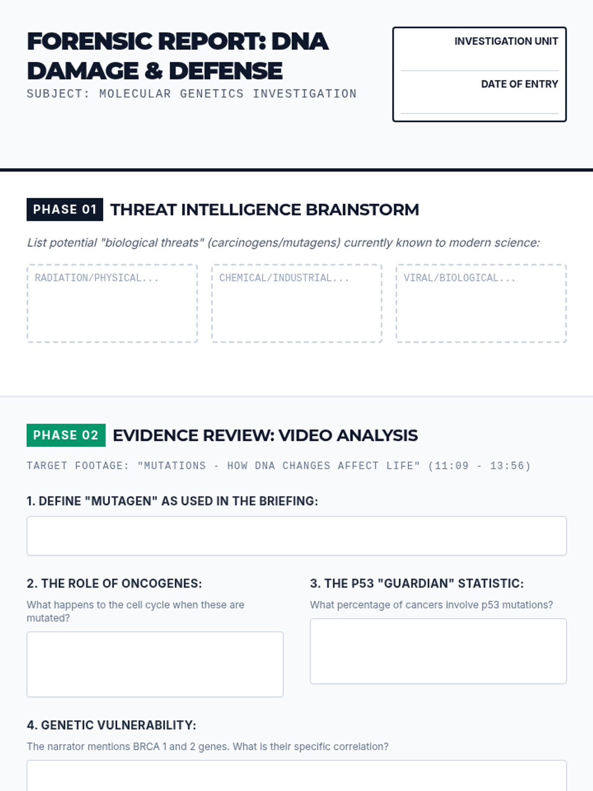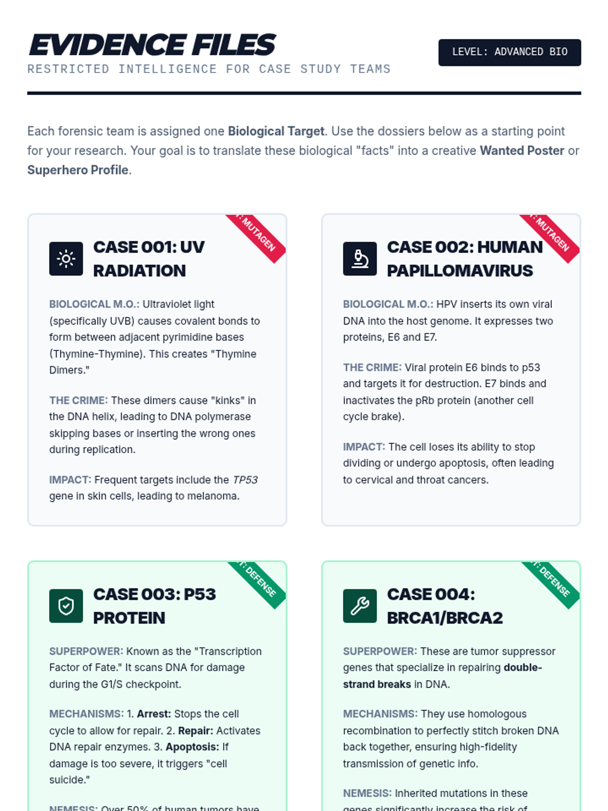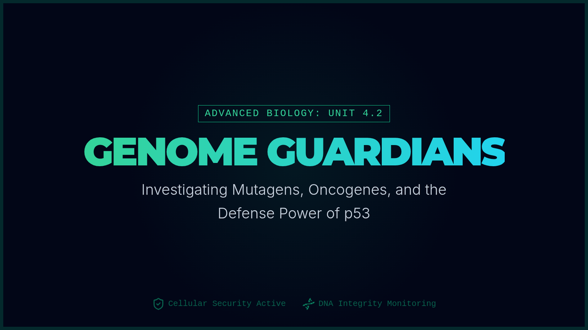An advanced biology lesson focusing on mutagens, oncogenes, and cellular defense mechanisms like p53. Students take on the role of genetic investigators to analyze how DNA is attacked and protected.