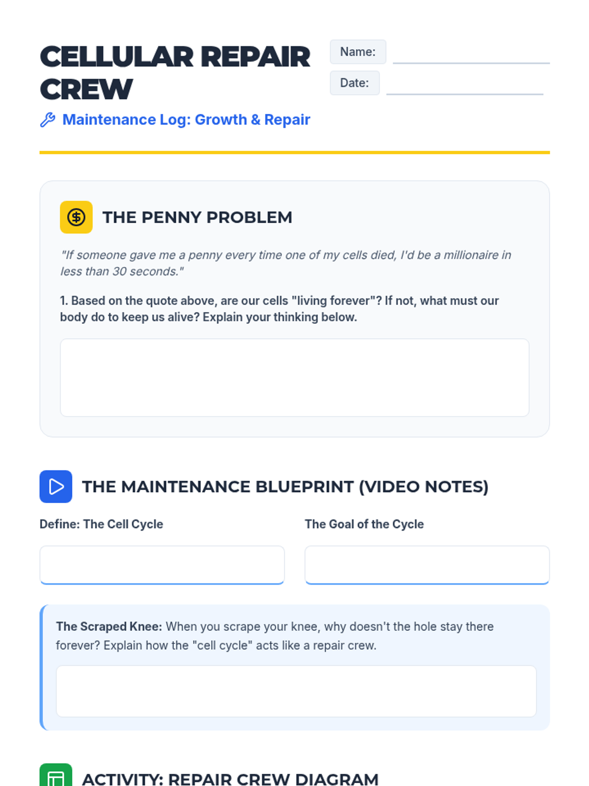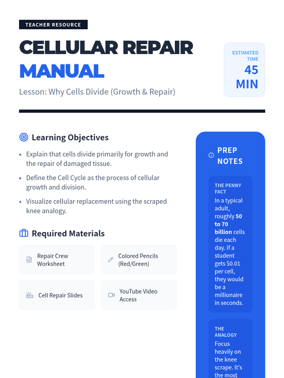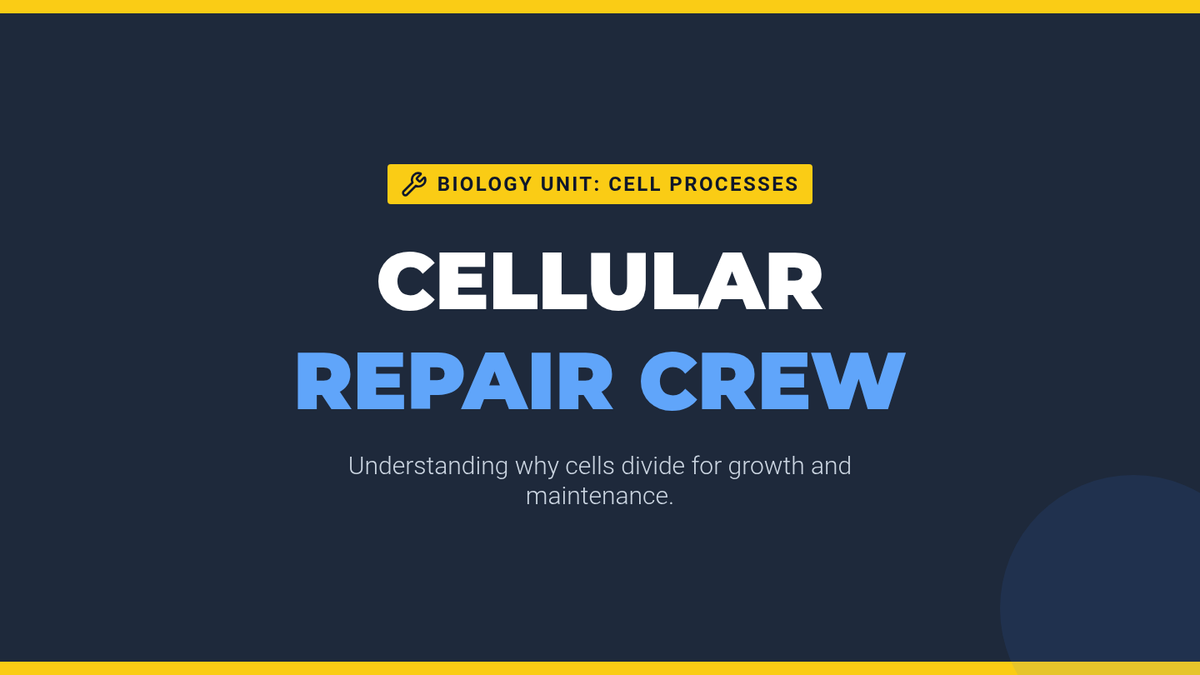 Students explore why cells divide, focusing on growth and repair. Using the 'scraped knee' analogy, they identify the cell cycle as a maintenance process and create a 'Repair Crew Diagram' to visualize cellular replacement.