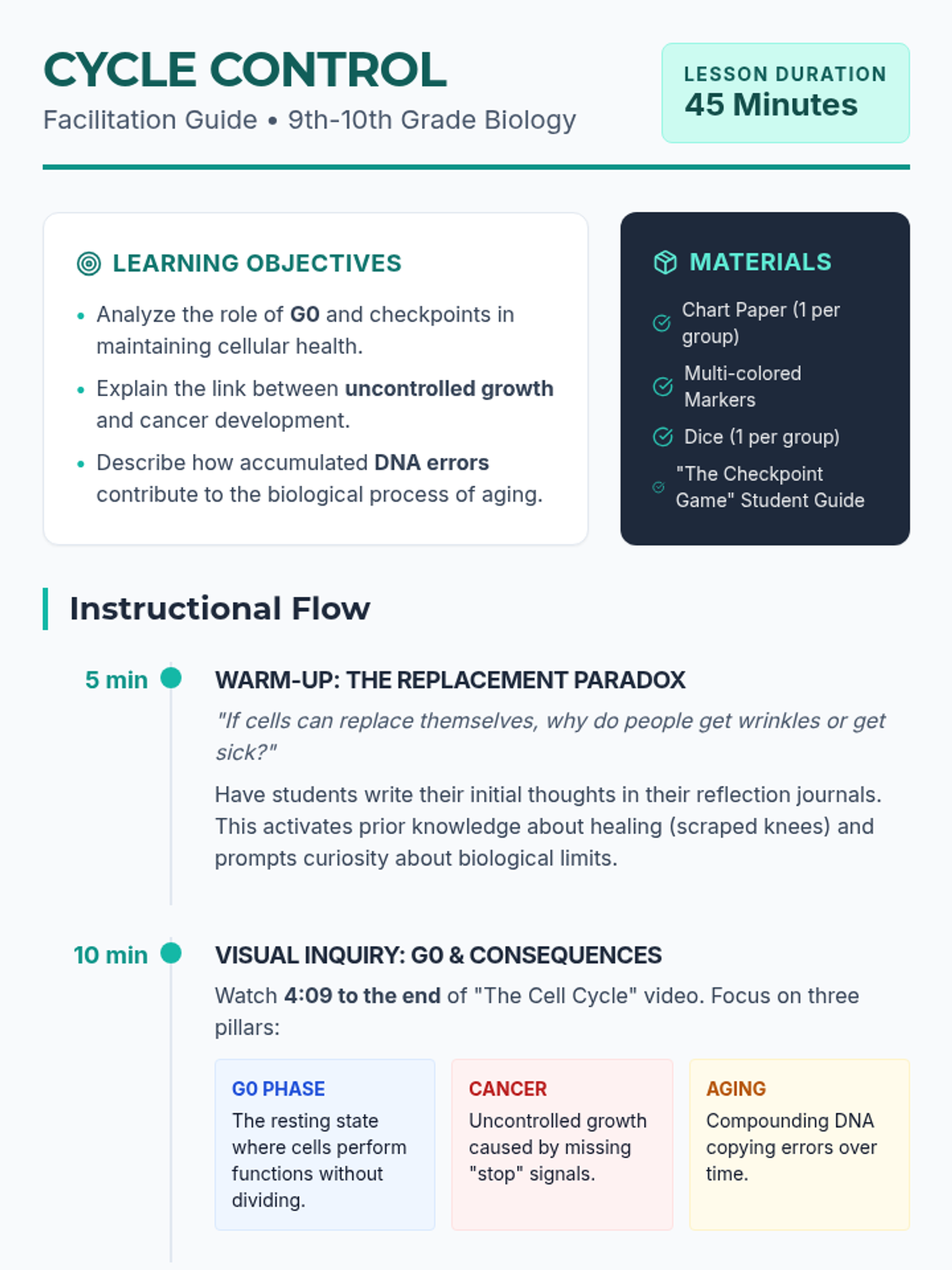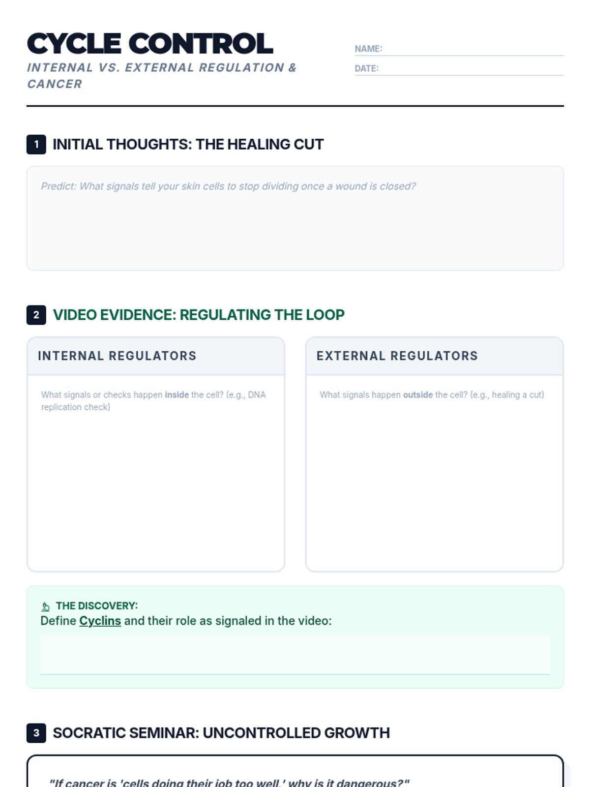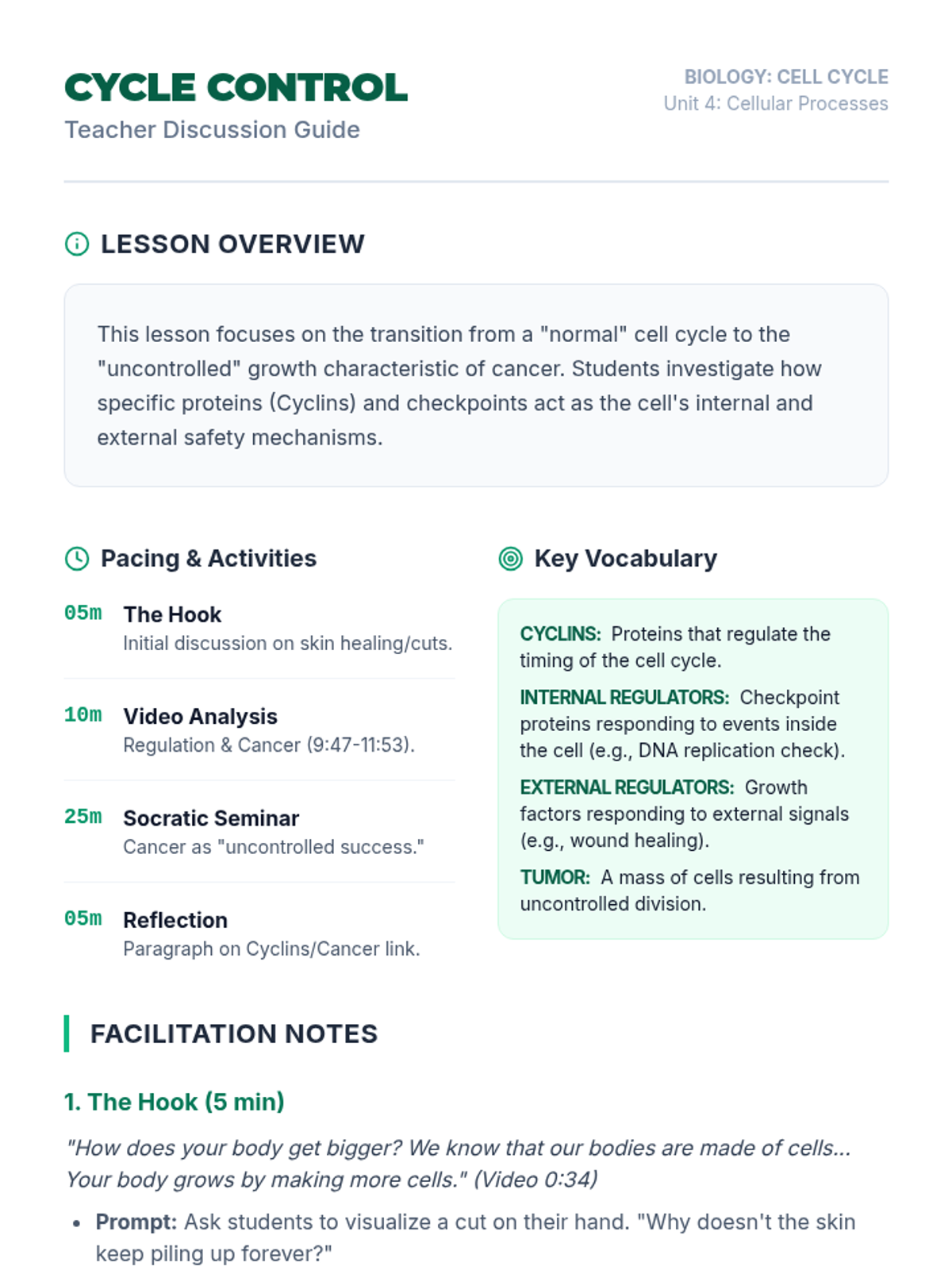 A high school biology lesson focusing on the regulatory mechanisms of the cell cycle, the role of cyclins, and how failure in these systems leads to cancer. Students will analyze video evidence, participate in a Socratic seminar, and reflect on cellular control.