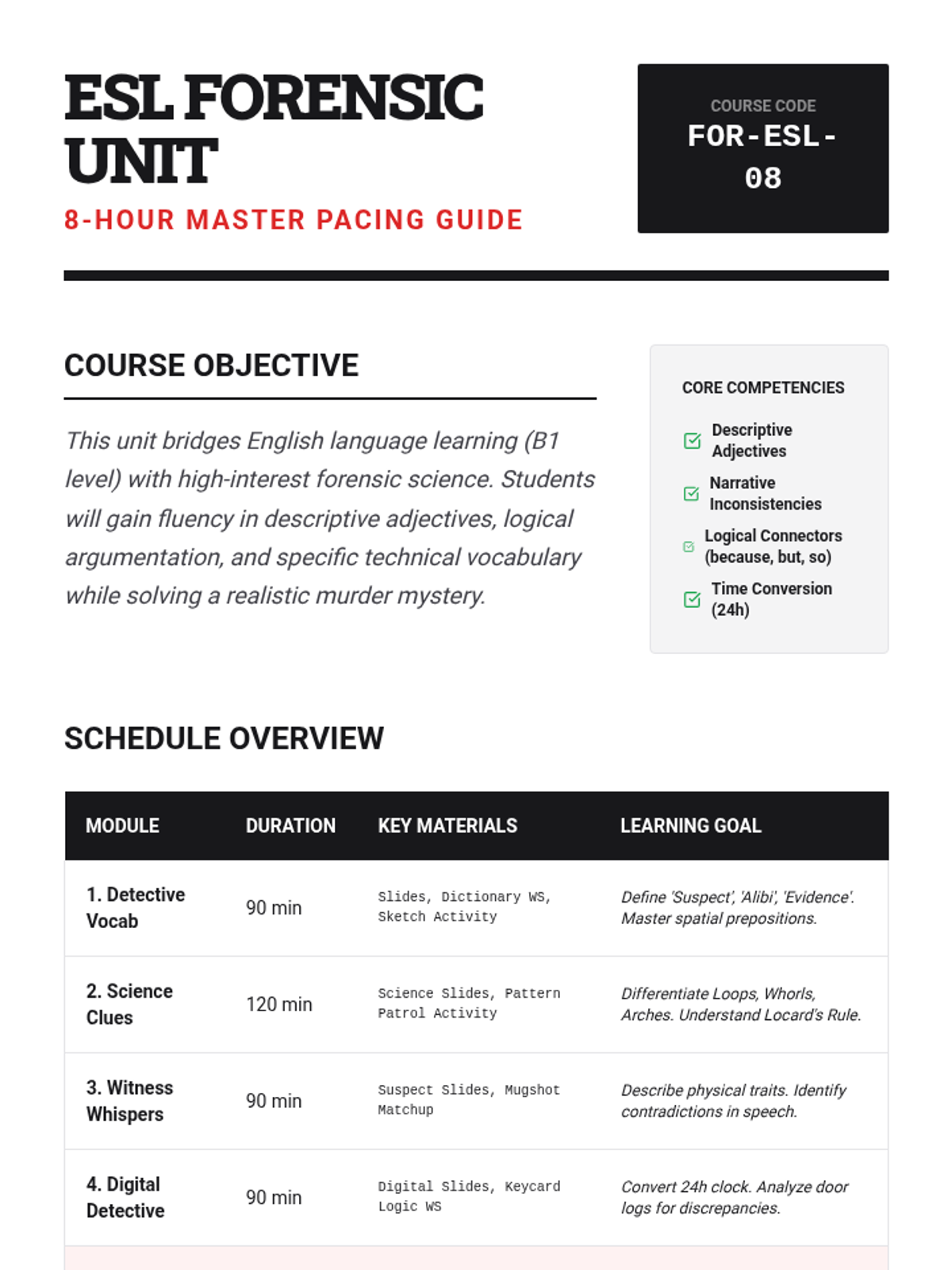 Students learn essential crime-solving vocabulary (alibi, evidence, suspect) and practice categorizing physical vs. testimonial clues using simplified English and visual supports.