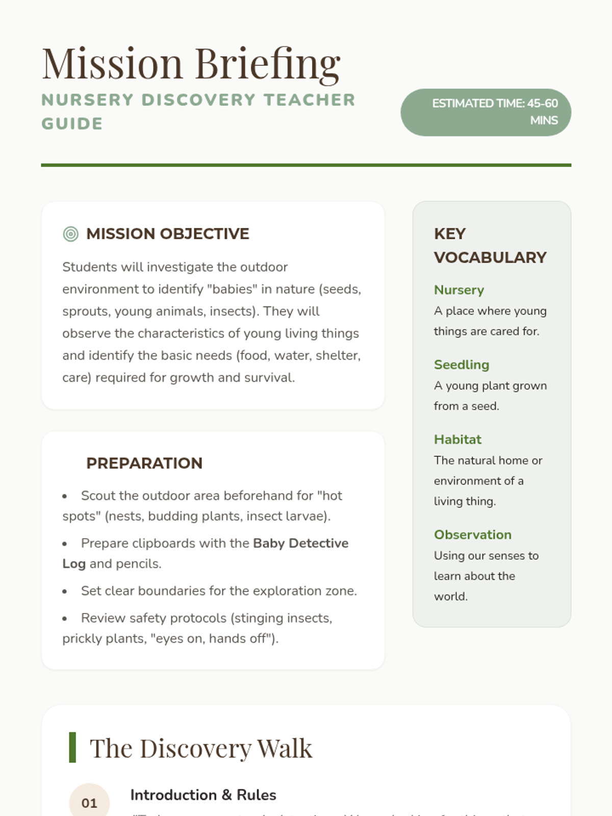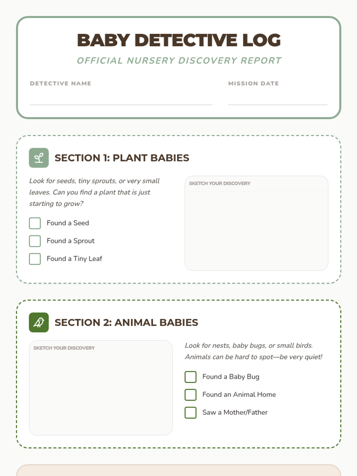 An outdoor exploration where students become 'Baby Detectives' to find and observe different types of babies in nature, including human, animal, and plant life. Students will learn that all living things start small and require care and specific environments to grow.
