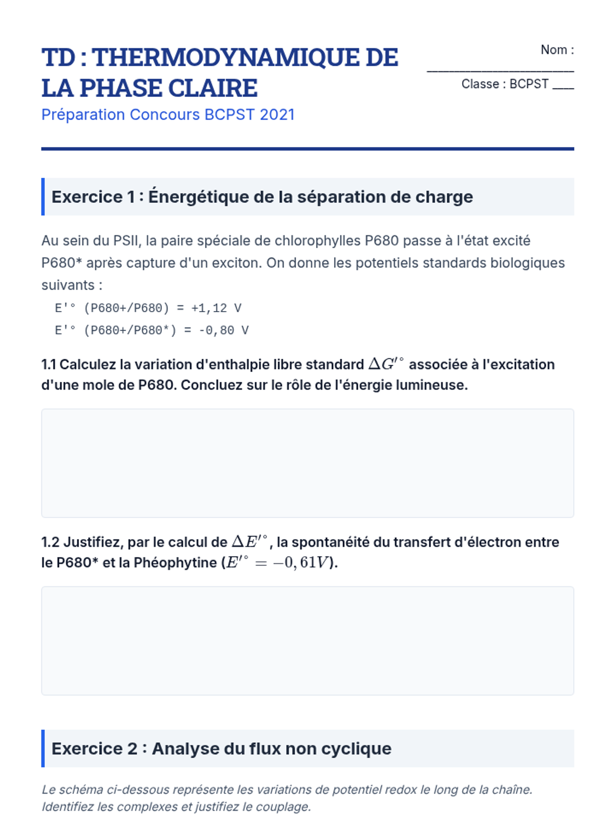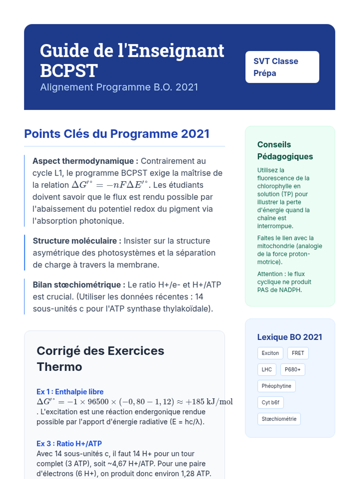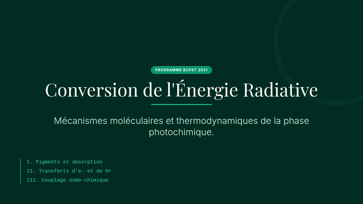 Focus sur la phase photochimique : structure des photosystèmes, capture et transfert de l'énergie d'excitation, chaîne de transporteurs d'électrons et couplage osmo-chimique pour la synthèse d'ATP et de NADPH. Approche conforme aux exigences du concours BCPST.