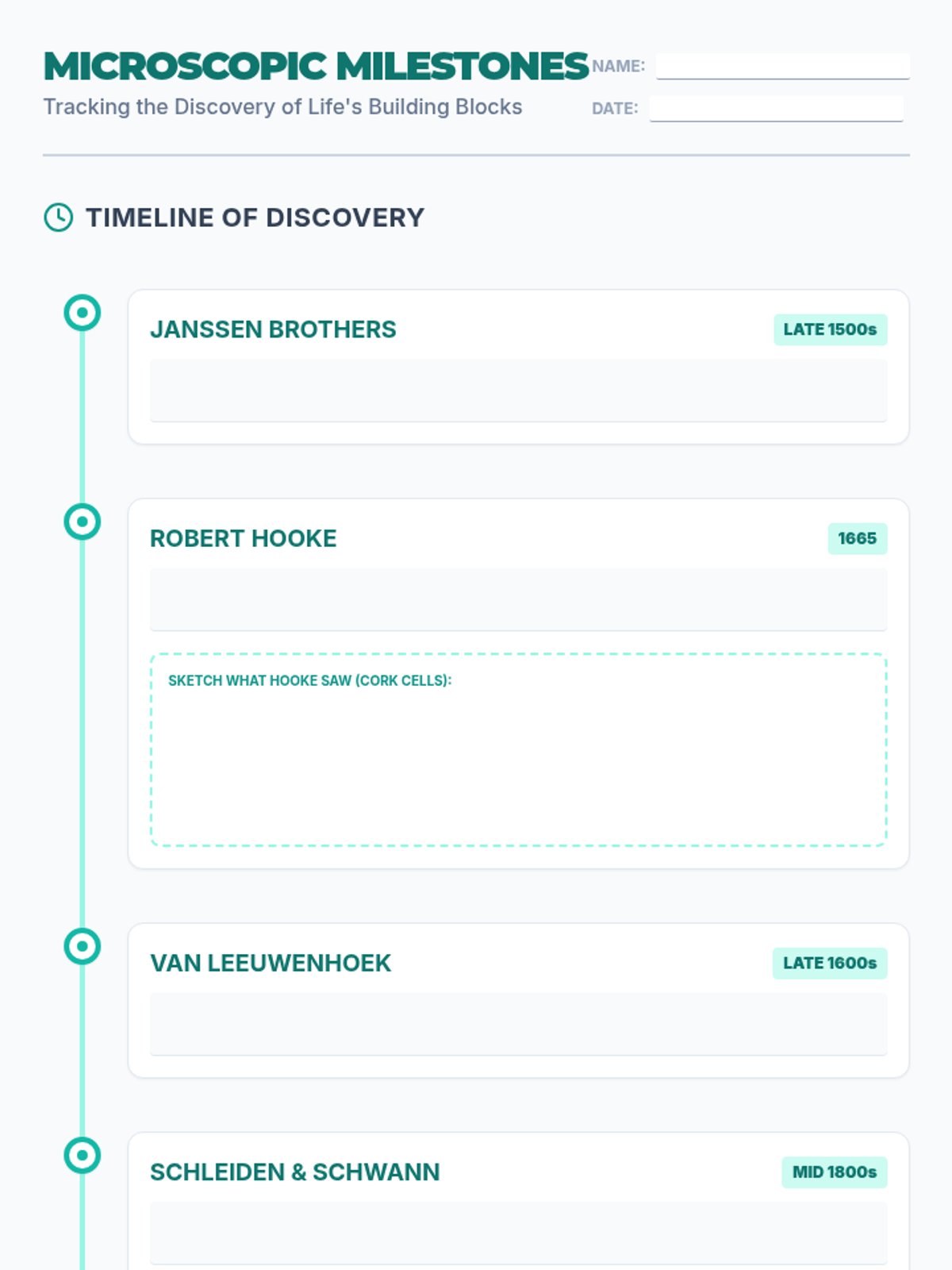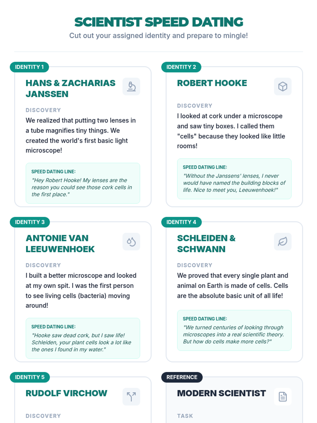 A comprehensive lesson exploring the history of Cell Theory, featuring a video-based timeline, a collaborative speed-dating activity, and a deep dive into the scientists who discovered the building blocks of life.