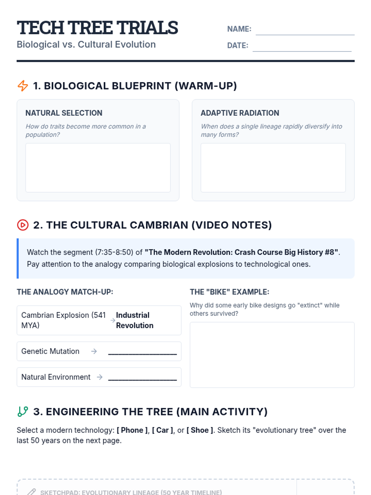 Students explore the parallels between biological and cultural evolution by analyzing the 'Cambrian Explosion' analogy in the context of technological development. The lesson culminates in a sketching activity where students map the 'evolutionary tree' of a modern object.