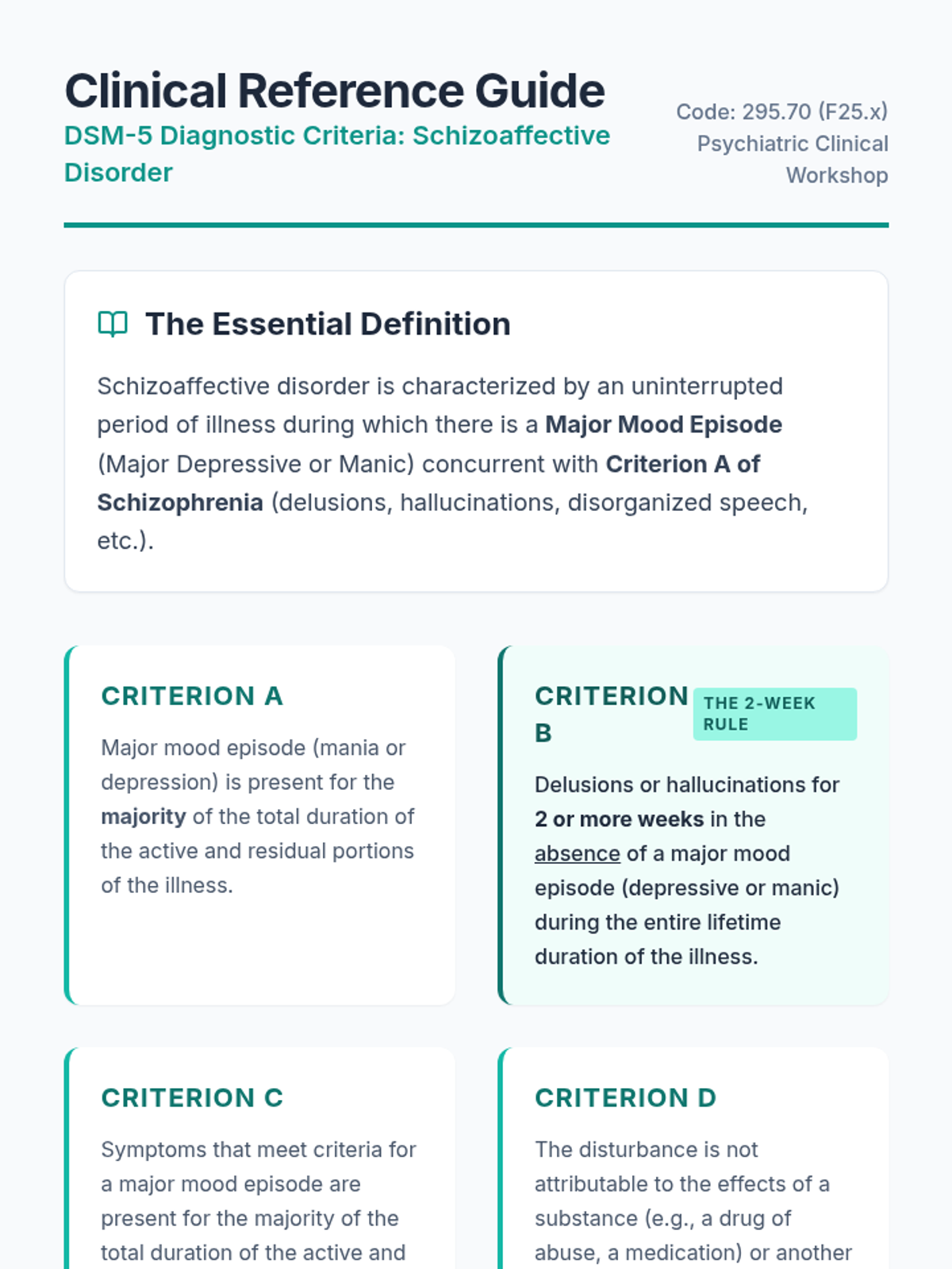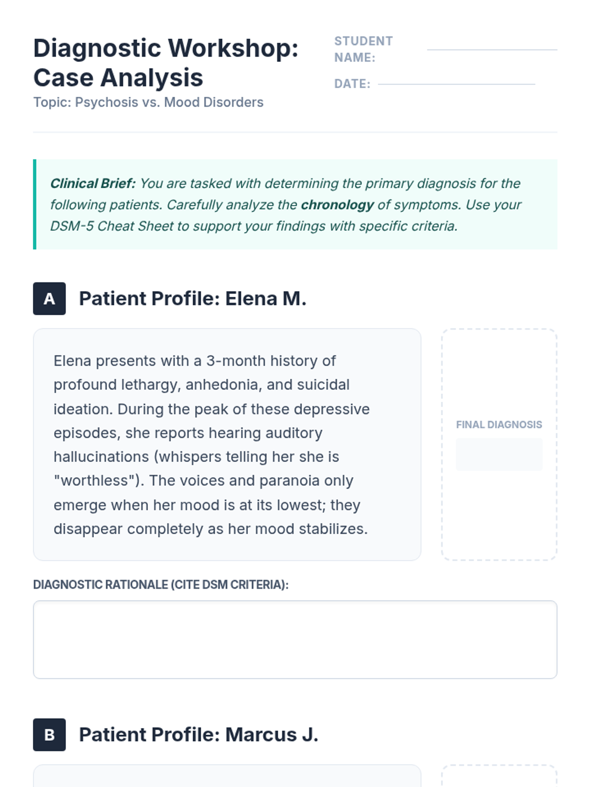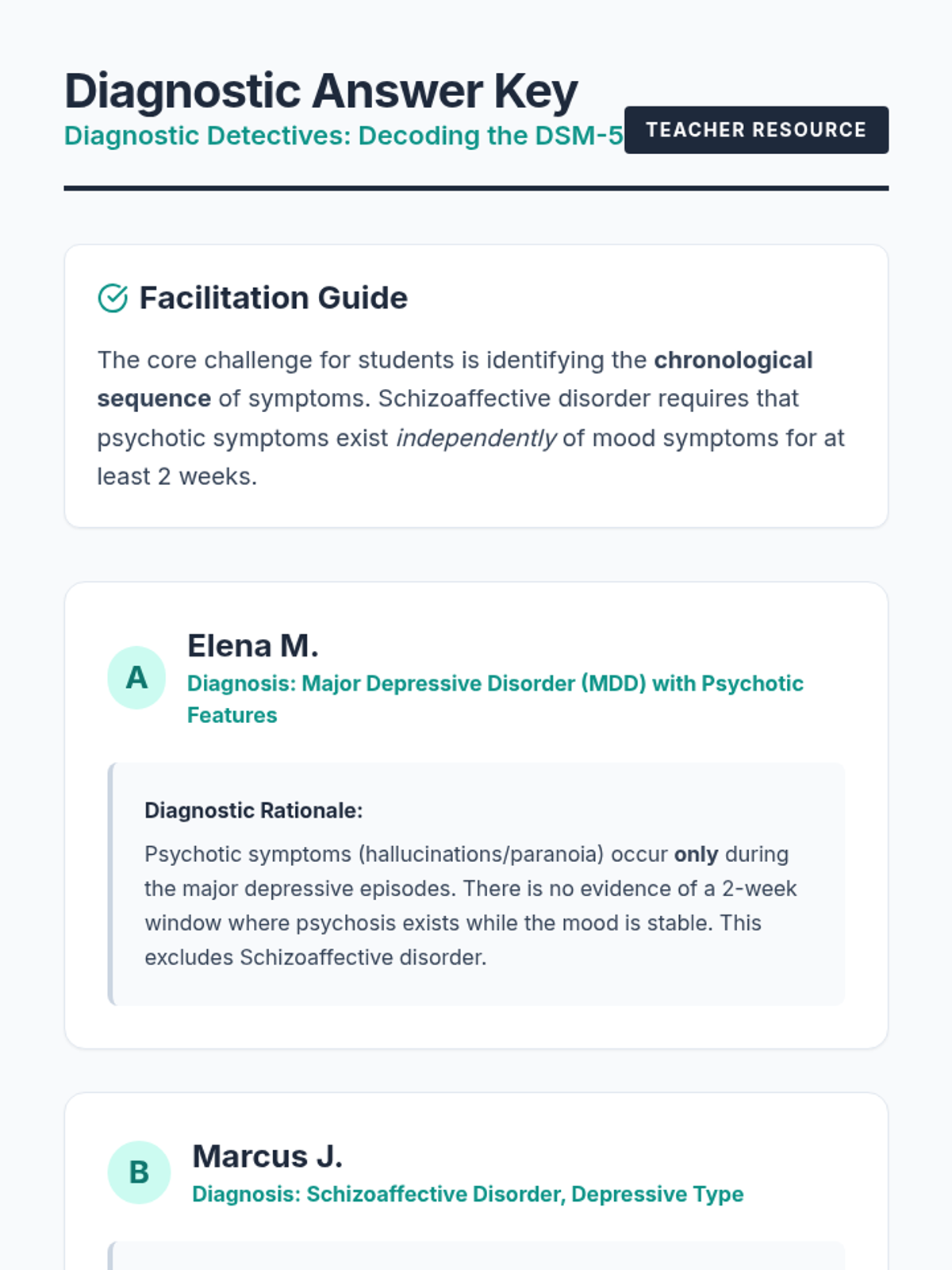 A clinical diagnostic workshop for nursing and pre-med students focused on applying DSM-5 criteria to differentiate schizoaffective disorder from other mood and psychotic disorders. Students analyze patient case studies and use evidence-based criteria to reach accurate diagnoses.