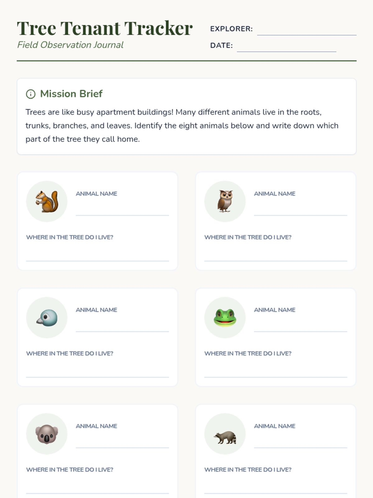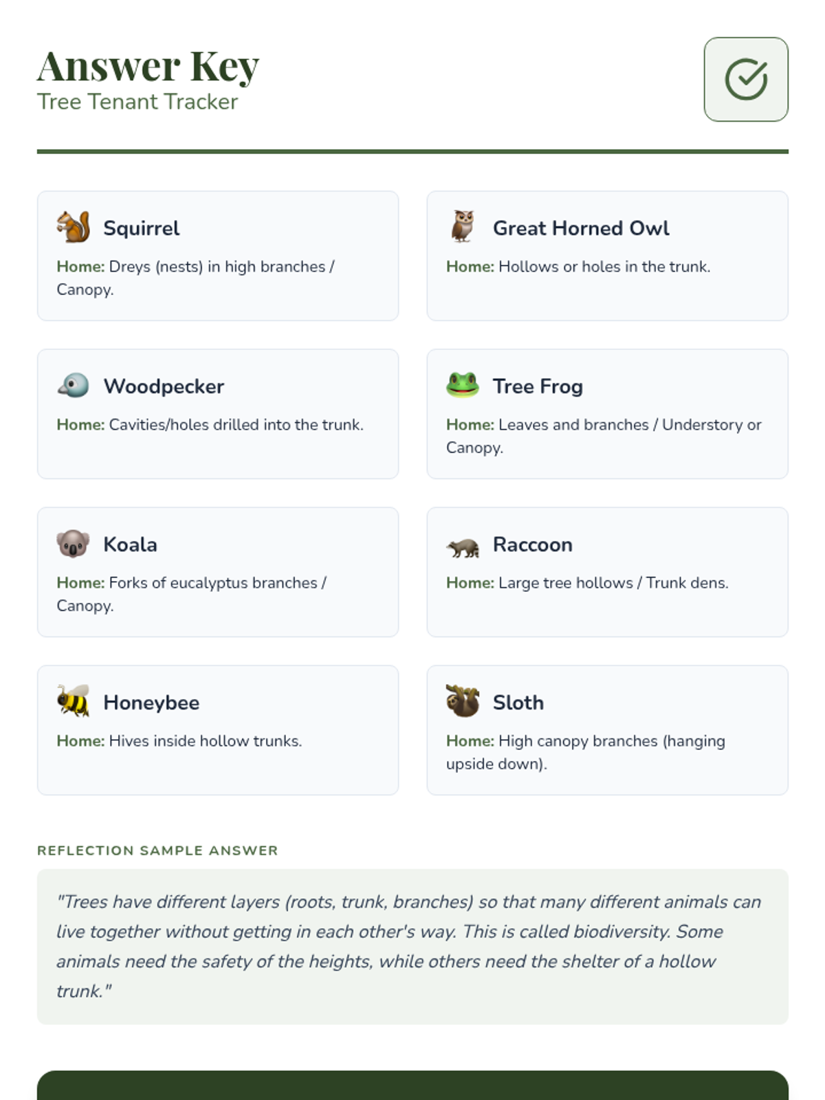 A lesson exploring the diverse animals that call trees their home, focusing on identification and the specific parts of the tree they inhabit.