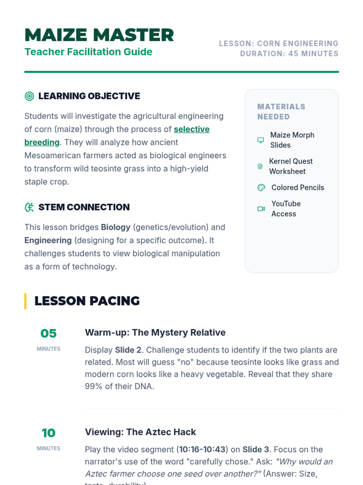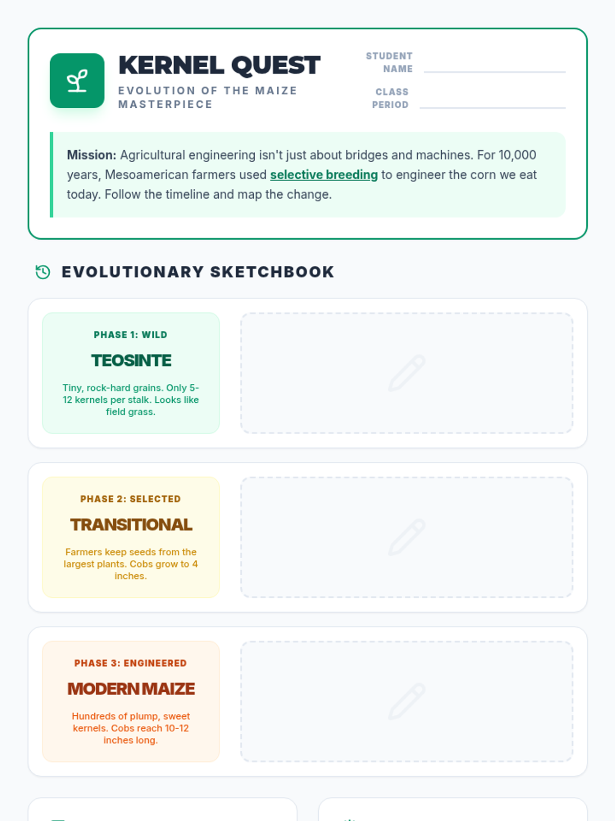 A STEM-integrated lesson exploring how ancient Aztec and Mesoamerican farmers engineered modern corn through the process of selective breeding, transitioning from wild teosinte grass to the large cobs we eat today.