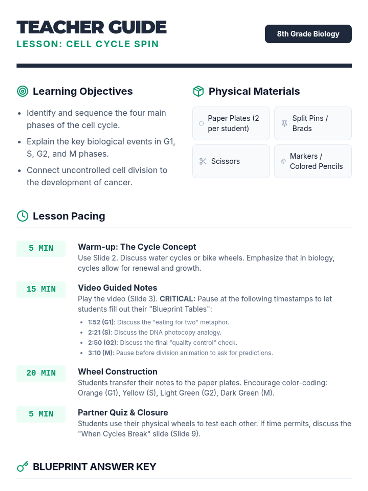 A comprehensive biology lesson for 8th graders on the cell cycle, featuring a video-guided lecture, a hands-on 'Cell Cycle Wheel' paper plate activity, and discussion on growth, division, and cancer.