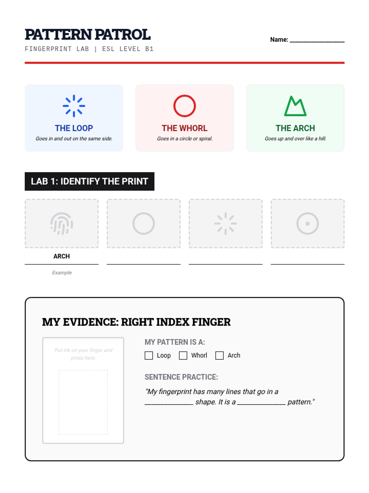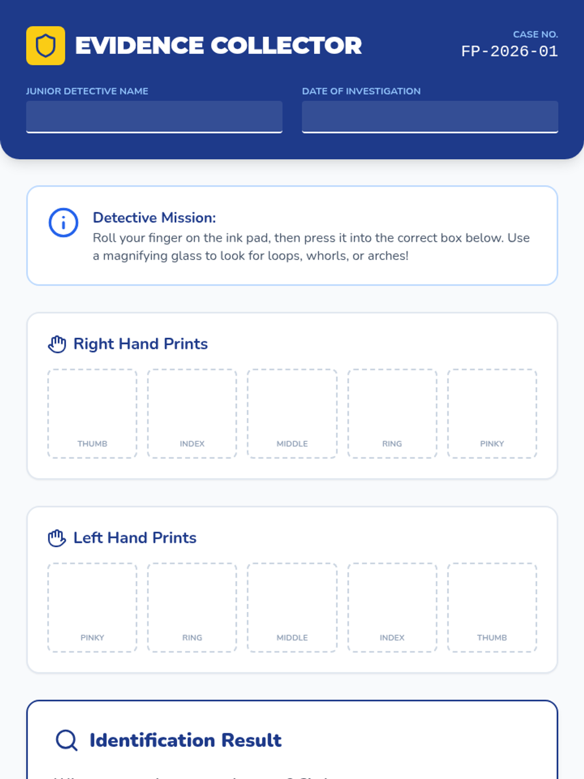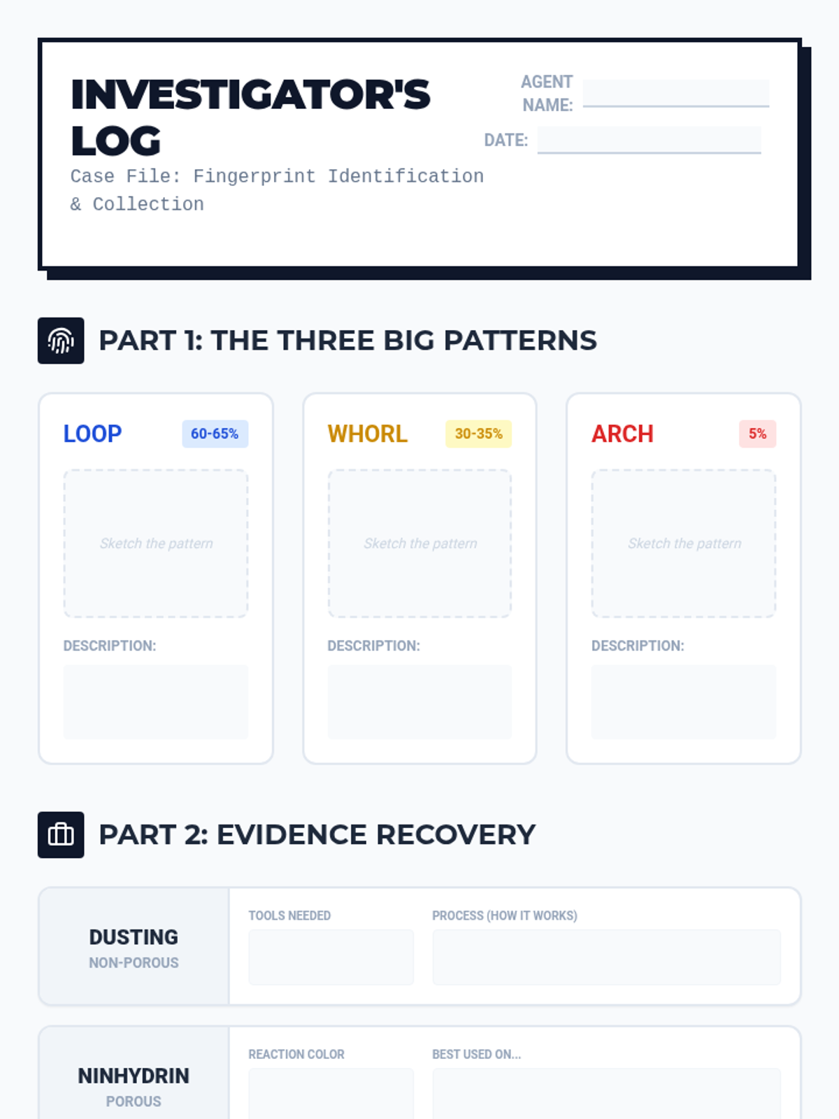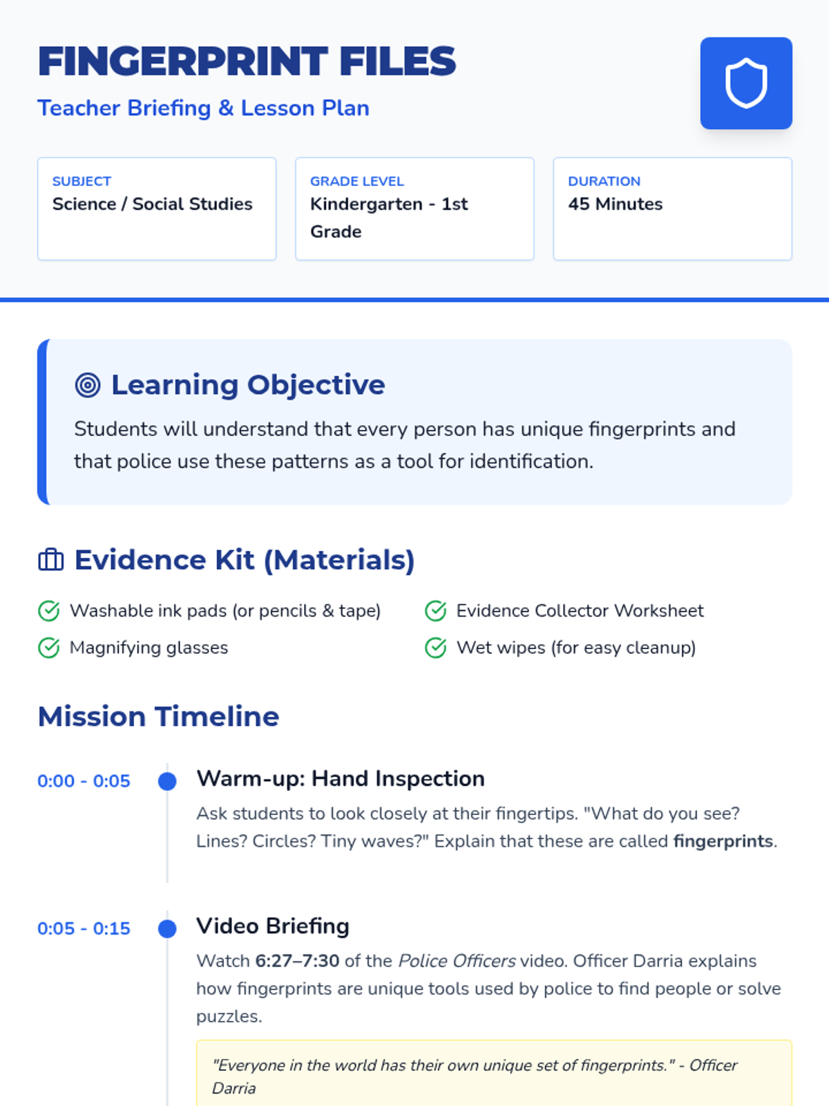 Students explore how fingerprints and DNA help identify people. The lesson uses clear, visual steps to explain identification techniques and Locard's Exchange Principle.