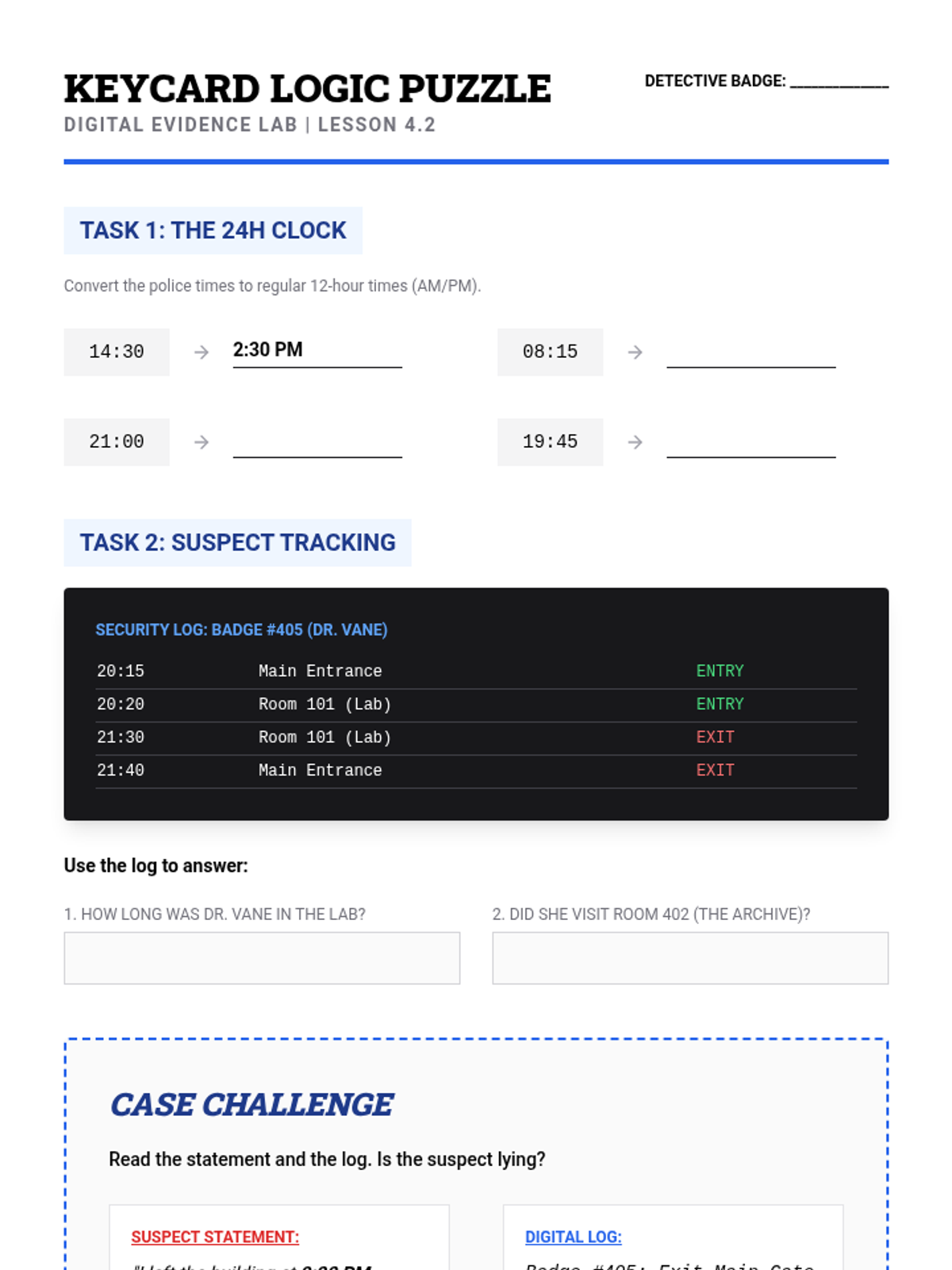 Focuses on reading security logs, understanding time formats (24h vs 12h), and using logic to follow a suspect's movement through keycard data.