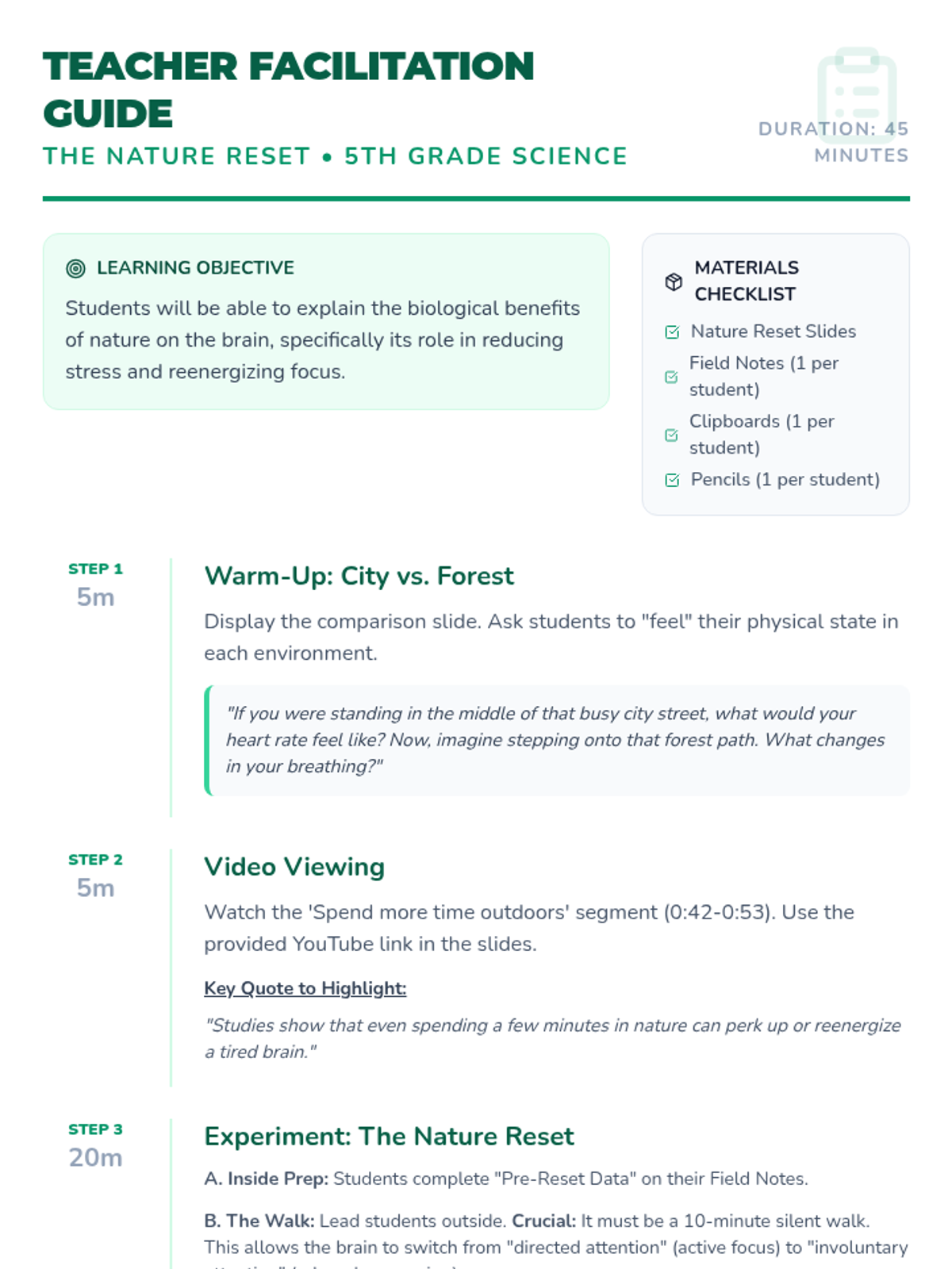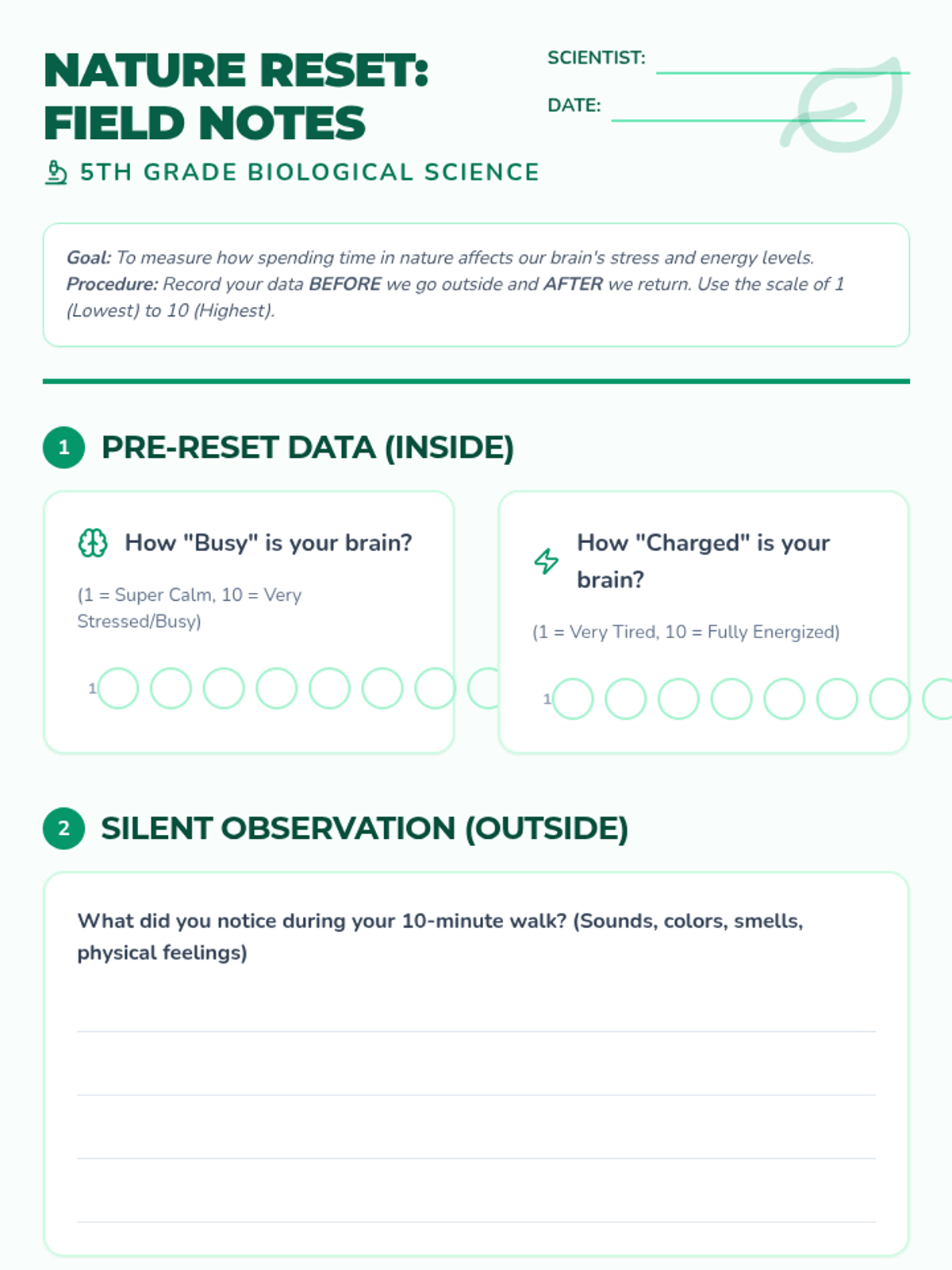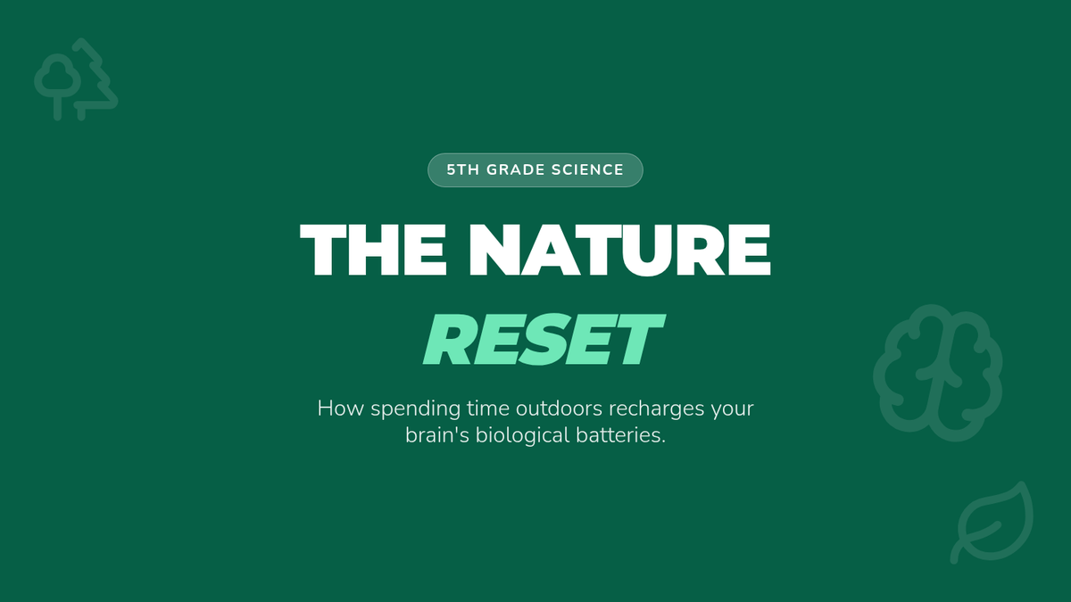 A 5th-grade science lesson exploring the biological impact of nature on the human brain, featuring a hands-on outdoor experiment to measure stress levels.