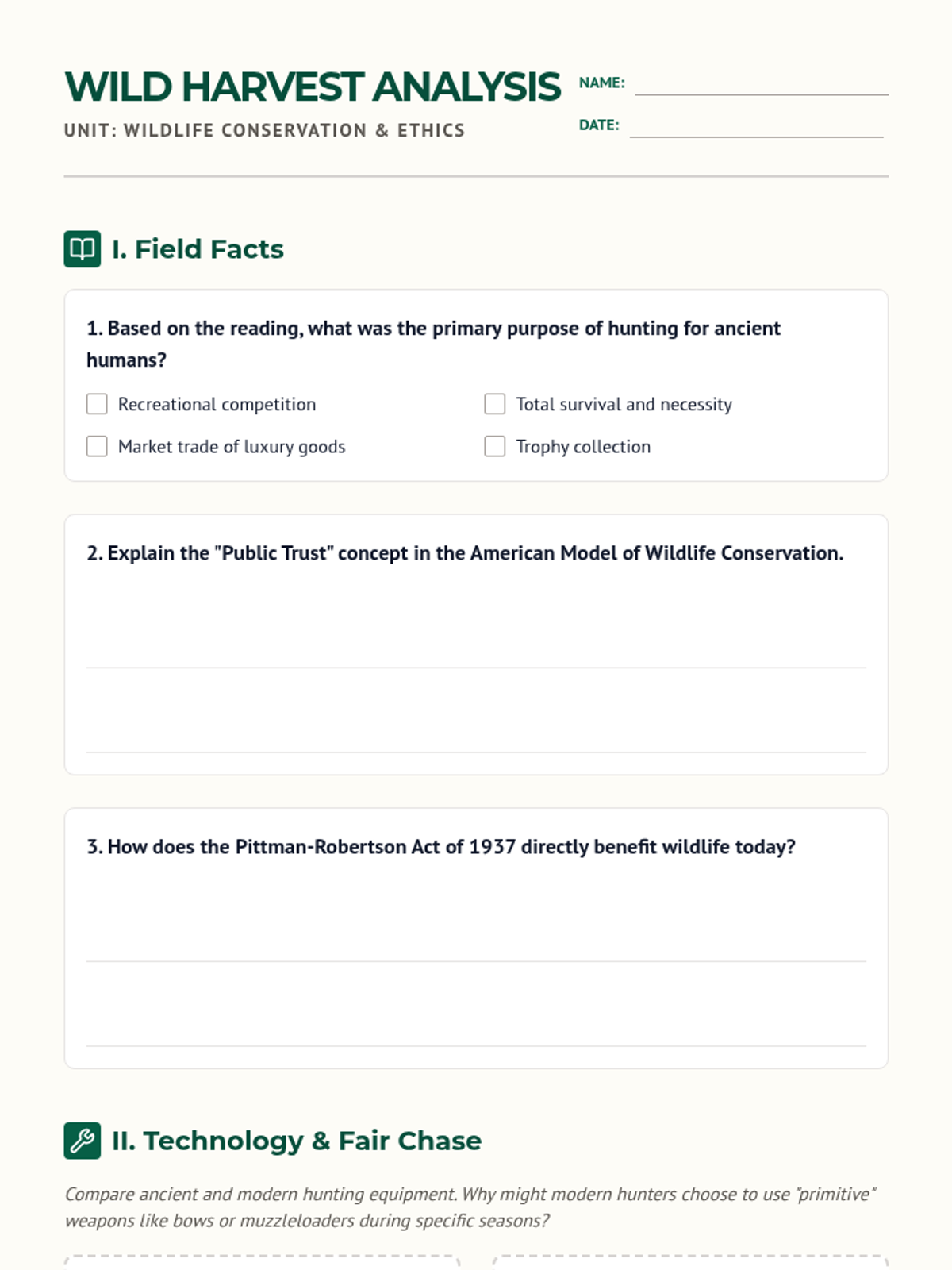 A comprehensive lesson exploring the evolution of hunting from ancient survival to modern conservation, including economic impacts and ethical debates surrounding biodiversity.