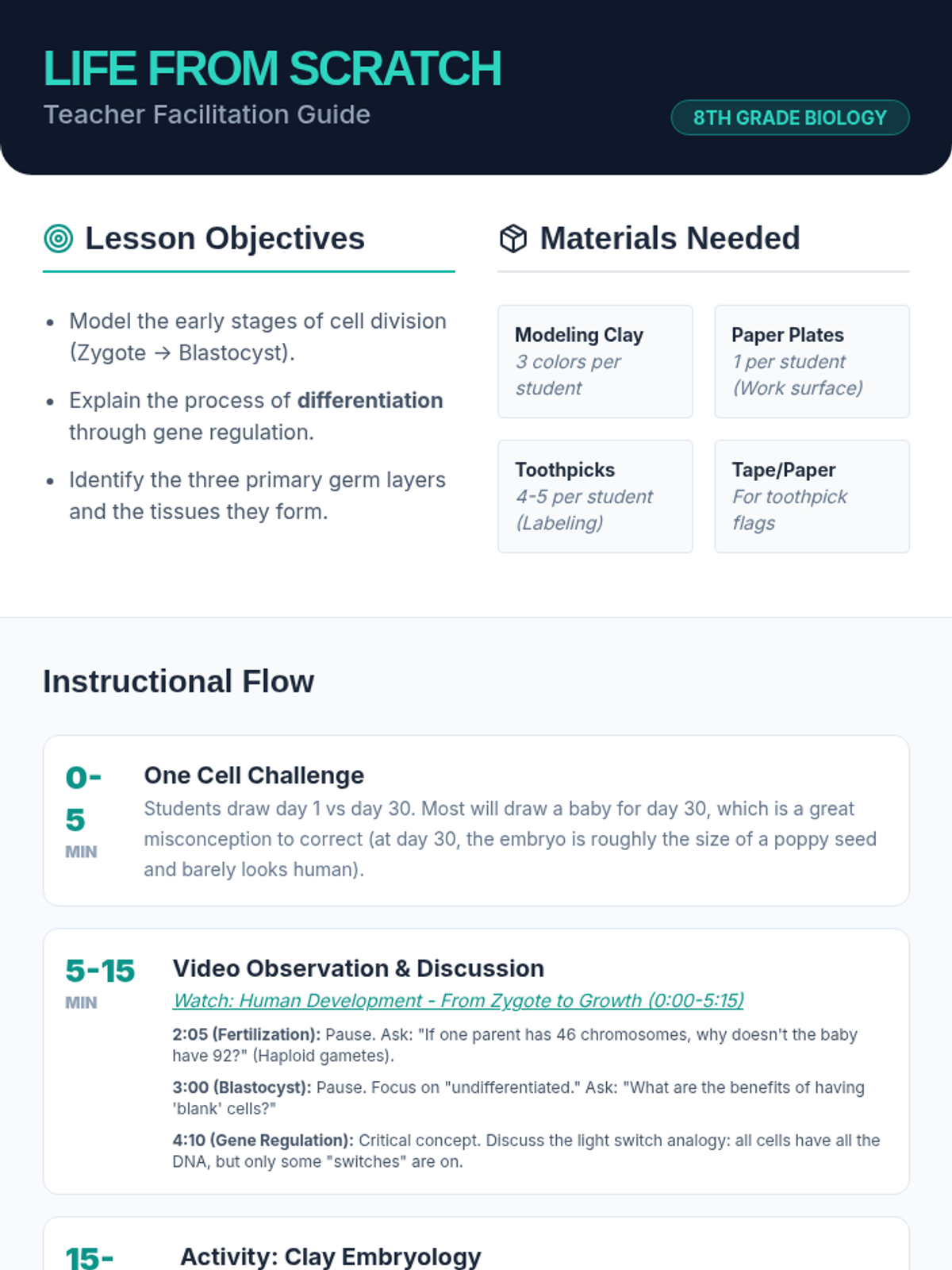 A hands-on biology lesson where students explore the journey from a single zygote to a complex embryo using modeling clay to visualize cell division and the formation of germ layers.