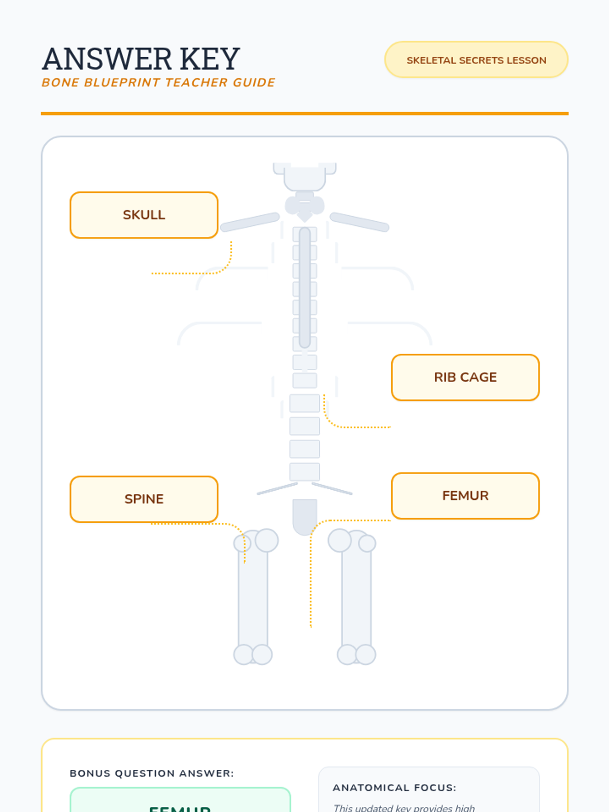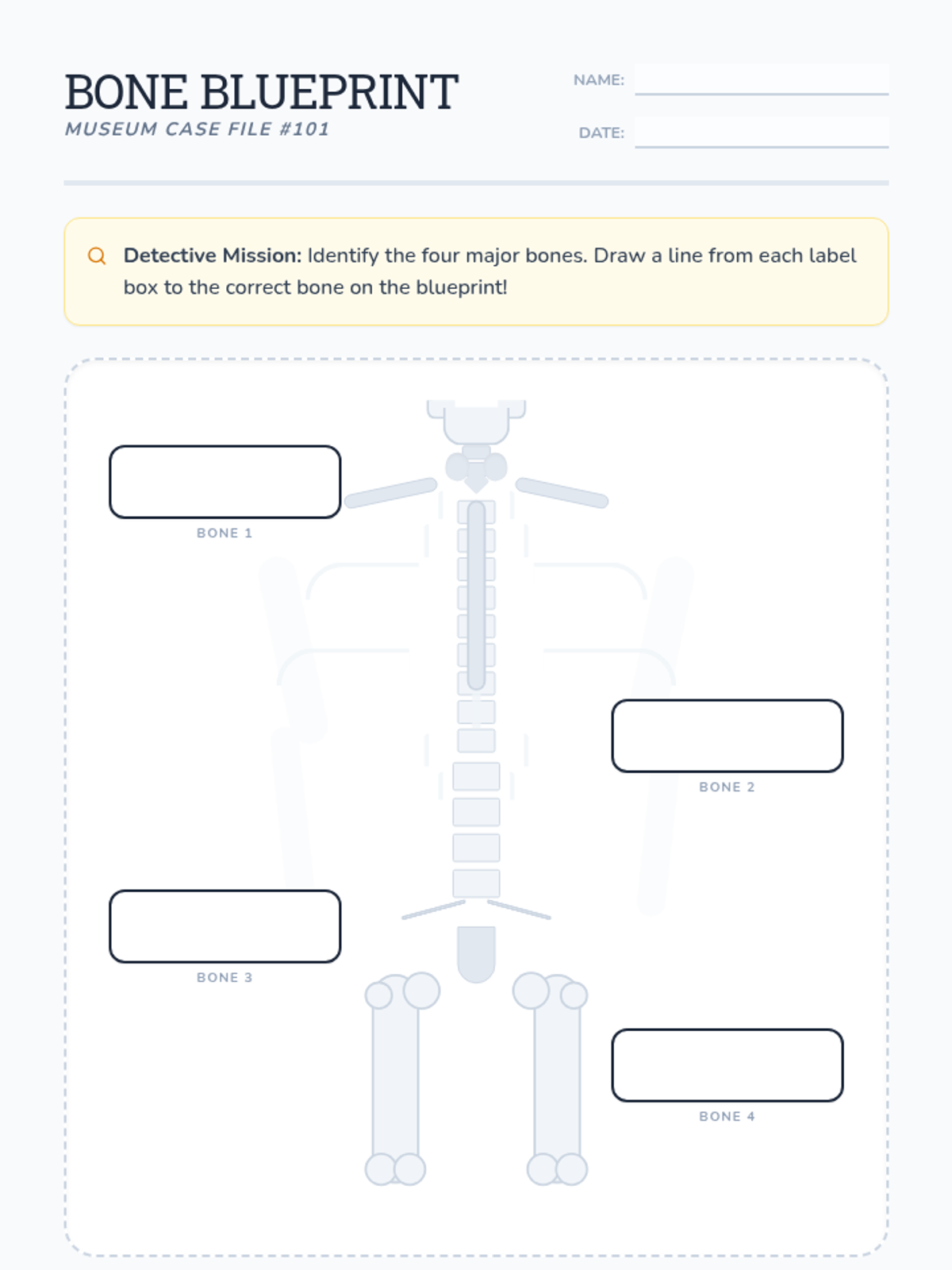 A fun, introductory lesson on the human skeletal system focusing on four major structures: the skull, rib cage, spine, and femur. Students will learn the functions of these bones through a museum-themed presentation and a labeling activity.