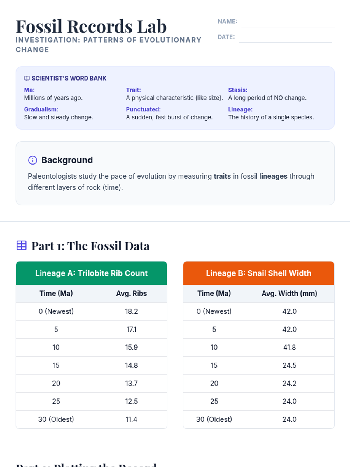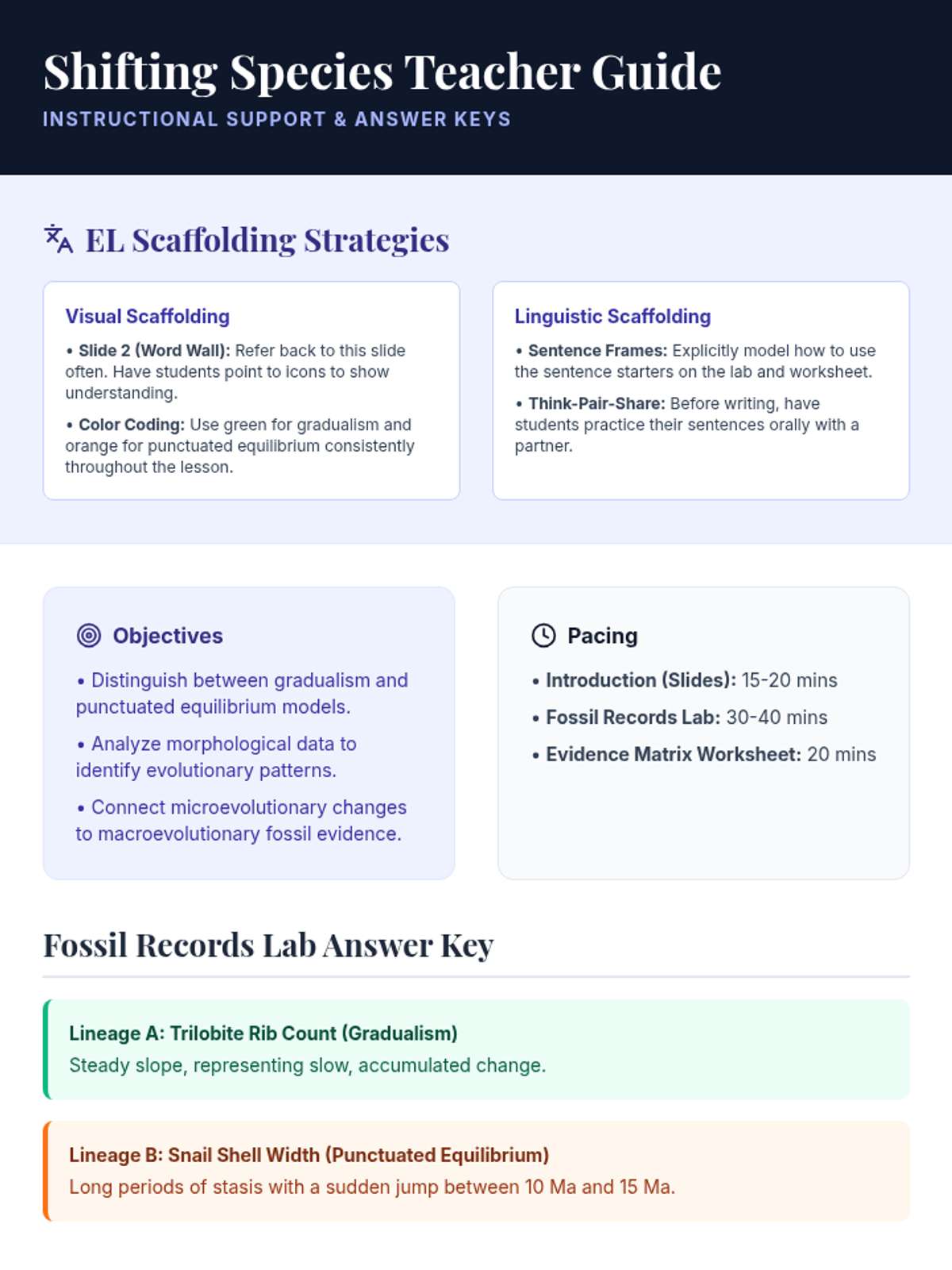 Students explore the pace of evolutionary change through fossil evidence, comparing gradualism and punctuated equilibrium while analyzing multiple lines of evidence for evolution.
