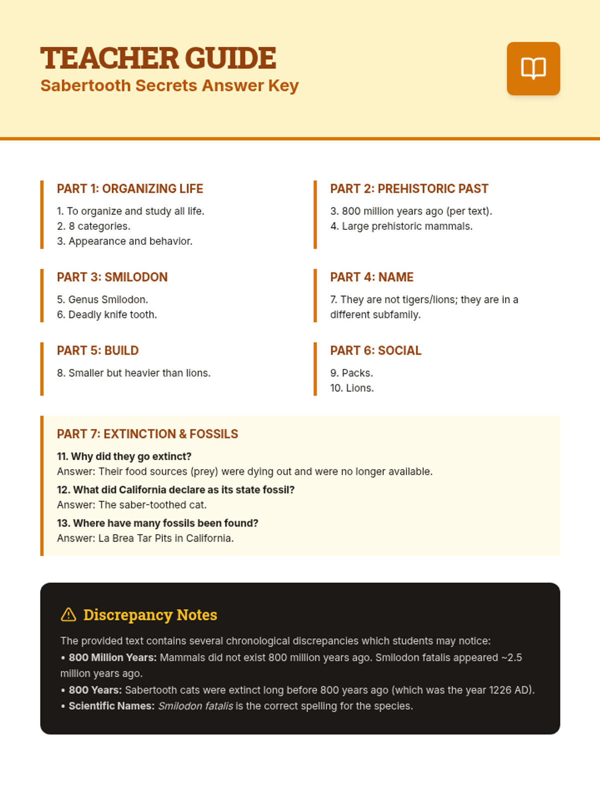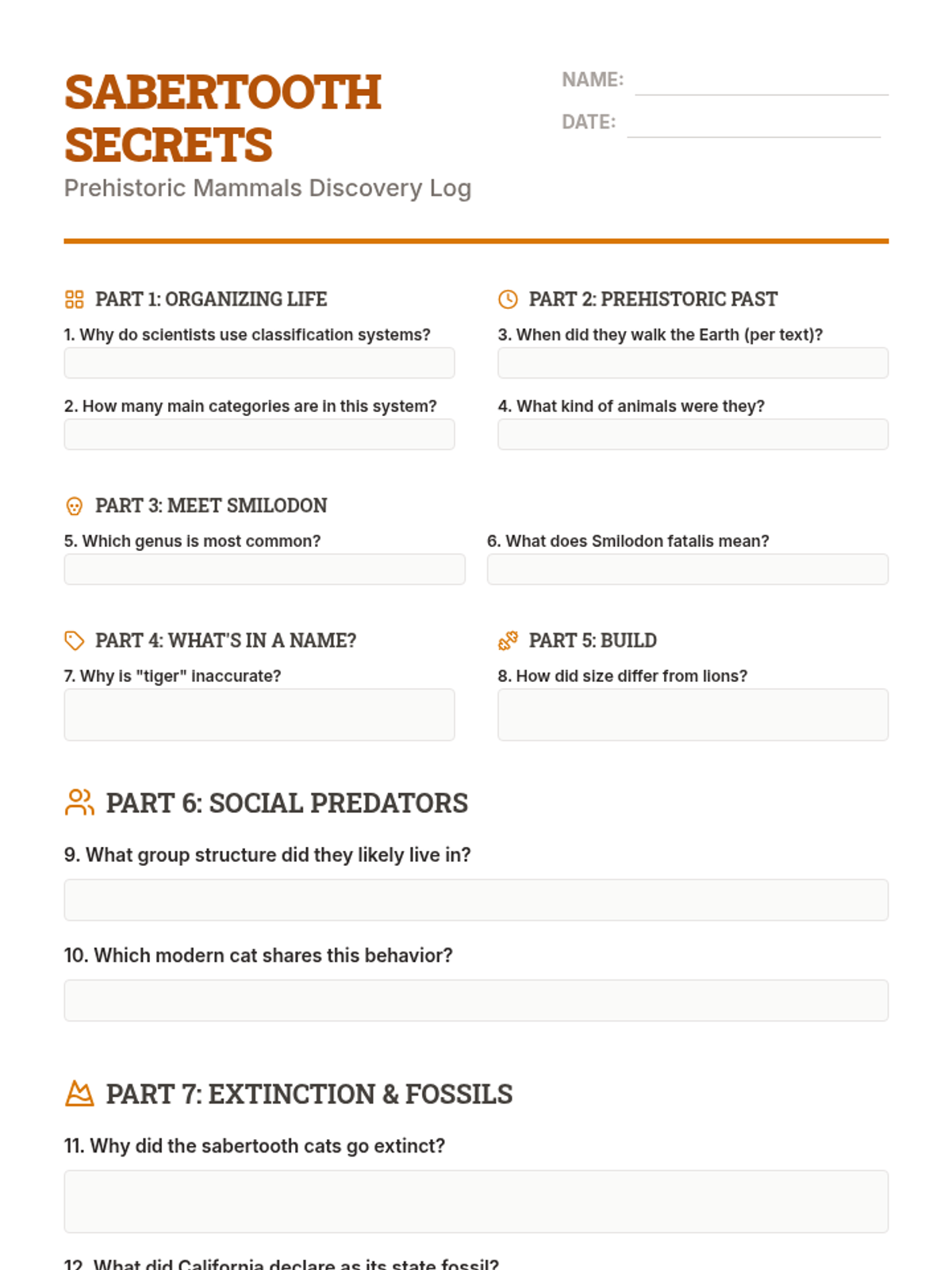 A lesson exploring the characteristics, classification, and social behavior of prehistoric Sabertooth cats.