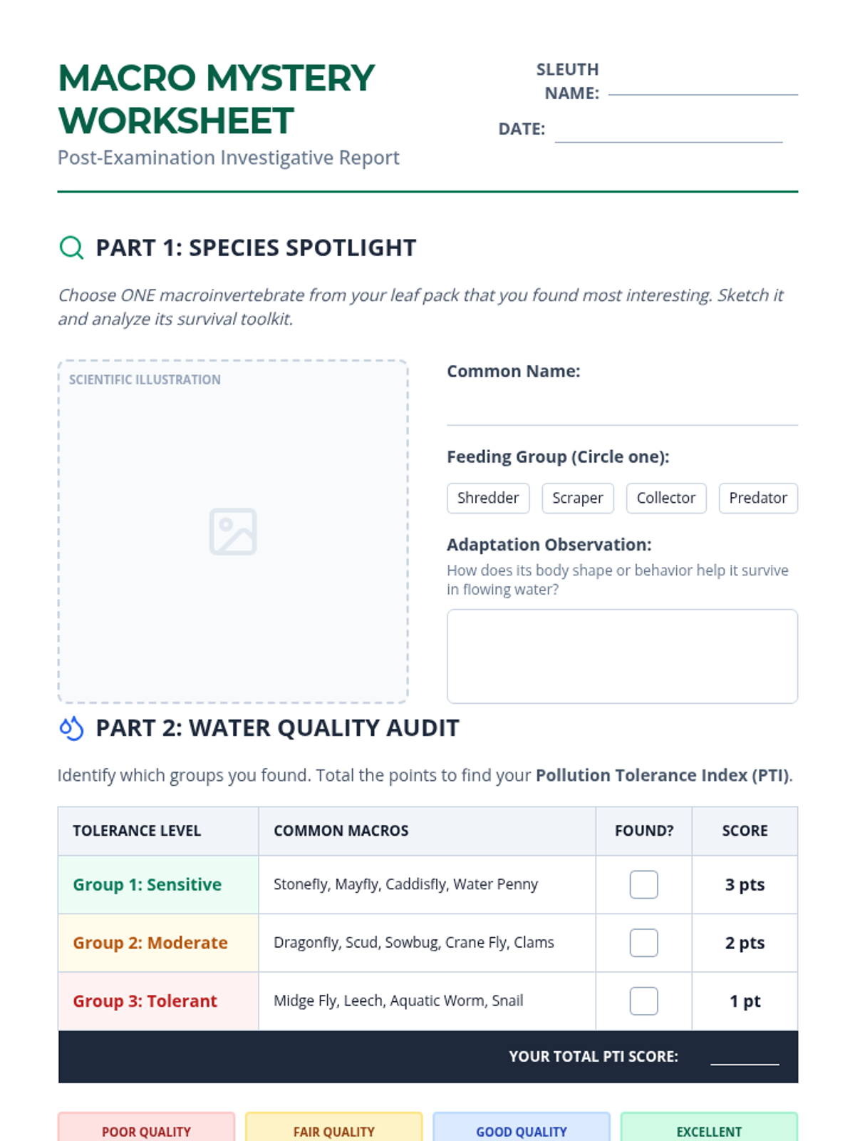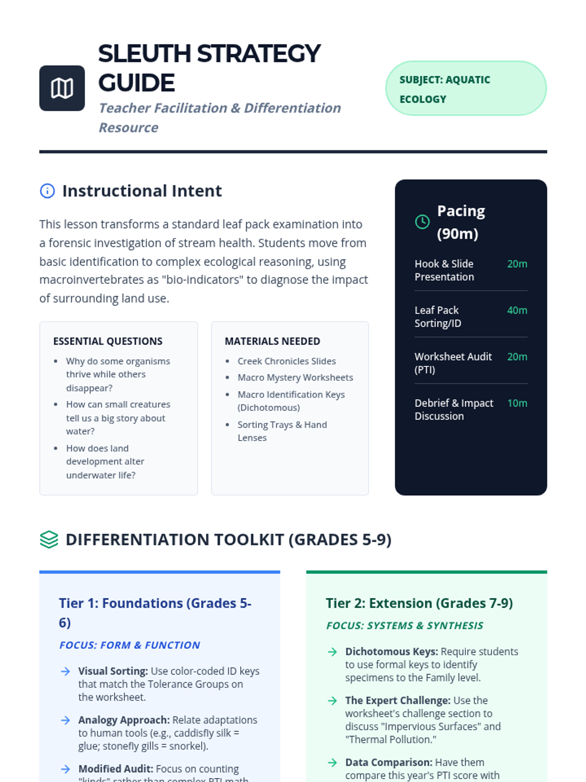A comprehensive lesson investigating aquatic ecosystems through leaf pack analysis. Students identify macroinvertebrates, explore their specialized adaptations, and evaluate how human activities impact water quality and biodiversity.