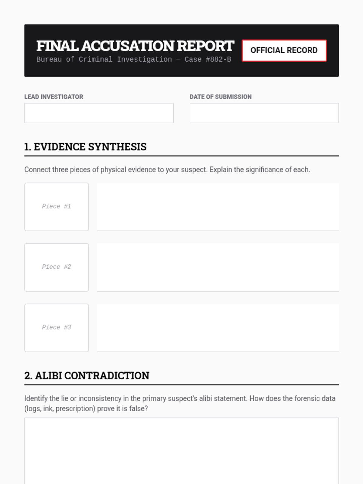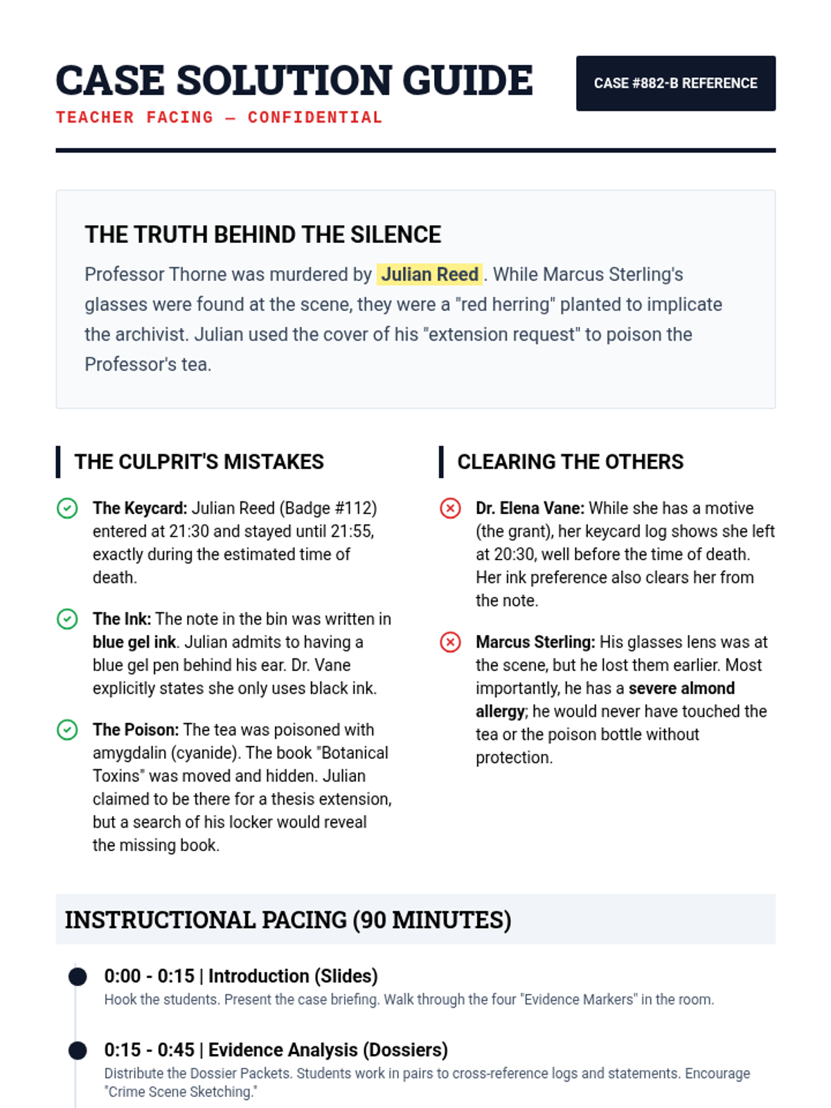 A 90-minute immersive murder mystery experience where students apply forensic techniques to solve the death of a prominent professor. They will analyze evidence, evaluate witness statements, and build a case based on deductive reasoning.
