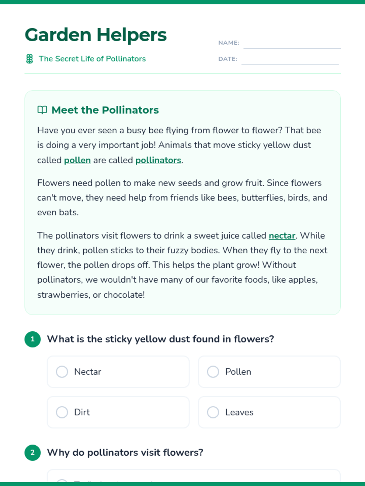Students will learn about the vital role of pollinators in our ecosystem through a short reading passage and independent comprehension activities.