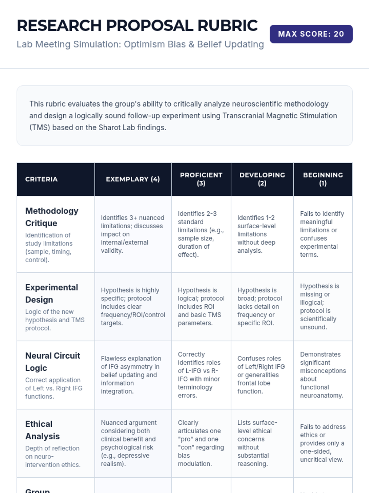This lesson explores the neurological basis of the optimism bias, focusing on the role of the Inferior Frontal Gyrus in belief updating. Students analyze fMRI and TMS data from Tali Sharot's research and simulate a research group to design follow-up experiments while critiquing current neuro-intervention methodologies.