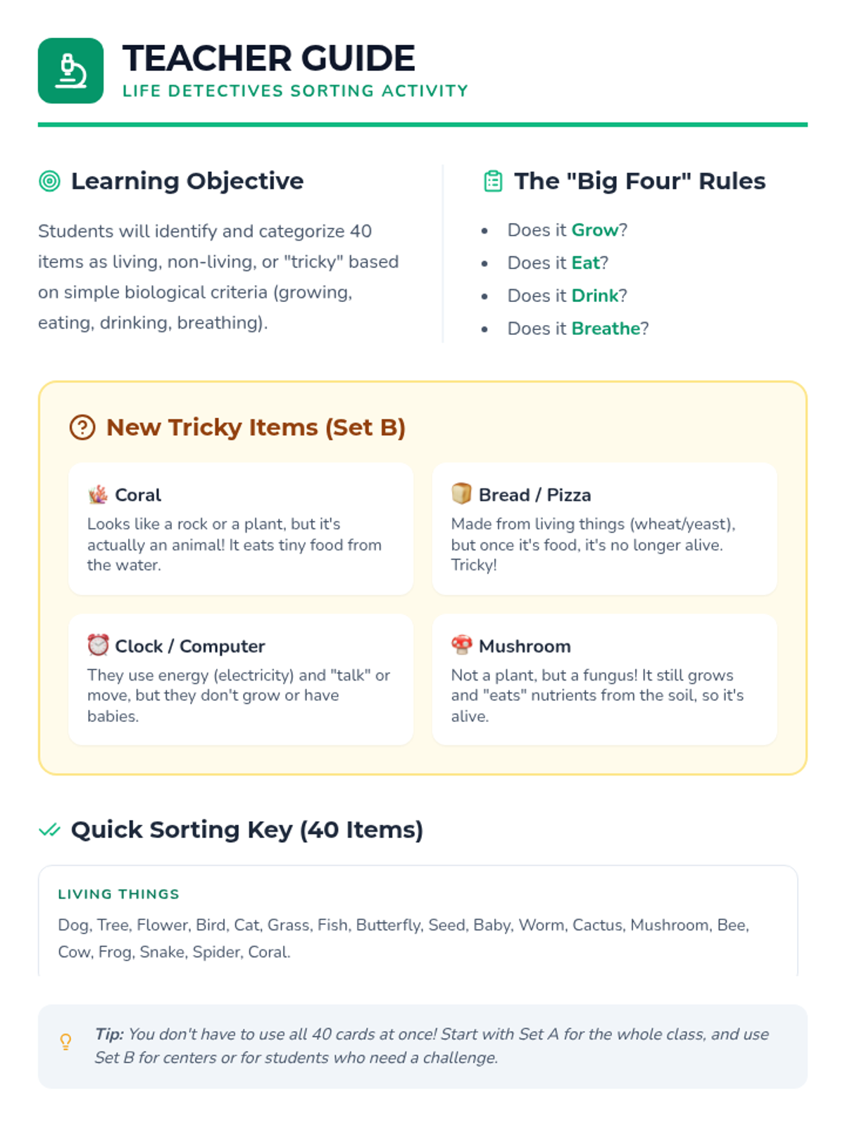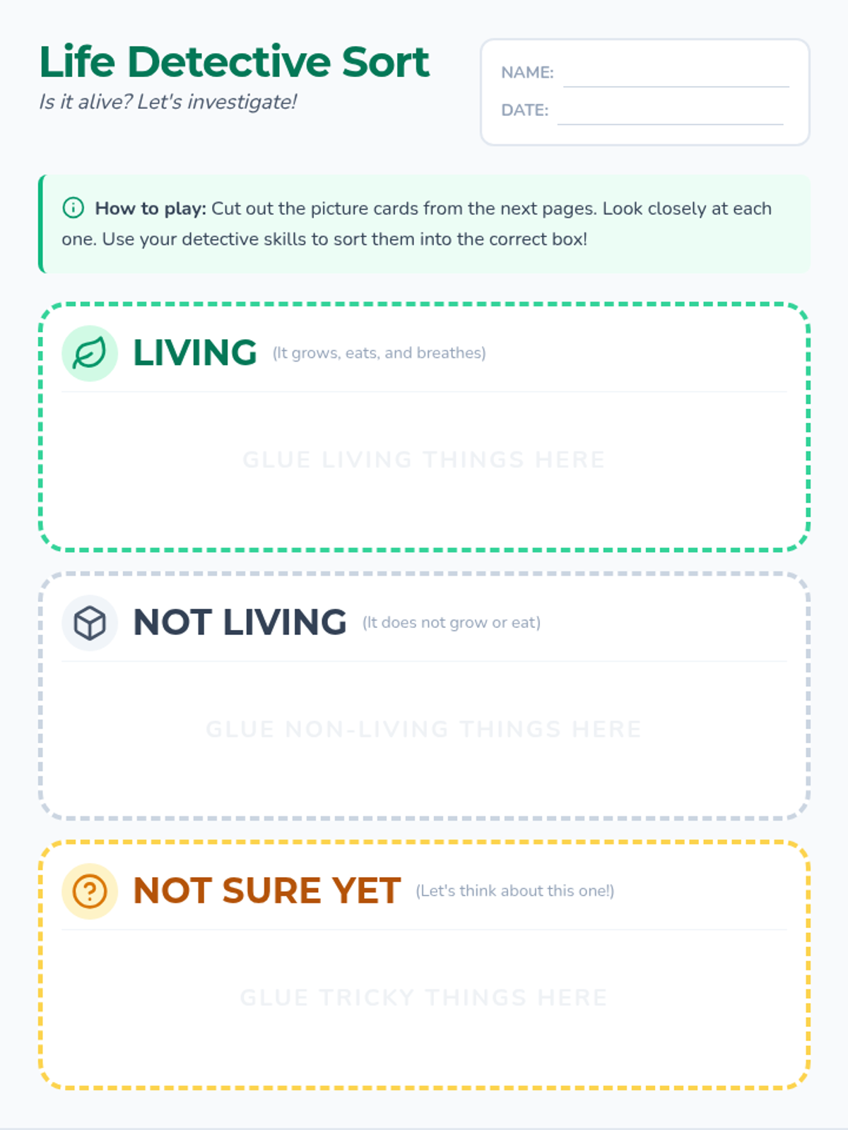 A kindergarten lesson exploring the characteristics of living things through observation and sorting. Students use 'detective skills' to categorize items and discuss tricky cases like seeds and fire.