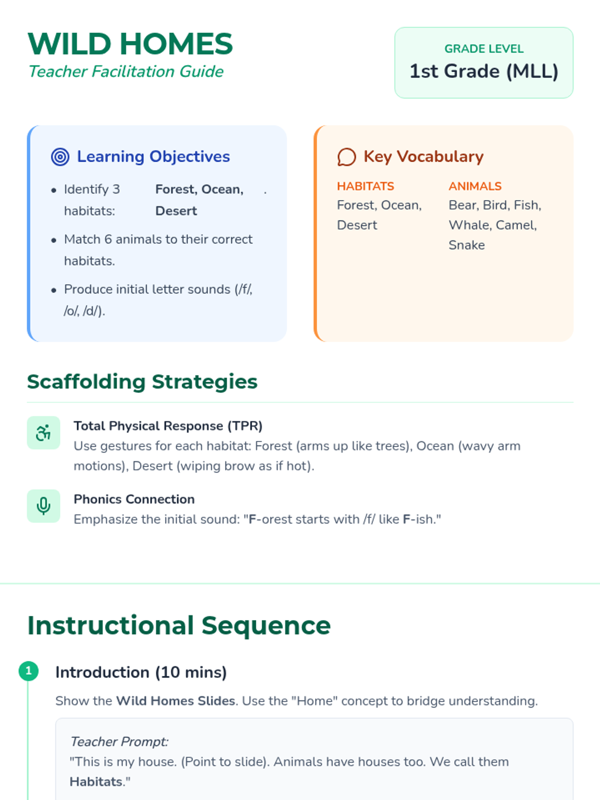 A foundational MLL lesson for 1st grade students focused on oral language and visual recognition of animals and their habitats (Forest, Ocean, Desert). The lesson emphasizes Total Physical Response (TPR), visual matching, and basic phonics connections.