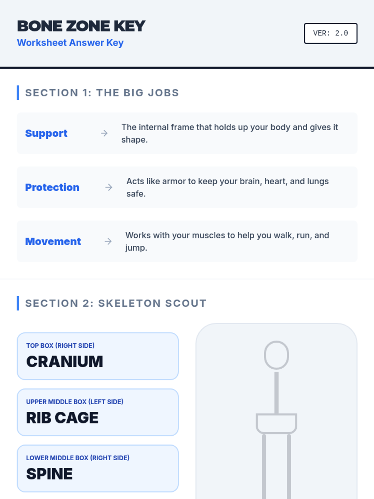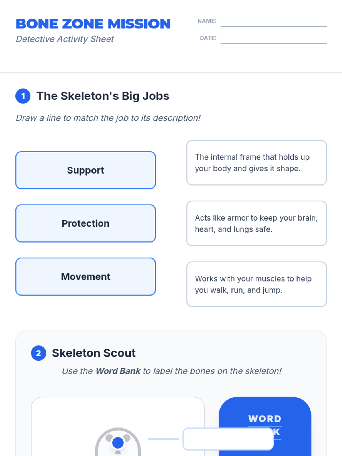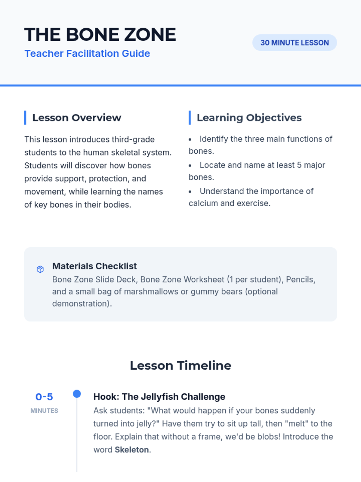 A quick 30-minute introduction to the skeletal system, focusing on its main functions and the names of key bones in the human body. Students will explore how their 'internal frame' helps them move and stay protected.