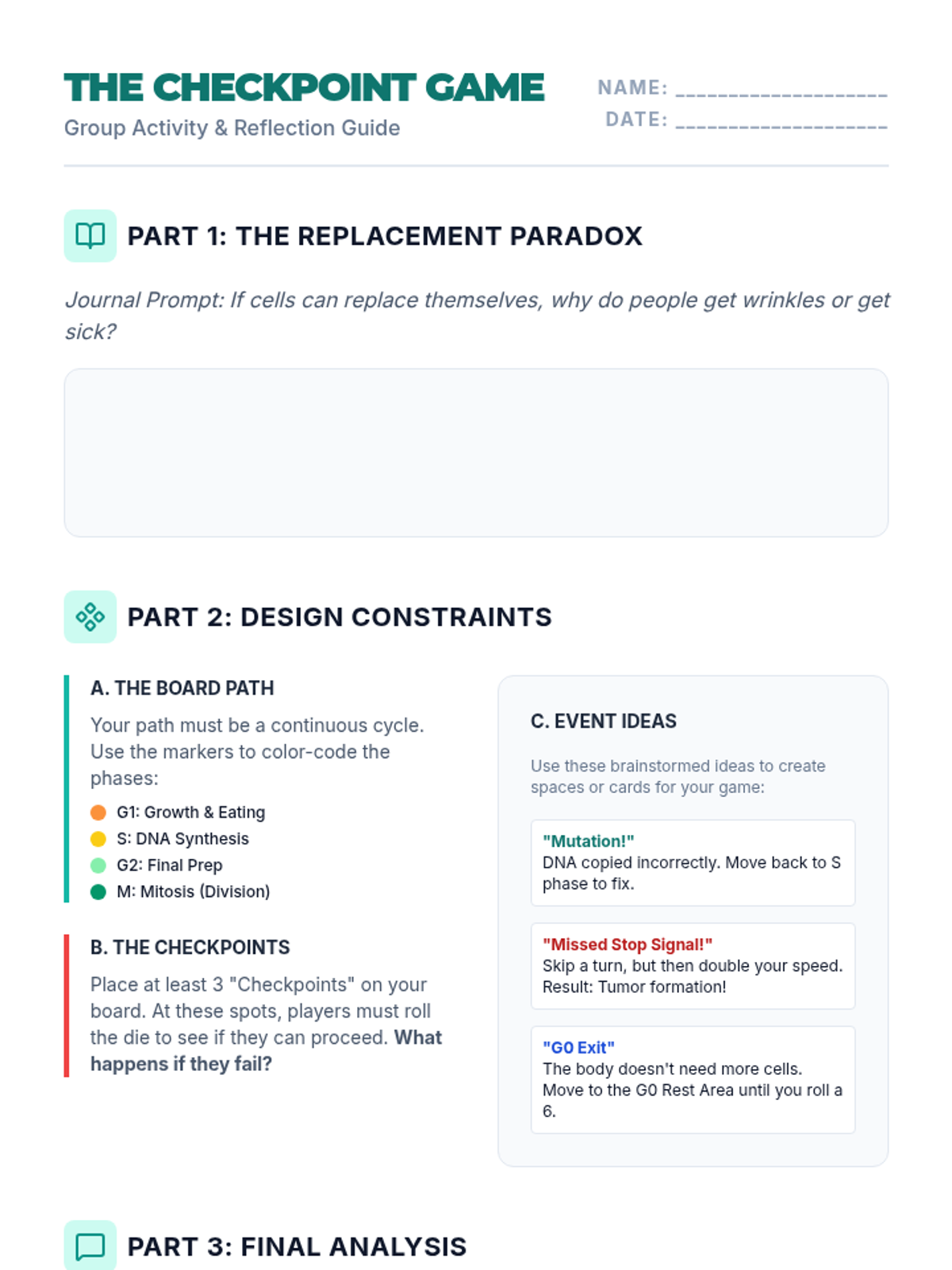 A high school biology lesson exploring how cell cycle checkpoints prevent cancer and how DNA copying errors lead to aging, featuring a creative game design activity.