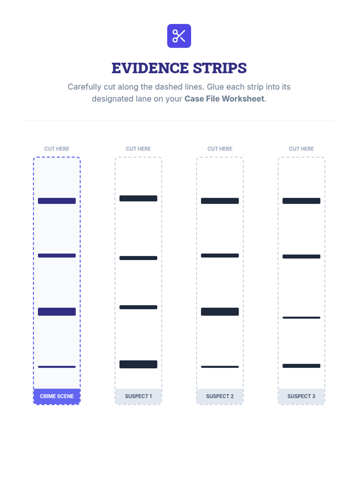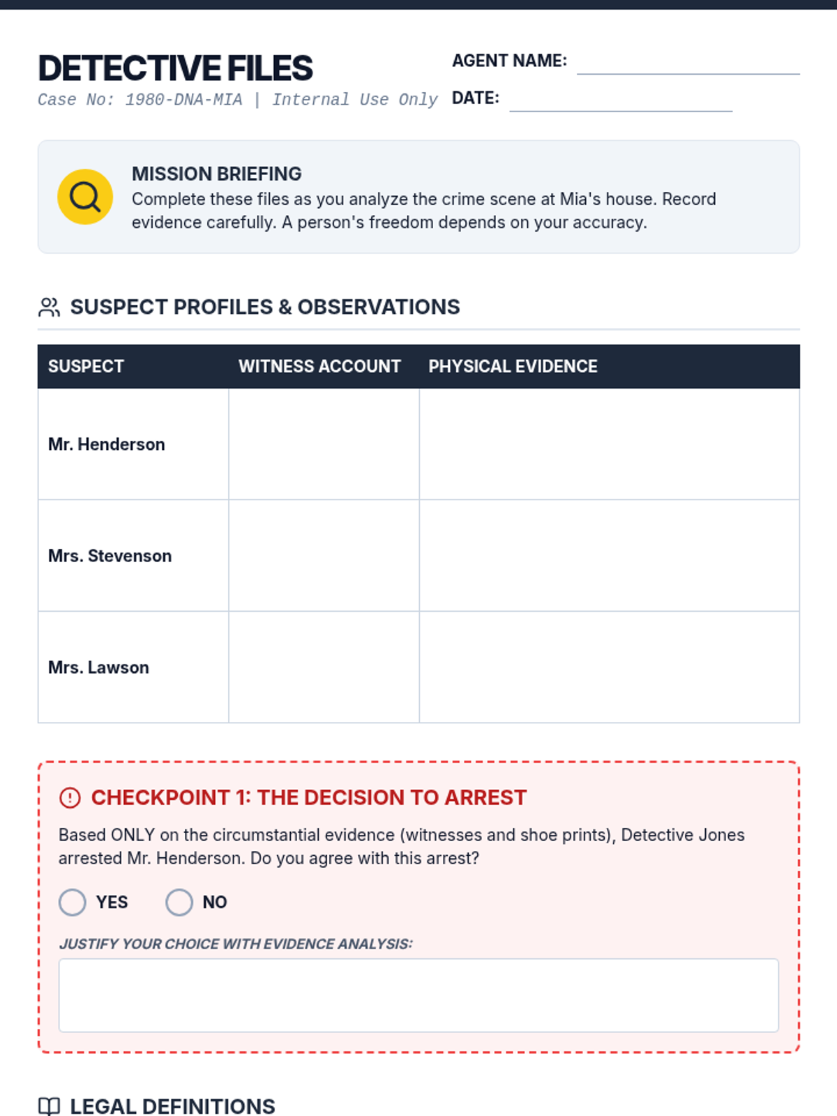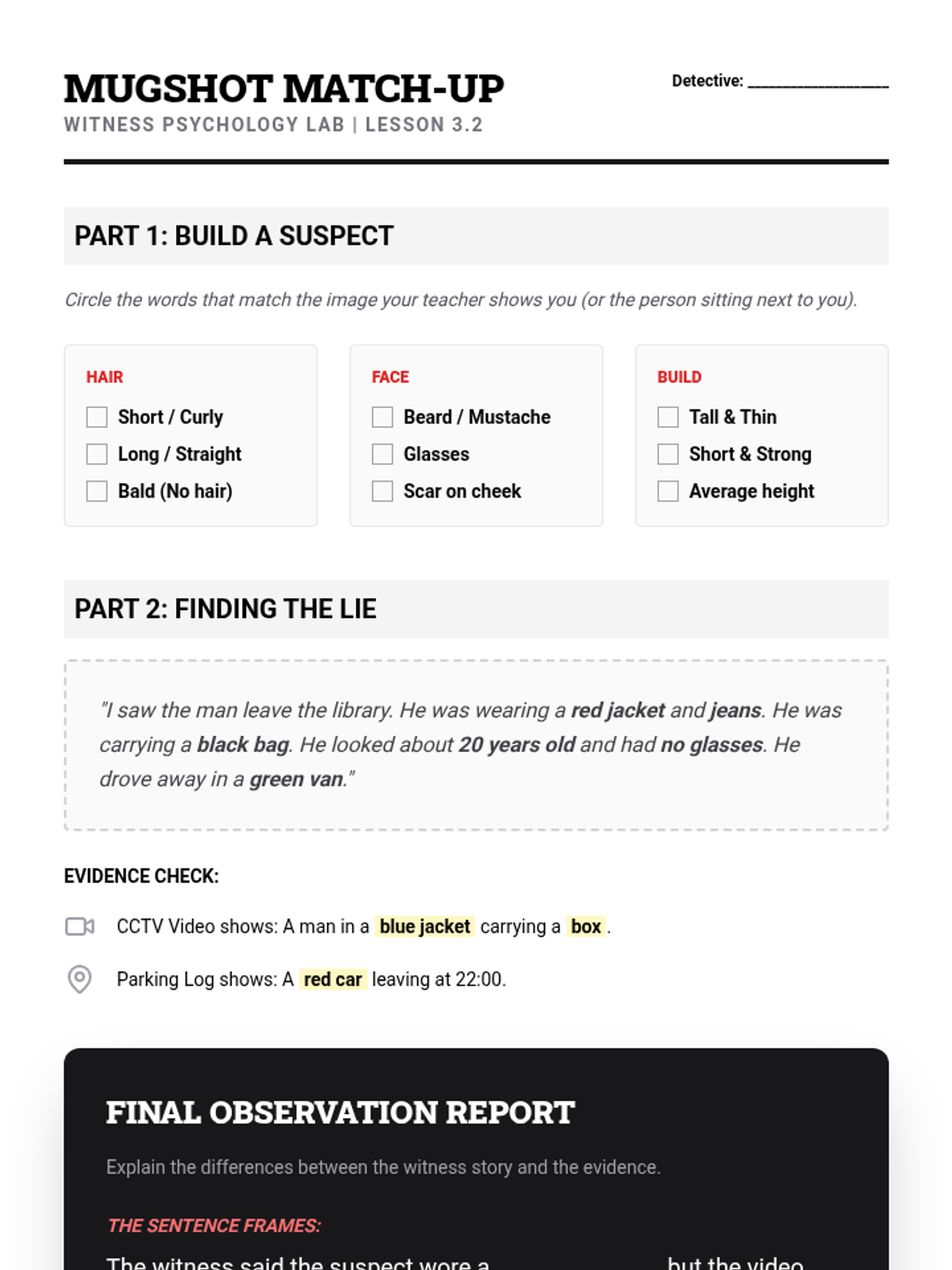 Focuses on descriptive language, memory reliability, and the 'mugshot' process. Students learn to describe suspects and identify inconsistencies in witness stories.