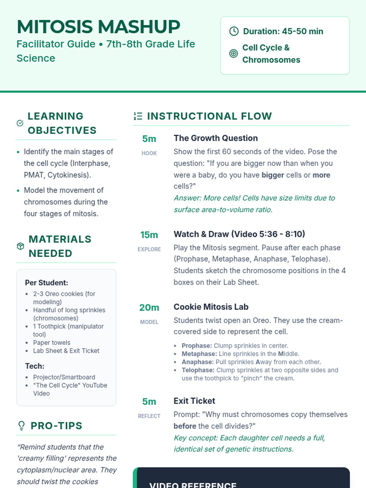 A hands-on Life Science lesson where students explore the cell cycle through video analysis and a tactile 'Cookie Mitosis' activity using Oreos and sprinkles to model chromosome movement.