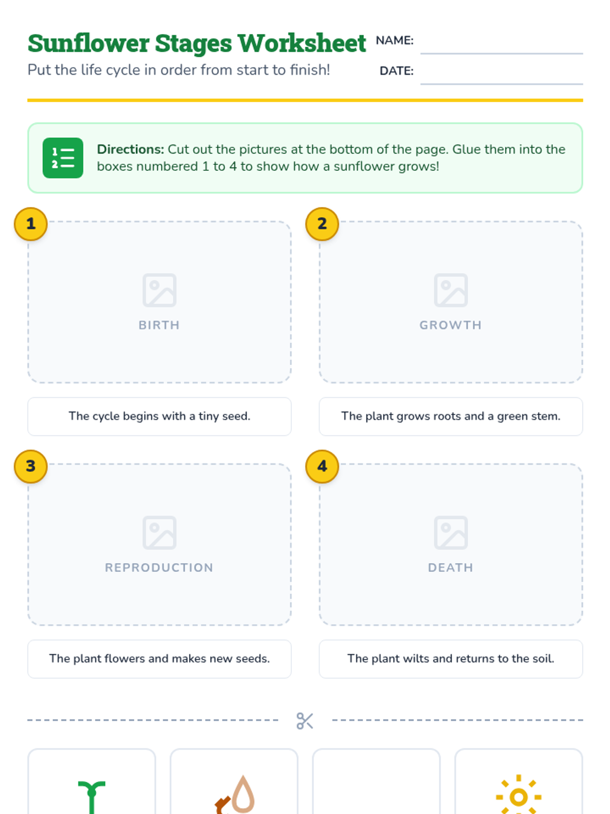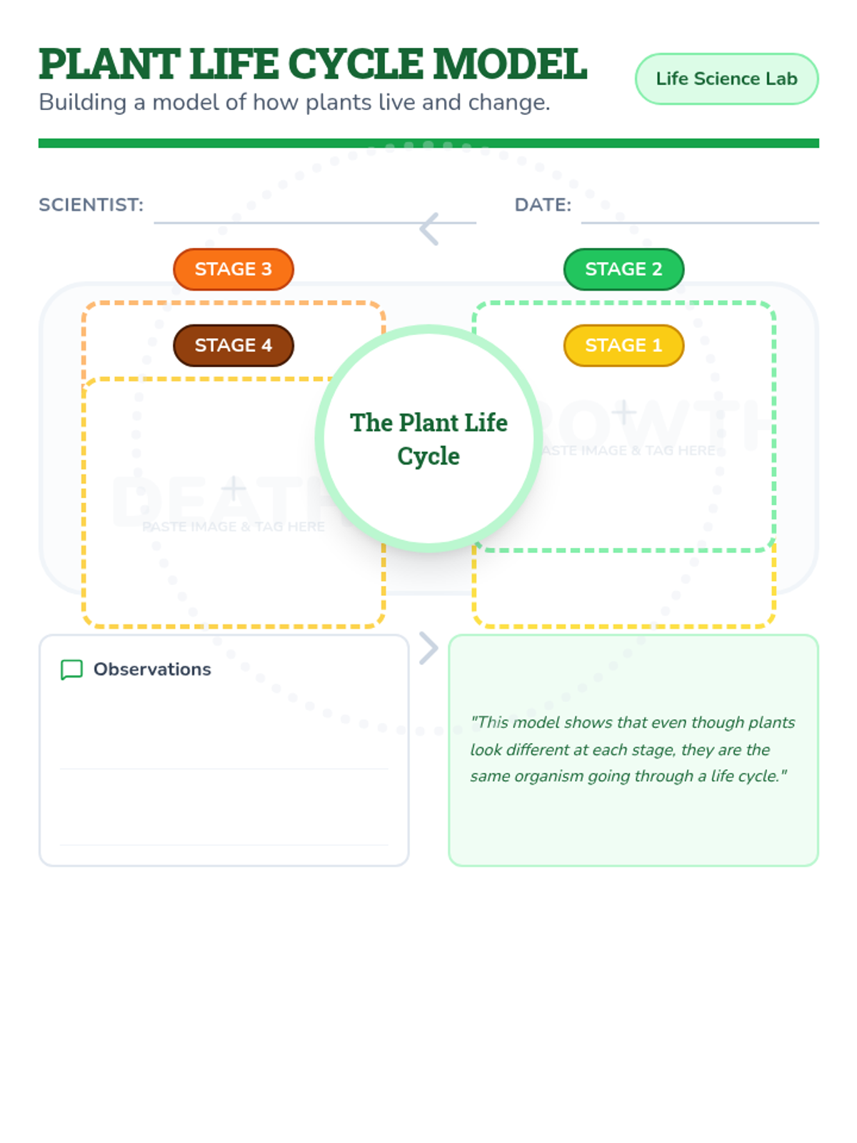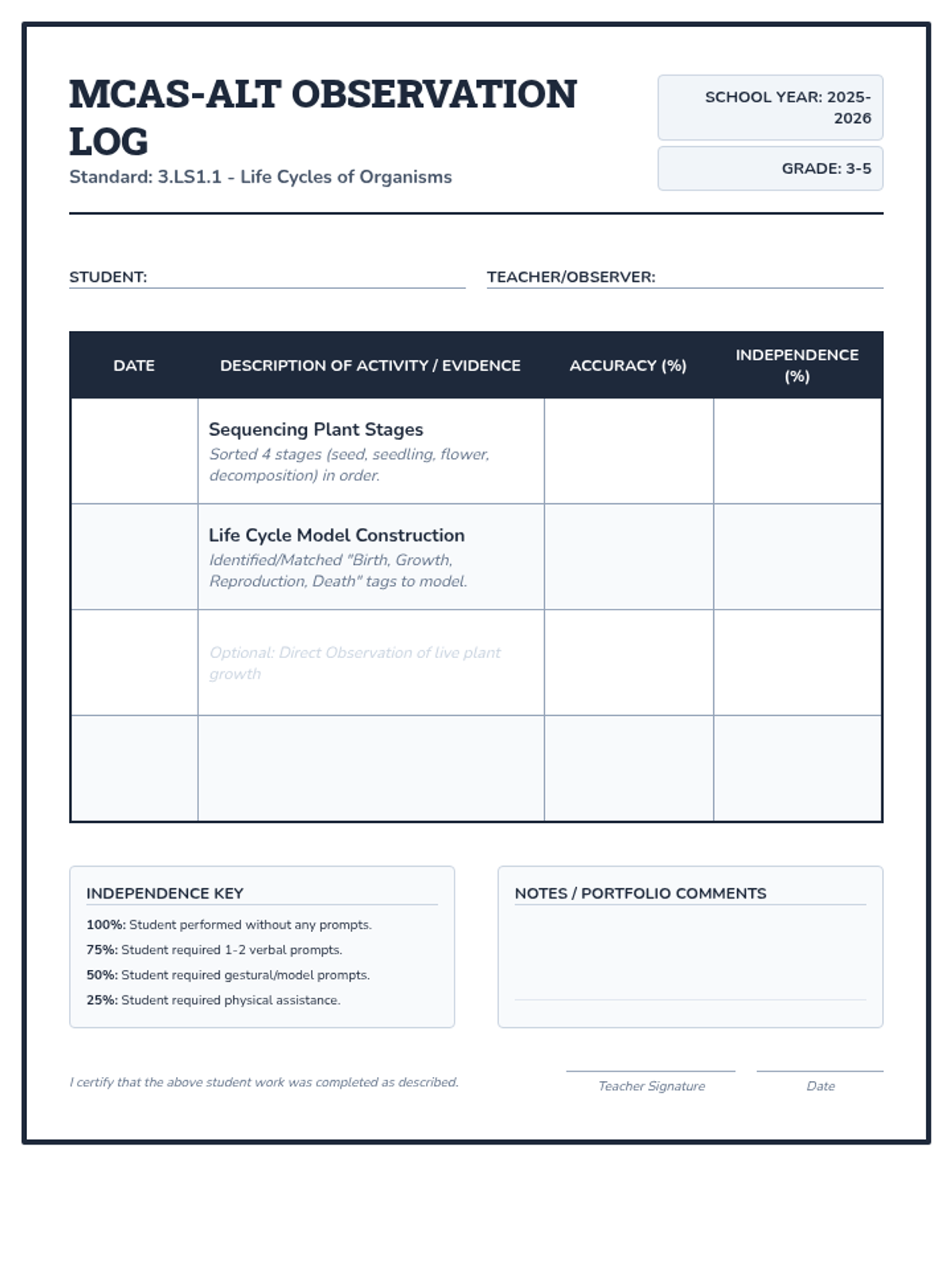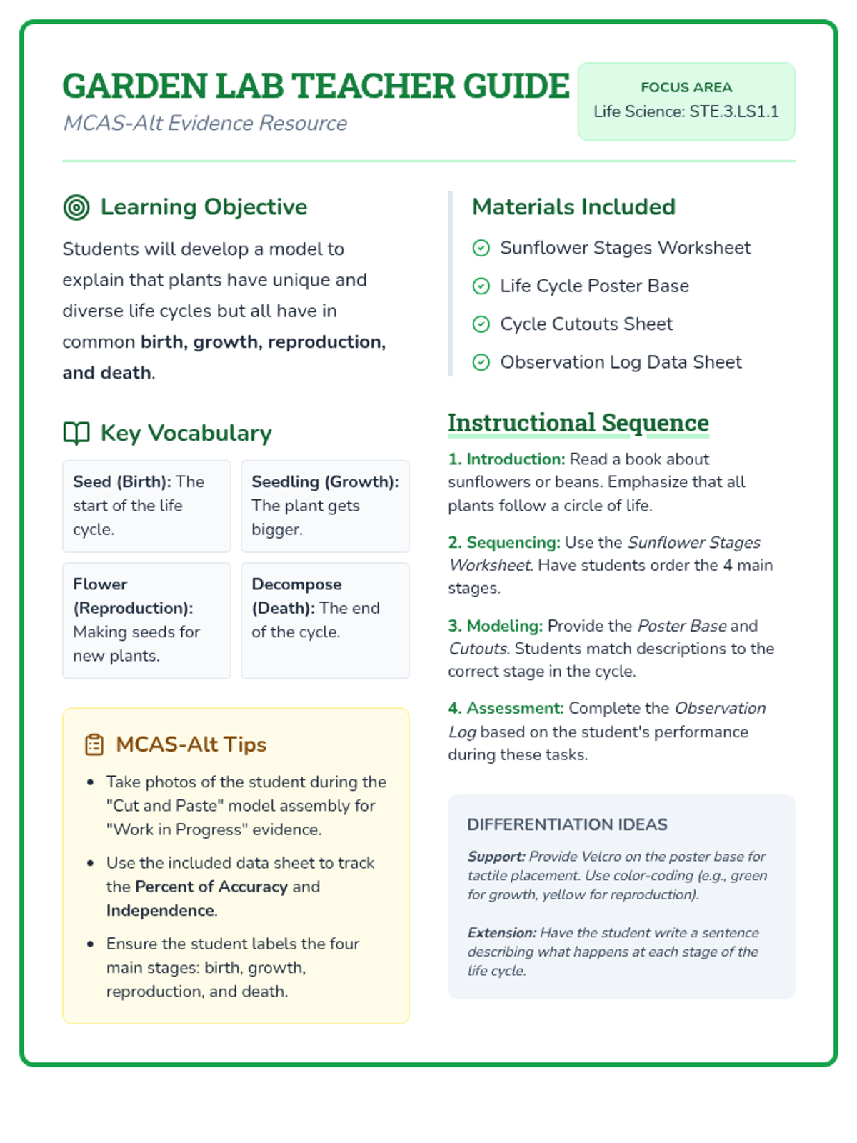A comprehensive set of materials designed for MCAS-Alt portfolios, focusing on the plant life cycle (birth, growth, reproduction, and death) through sequencing and model-building.