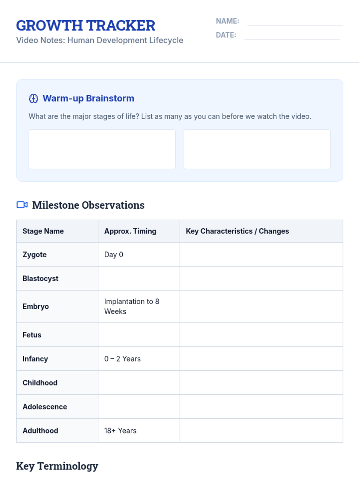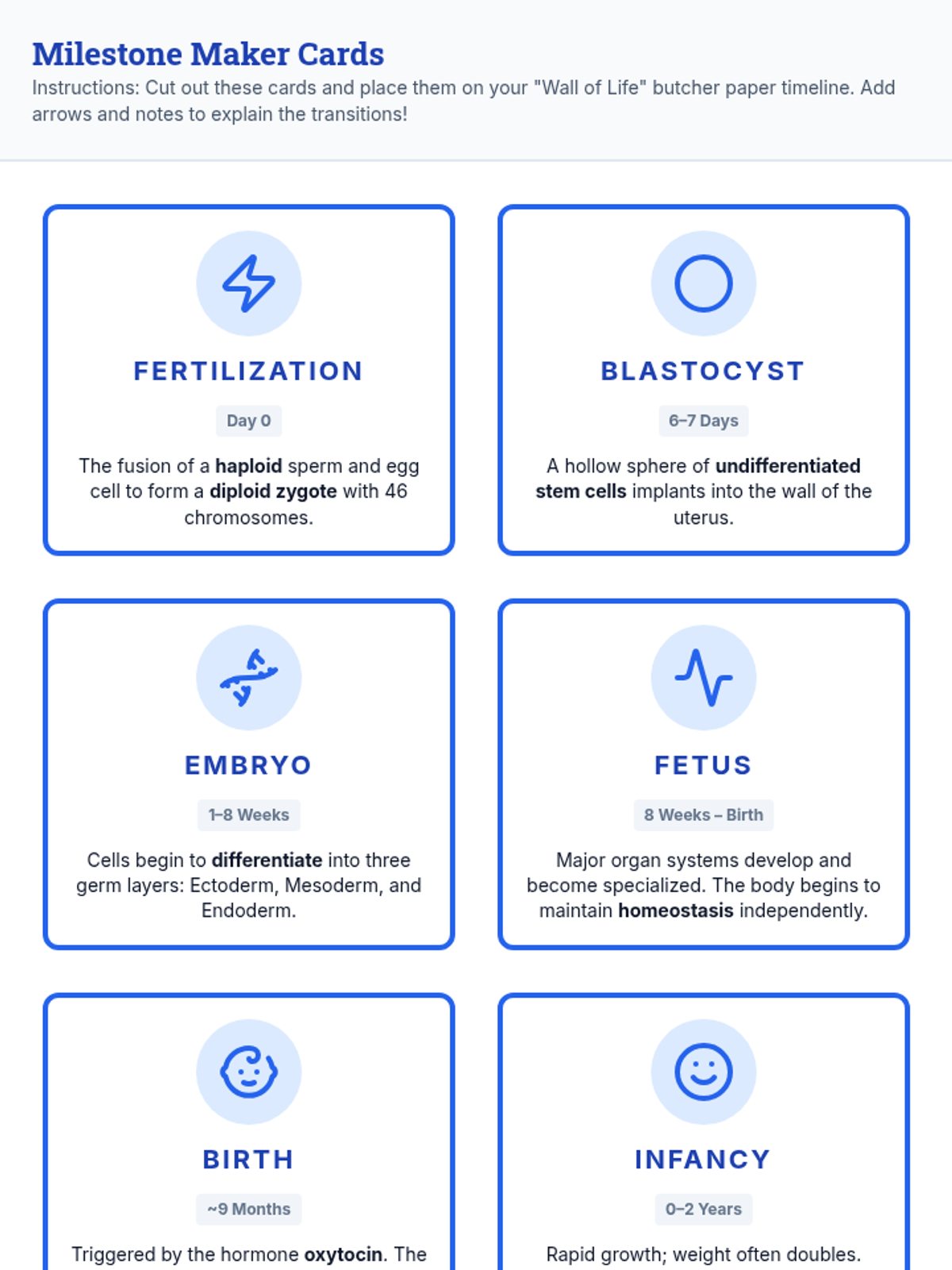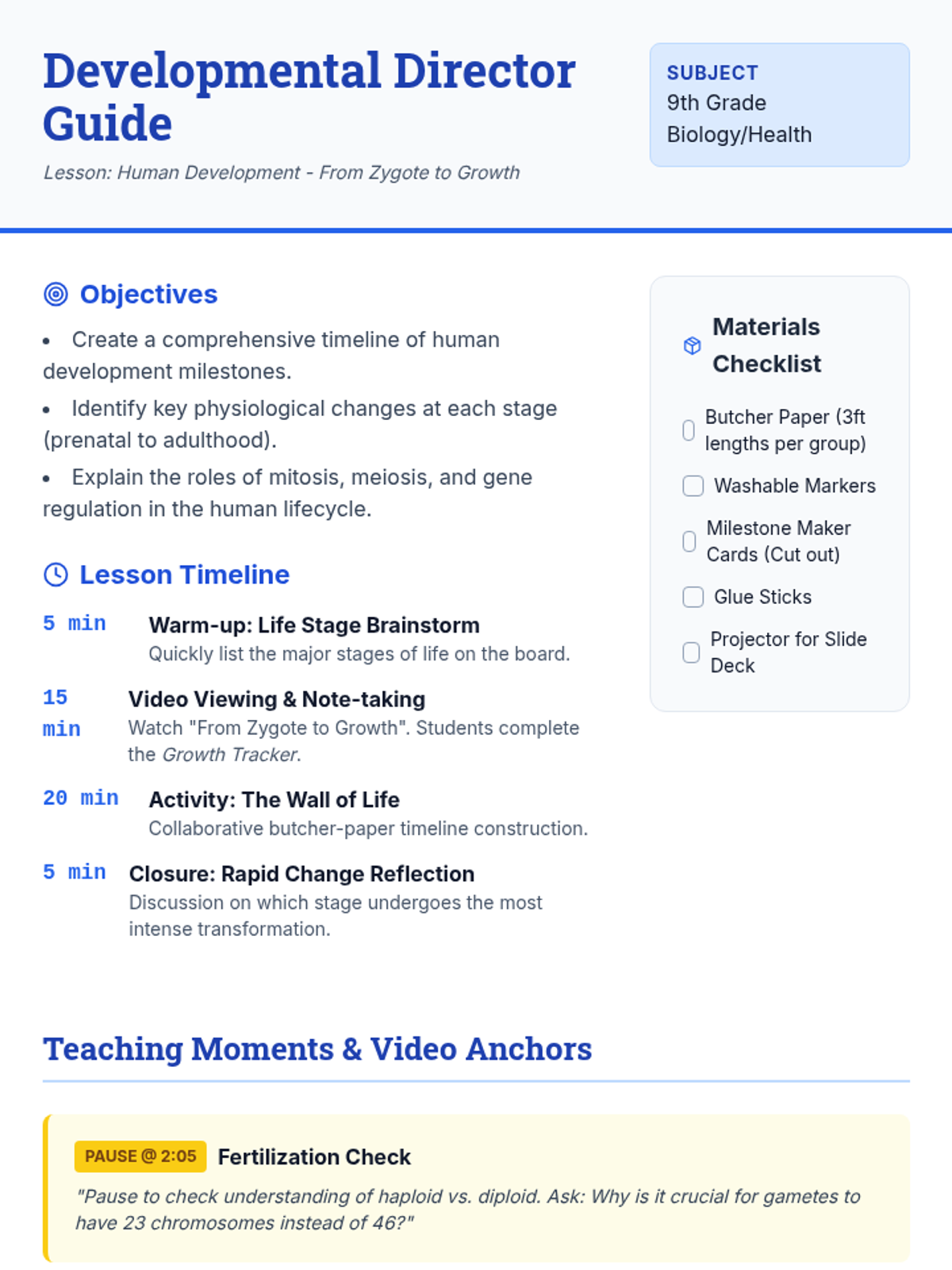 This lesson explores the biological timeline of human development from fertilization through adulthood. Students will watch a detailed video, take notes on physiological changes, and collaborate on a large-scale visual timeline to identify key developmental milestones.
