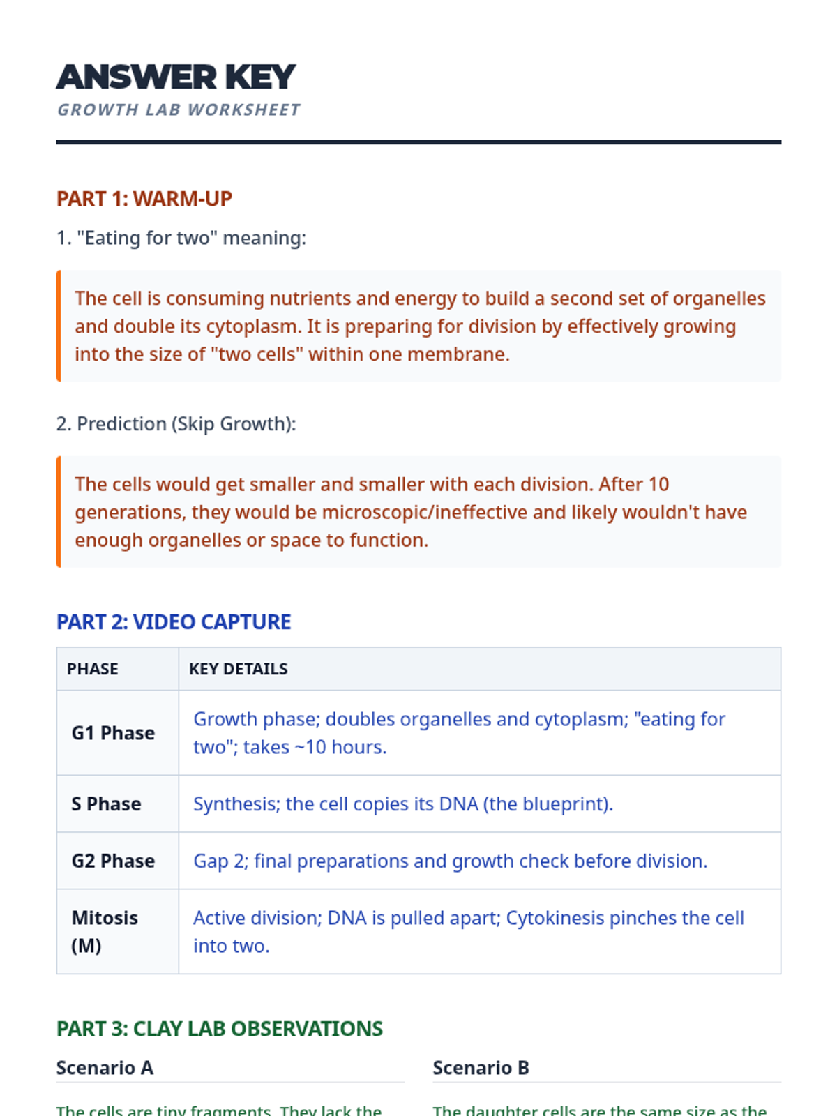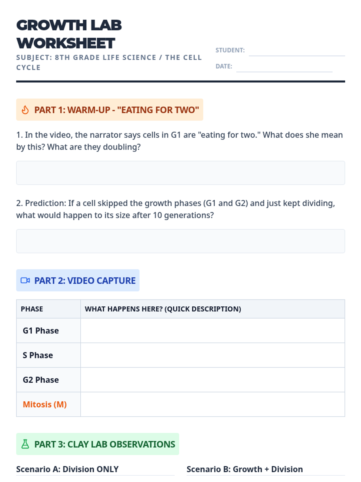 This lesson explores the cell cycle with a specific focus on the difference between cell growth in Interphase (G1/G2) and physical division in Mitosis (M). Students use clay modeling to visualize why a cell must 'eat for two' before it can successfully split into functional daughter cells.