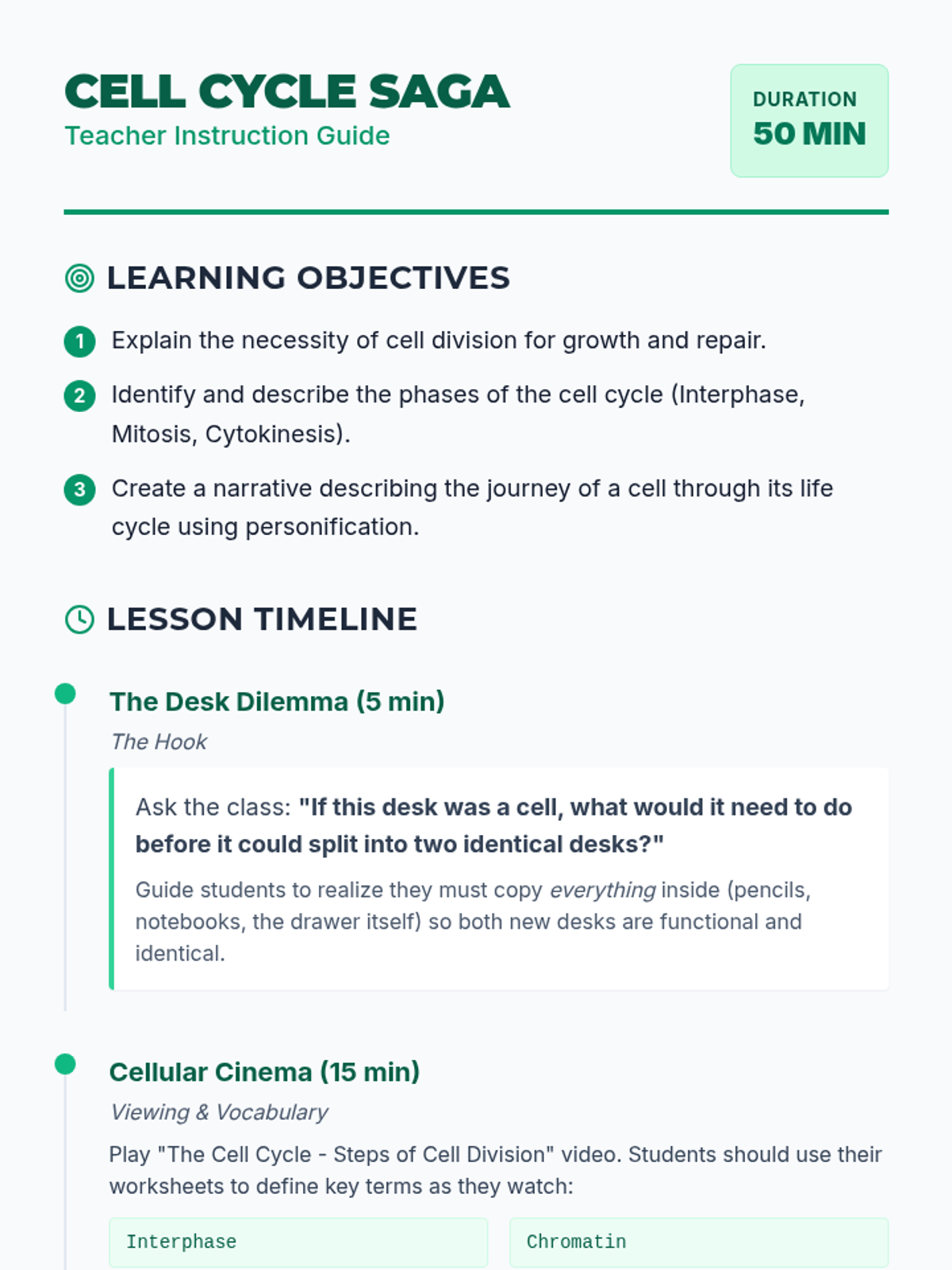 A creative biology lesson where students learn about the cell cycle through the perspective of a cell, culminating in a three-part narrative writing assignment.