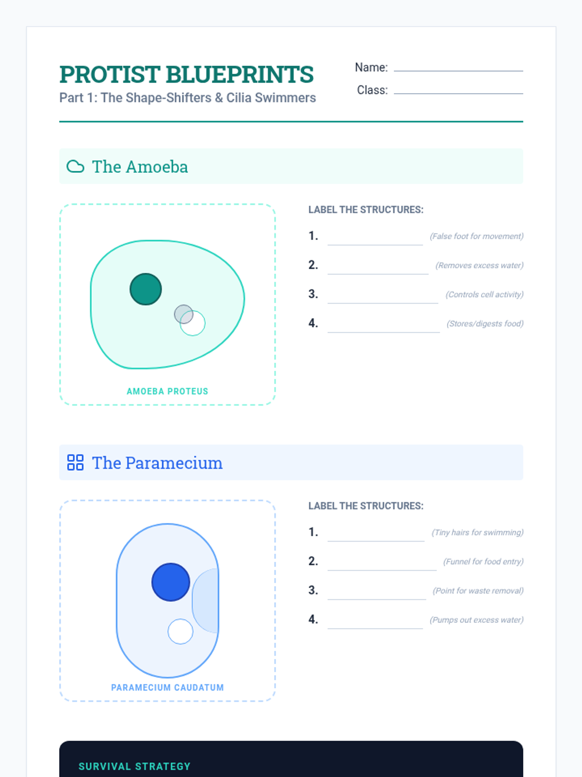 Investigate the structures and survival strategies of the Amoeba and Paramecium, focusing on movement and food acquisition.