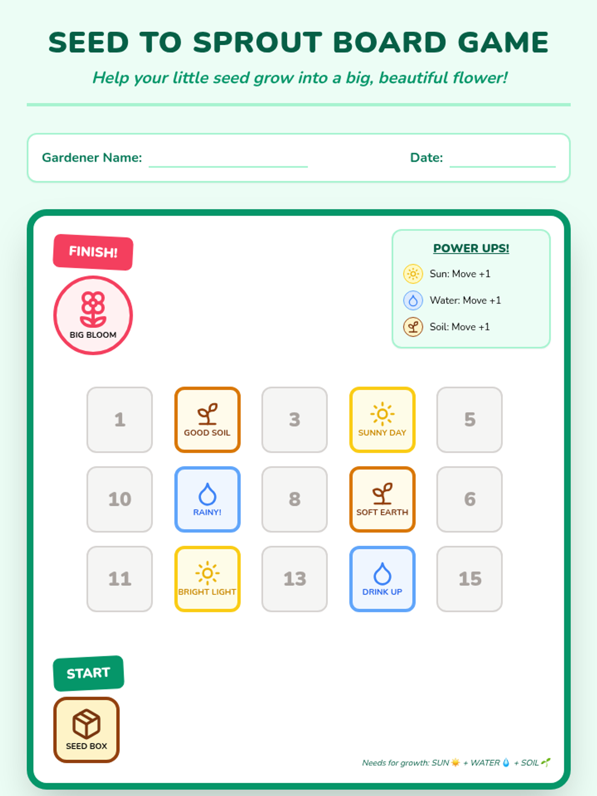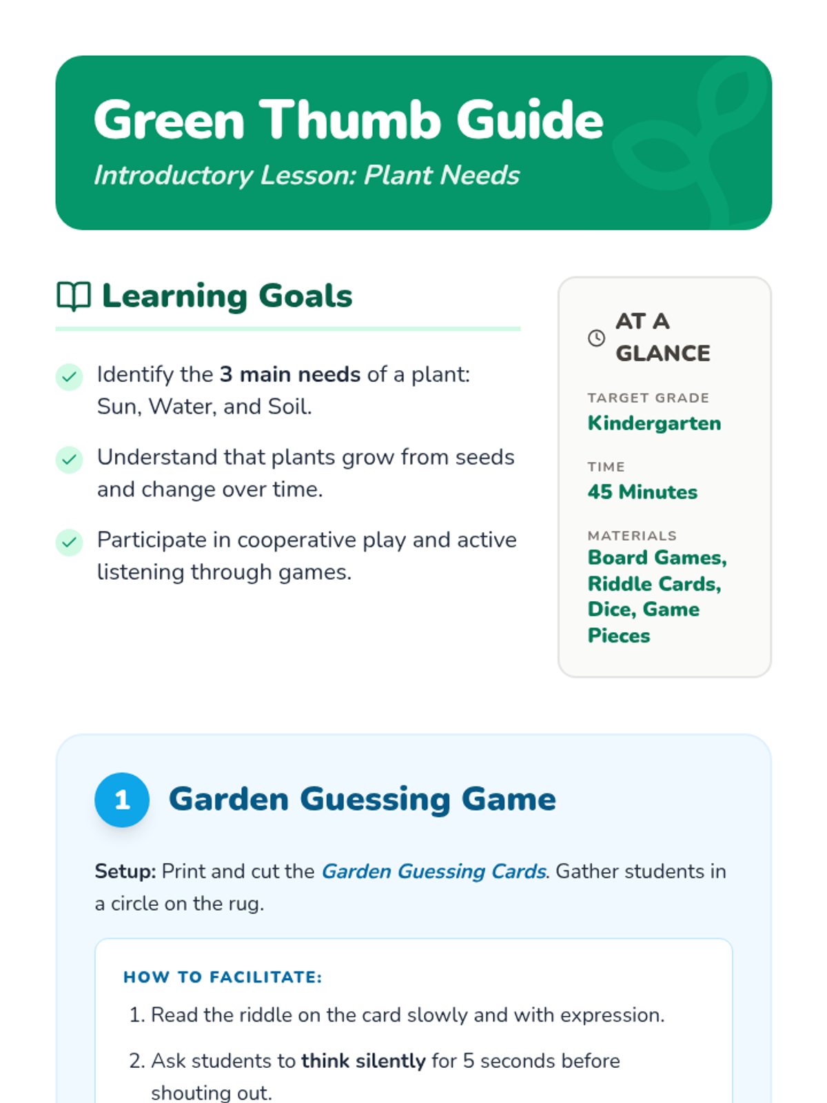 An introductory lesson for kindergarten students to learn about the basic needs of plants (sun, water, soil) through interactive play.