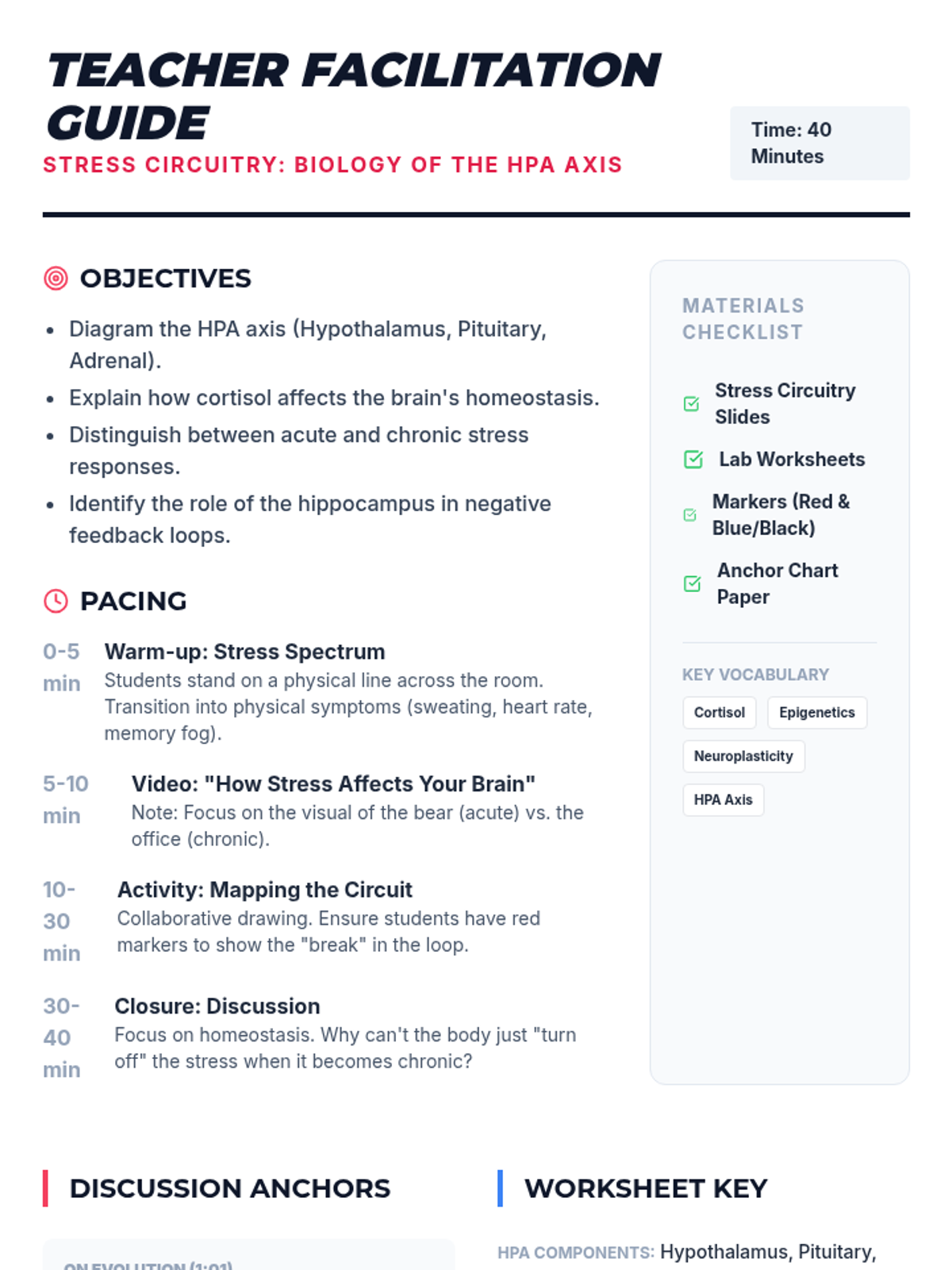 A high school biology lesson exploring the endocrine system's stress response via the HPA axis, the physiological role of cortisol, and the impact of chronic stress on brain structure and homeostasis. Students analyze feedback loops and the brain's neuroplasticity through video analysis and diagramming.
