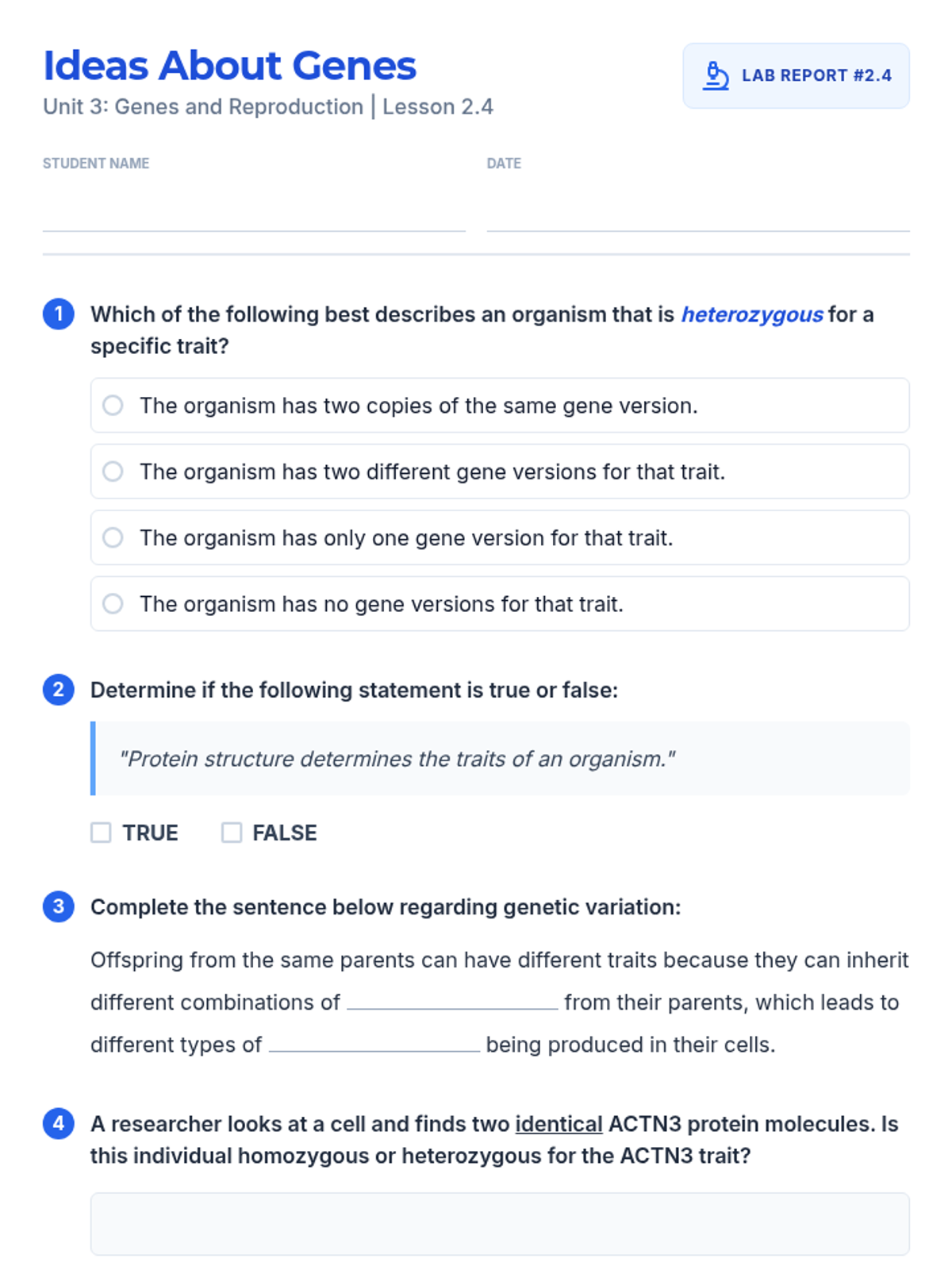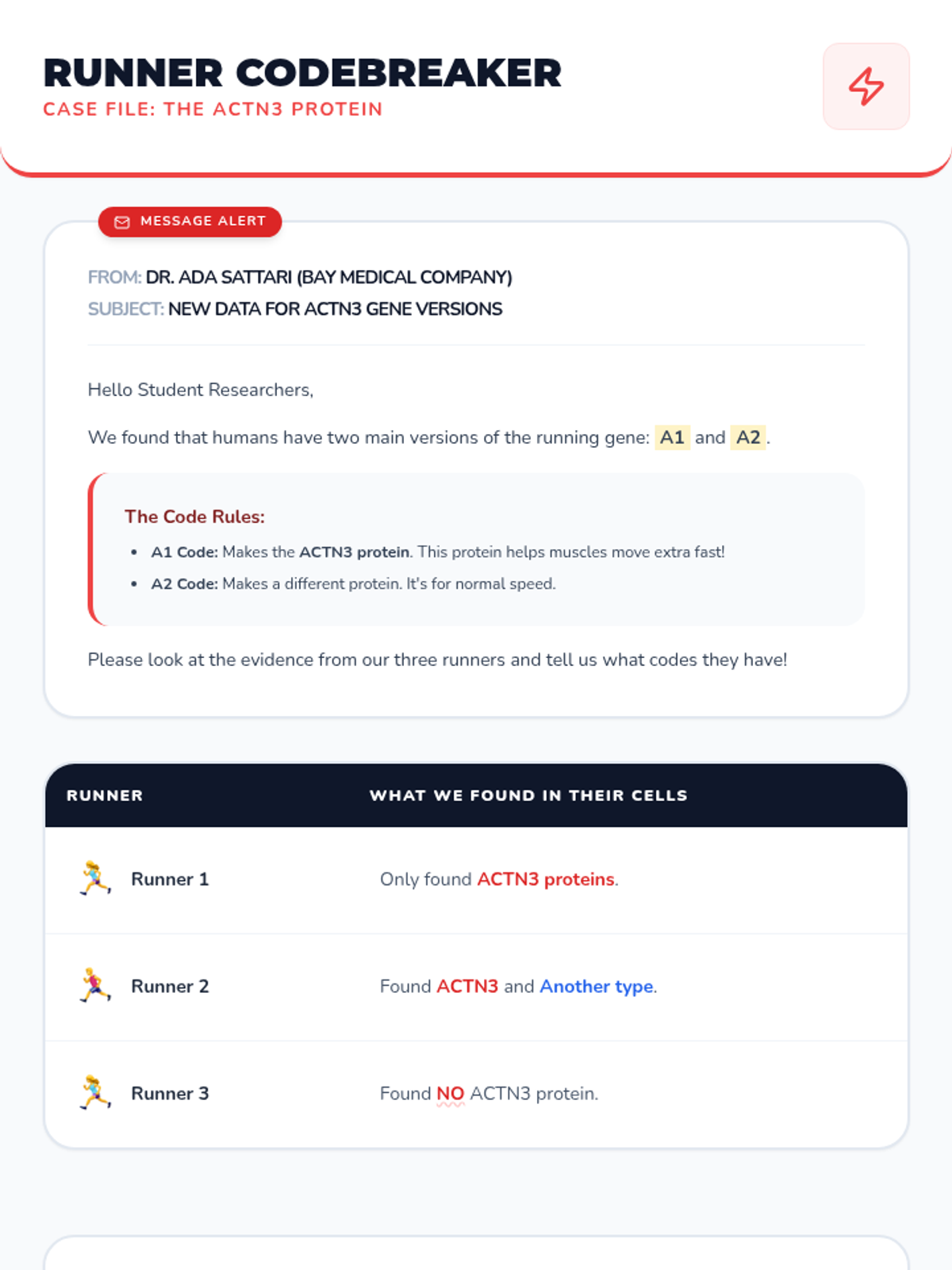 Students explore the relationship between gene versions, proteins, and physical traits, focusing on heterozygous and homozygous genotypes using the context of muscle proteins in runners.