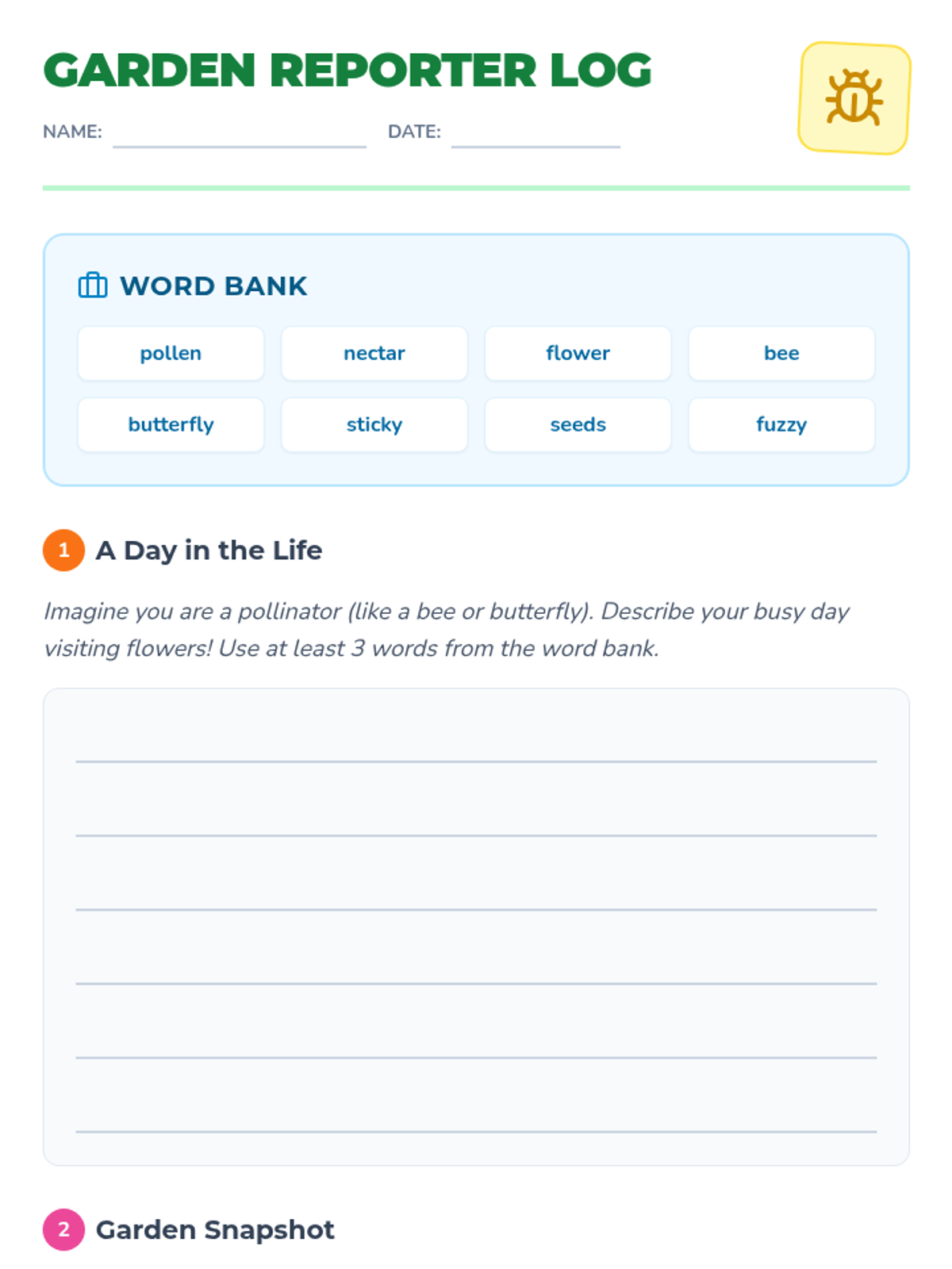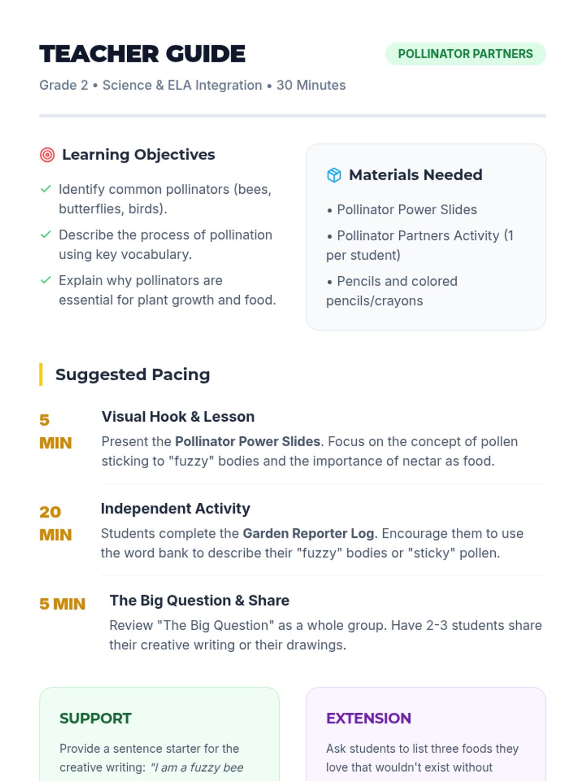 A 30-minute independent writing lesson for 2nd graders to explore the role of pollinators in our ecosystem, featuring a word bank and descriptive writing prompts.
